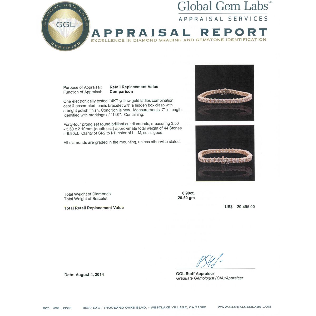 One electronically tested 14KT yellow gold ladies combination cast & assembled tennis bracelet with a hidden box clasp with a bright polish finish. Condition is new. Measurements: 7" in length. Identified with markings of "14K". Containing: Forty-Four prong set round brilliant cut diamonds, measuring 3.50 - 3.50 x 2.10mm (depth est.) approximate. Total Weight of 44 Stones = 6.90ct. Clarity: SI-2 to I-1. Color: L - M, Cut is Good. All diamonds are graded in the mounting, unless otherwise stated. Total Weight of Diamonds 6.90ct. Total Weight of Bracelet 20.50 grams. GGL Appraised at $20,495.00.