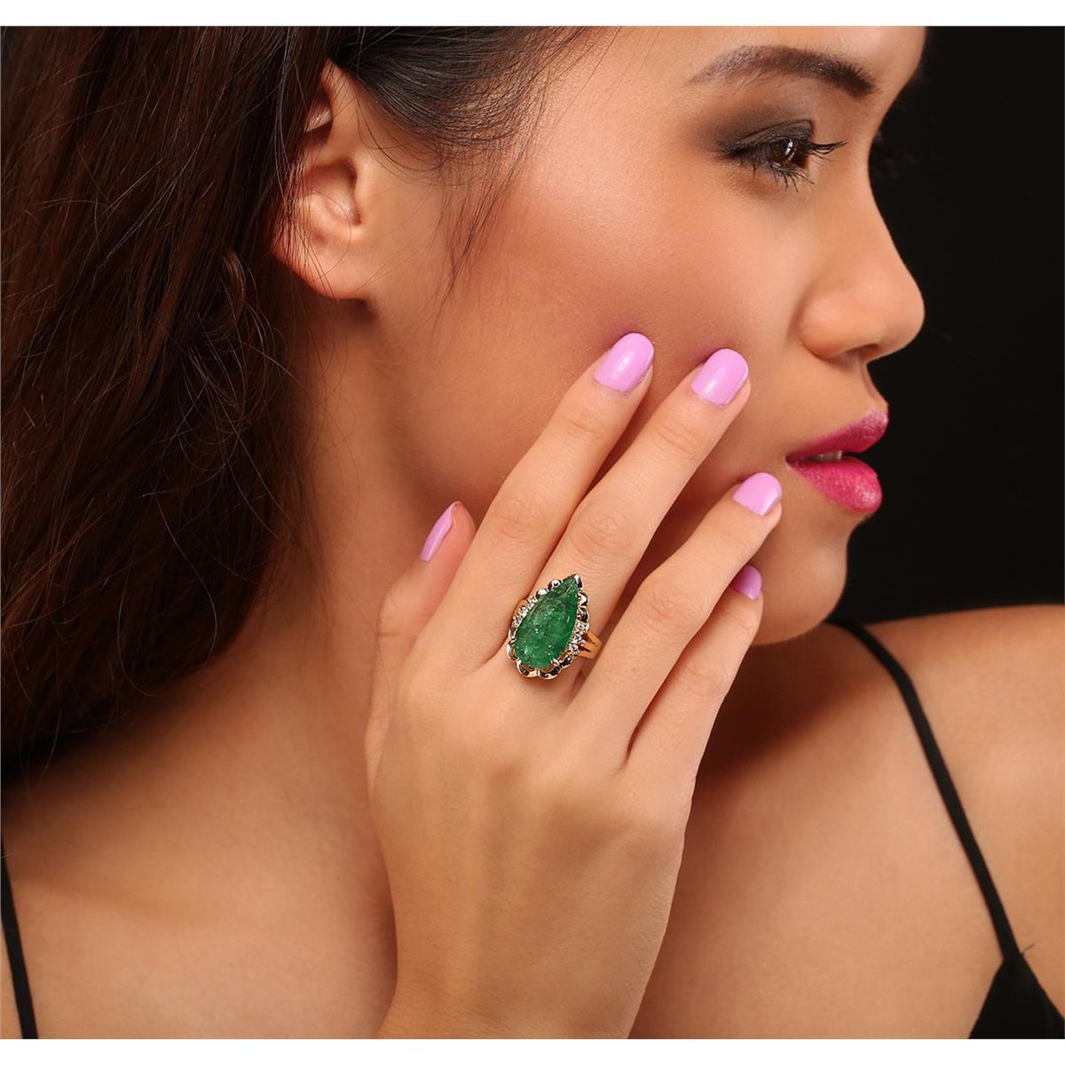 One electronically tested 14KT Yellow Gold ladies cast emerald and diamond ring with a bright polish finish. Condition is Good. The featured emerald is set within a floral Yellow Gold and diamond bezel, supported by three way split shoulders and completed by a four millimeter wide band. Identified with markings of "14K". Containing: One prong set pear mixed cut natural emerald, measuring 20.60 x 10.60 x 4.60mm, 8%. bulge factor, approximate weight of 6.93ct., clarity is heavily included, type III, medium dark, very slightly grayish, very slightly bluish green color, (GIA vslbG 6/3), cut is Good. Transmitting light with a minimum of distortion, transparent to translucent. Naturally occurring internal & external characteristics are present. Indications of oil residue. Colored Stone Grading Report attached. Graded in the setting. Six prong set round brilliant cut diamonds, measuring 2.20 - 2.00 x 1.26mm (depth est.) approximate total weight of 6 Stones = 0.26ct. Graded in the setting. Clarity: SI-1 to I-1. Color: H - I. Total Weight of Colored Stones 6.93ct. Total Weight of Diamonds 0.26ct. Total Weight of Ring 8.30 grams. AIG Appraised at $12,330.00.