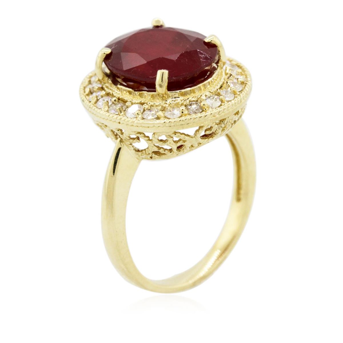 One electronically tested 14KT yellow gold ladies cast ruby and diamond ring. Condition is new, good workmanship. The featured ruby is set within a diamond bezel, completed by a two millimeter wide band. Bright polish finish with rope detailing. Identified with markings of "K14". Containing: One prong set oval mixed cut natural ruby, measuring 12.20 x 9.95 x 6.55mm, 8%. bulge factor, approximate weight of 6.94ct., clarity is heavily included, type II, dark, very slightly brownish, red color, (GIA R 7/3), cut is good. Transmitting light somewhat diffusely, transparent to translucent. Naturally occurring internal & external characteristics are present. Indications of laboratory high temperature heat treatment, with glass & flux additives. Graded in the setting. Ruby has a low tolerance to rhodium plating, repolishing the surface, & ultrasonic cleaning. Twenty prong set round brilliant cut diamonds, measuring 1.90 - 1.80 x 1.11mm (depth est.) approximate. Total Weight of 20 Stones = 0.56ct. Graded in the setting. Clarity: I-1 to I-2. Color: G - I. Total Weight of Colored Stones 6.94ct. Total Weight of Diamonds 0.56ct. Total Weight of Ring 7.29gm. AIG Appraised at $3,790.00.