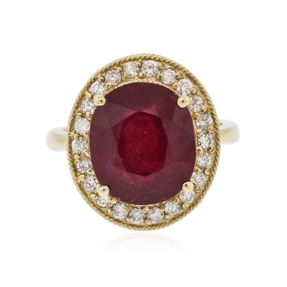 One electronically tested 14KT yellow gold ladies combination cast & assembled ring with a bright polish finish. Condition is new. Identified with markings of "K14". Containing: One prong set oval modified brilliant cut natural ruby, measuring 12.63 x 10.89 x 6.30mm, approximate weight of 6.97ct., clarity is heavily included, type II, medium dark, moderately strong, strongly purplish red color, (GIA stpR 6/4), cut is good. Twenty-Two prong set round brilliant cut diamonds, measuring 1.50 - 1.50 x 0.90mm (depth est.) approximate. Total Weight of 22 Stones = 0.27ct. Clarity: SI-2 to I-2. Color: I - J, Cut is Good. Colored gemstones are presumed to have been subjected to commonly used enhancement processes. All diamonds and colored gemstones are graded in the mounting, unless otherwise stated. Total Weight of Colored Stones 6.97ct. Total Weight of Diamonds 0.27ct. Total Weight of Ring 7.50 grams. GGL Appraised at $6,030.00.