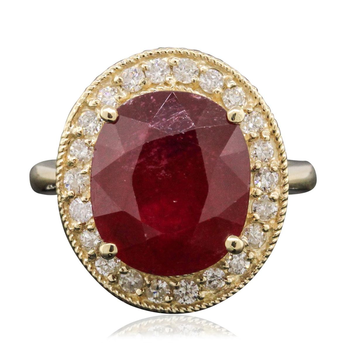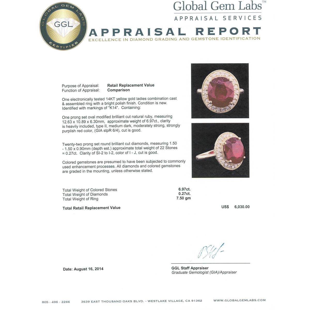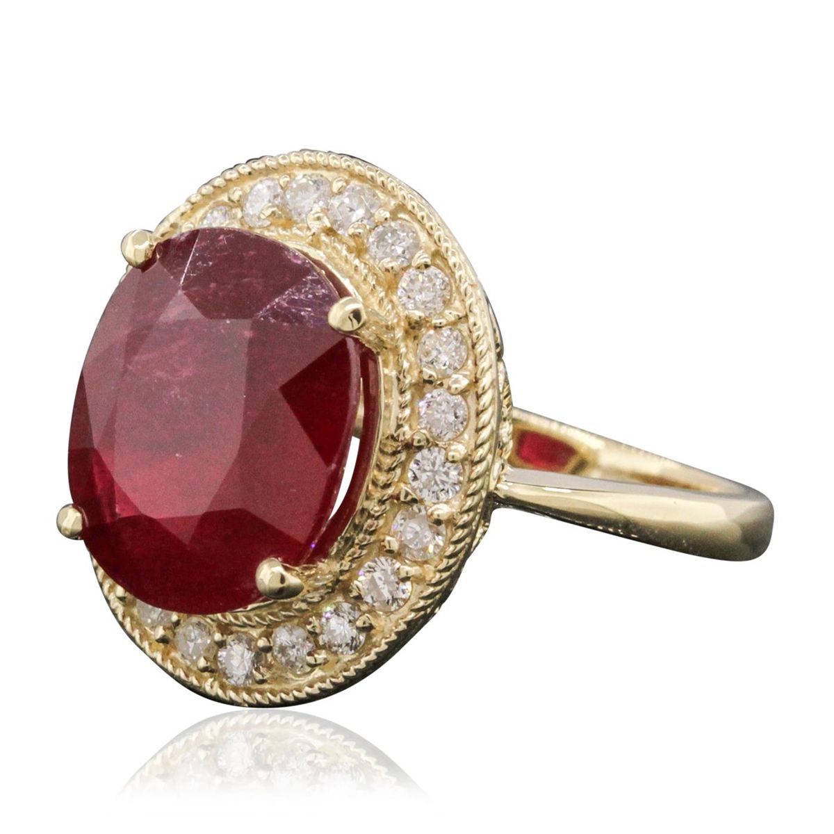 One electronically tested 14KT yellow gold ladies combination cast & assembled ring with a bright polish finish. Condition is new. Identified with markings of "K14". Containing: One prong set oval modified brilliant cut natural ruby, measuring 12.63 x 10.89 x 6.30mm, approximate weight of 6.97ct., clarity is heavily included, type II, medium dark, moderately strong, strongly purplish red color, (GIA stpR 6/4), cut is good. Twenty-Two prong set round brilliant cut diamonds, measuring 1.50 - 1.50 x 0.90mm (depth est.) approximate. Total Weight of 22 Stones = 0.27ct. Clarity: SI-2 to I-2. Color: I - J, Cut is Good. Colored gemstones are presumed to have been subjected to commonly used enhancement processes. All diamonds and colored gemstones are graded in the mounting, unless otherwise stated. Total Weight of Colored Stones 6.97ct. Total Weight of Diamonds 0.27ct. Total Weight of Ring 7.50 grams. GGL Appraised at $6,030.00.