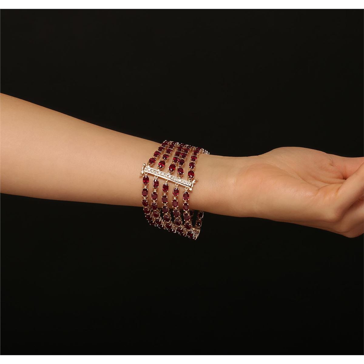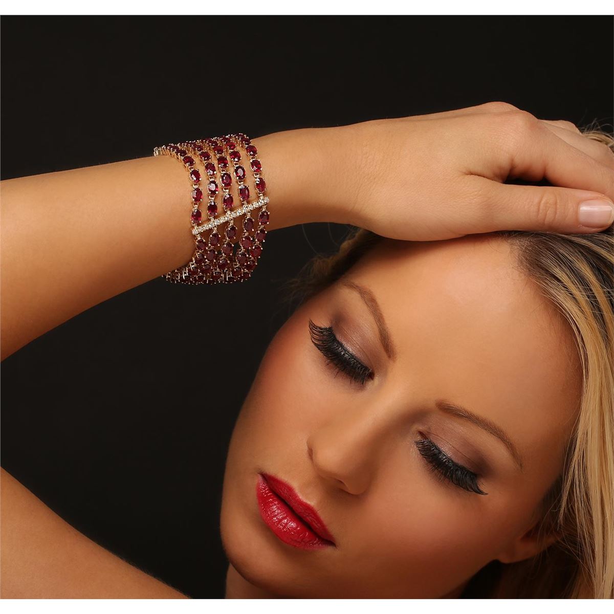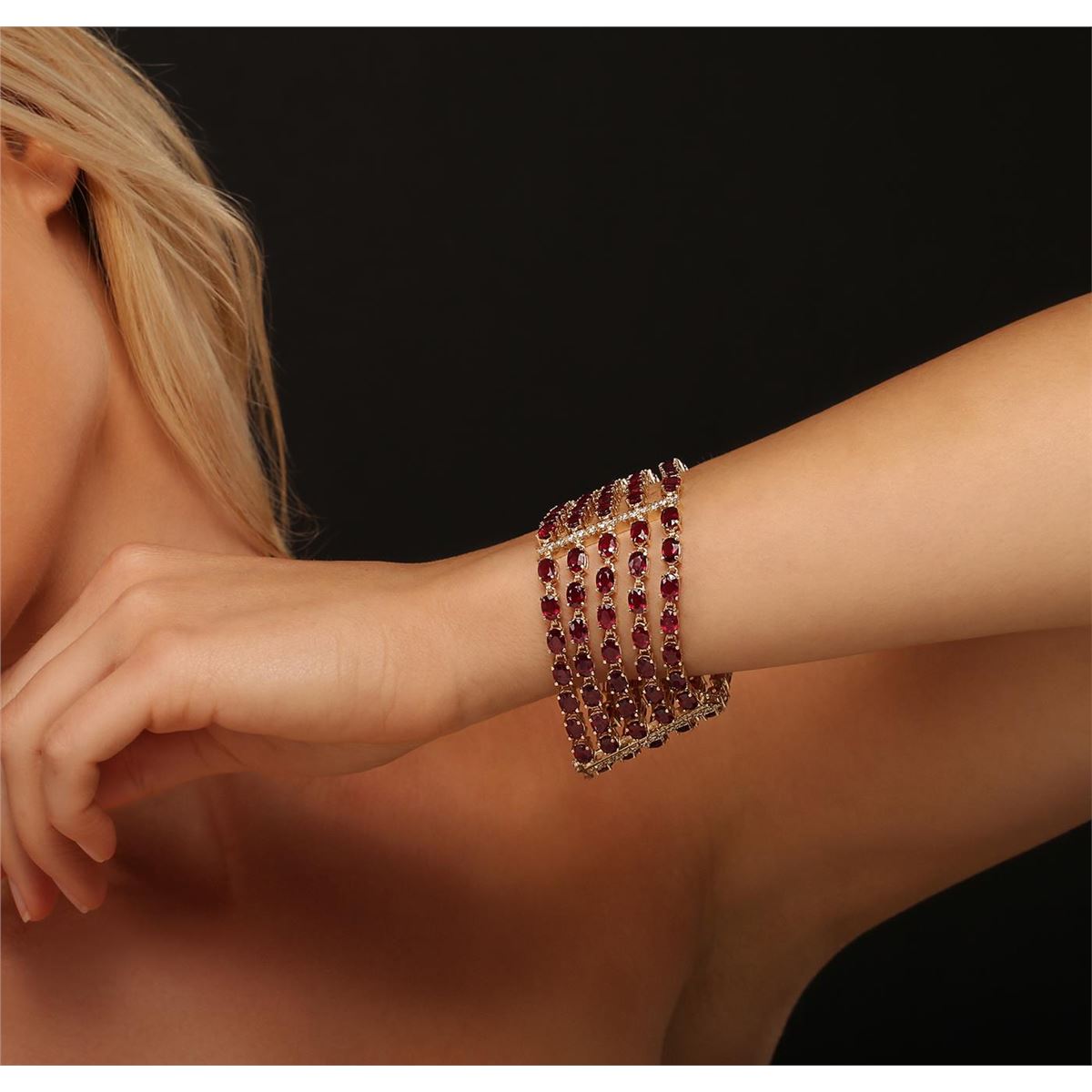 One electronically tested 14KT yellow gold Ladies combination cast & assembled bracelet with a safety clasp with a bright polish finish. Condition is new. Measurements: 7" in length. Identified with markings of "14K". Containing: One hundred five prong set oval modified brilliant cut natural rubies, measuring 6.00 x 4.10 x 2.85mm, approximate. Total Weight of 60.90ct., clarity is heavily included, type II, medium, moderately strong, strongly purplish red color, (GIA stpR 5/4), cut is good. Forty-One prong set round brilliant cut diamonds, measuring 1.90 - 1.90 x 1.14mm (depth est.) approximate. Total Weight of 41 Stones = 1.03ct. Clarity: I-1 to I-2. Color: H - J, Cut is Good. Colored gemstones are presumed to have been subjected to commonly used enhancement processes. All diamonds and colored gemstones are graded in the mounting, unless otherwise stated. Total Weight of Colored Stones 60.90ct. Total Weight of Diamonds 1.03ct. Total Weight of Bracelet 53.30 grams. GGL Appraised at $38,235.00.