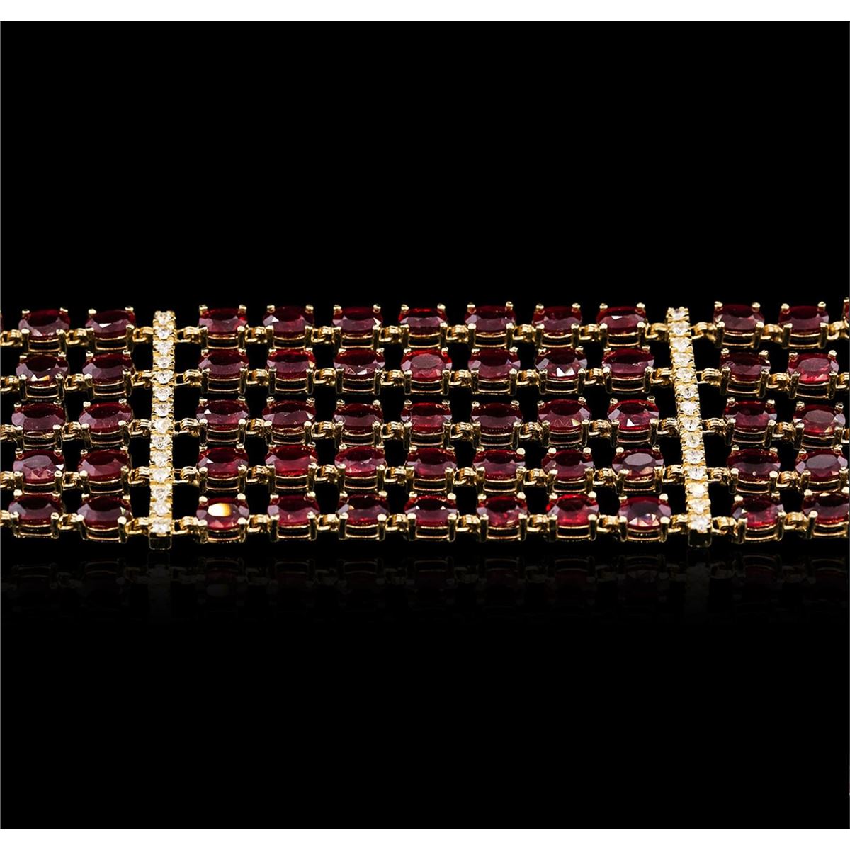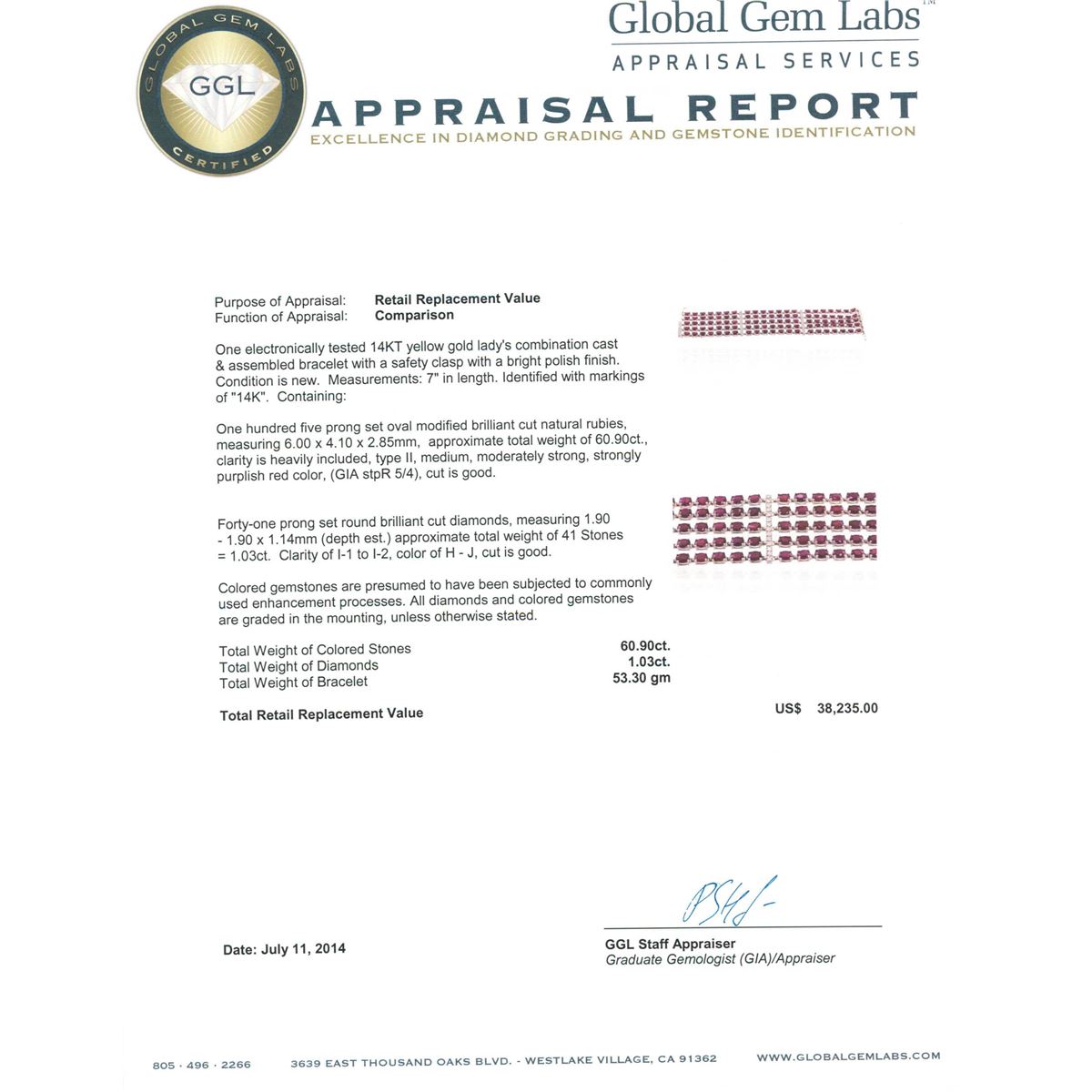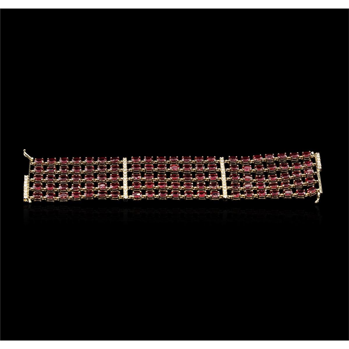 One electronically tested 14KT yellow gold Ladies combination cast & assembled bracelet with a safety clasp with a bright polish finish. Condition is new. Measurements: 7" in length. Identified with markings of "14K". Containing: One hundred five prong set oval modified brilliant cut natural rubies, measuring 6.00 x 4.10 x 2.85mm, approximate. Total Weight of 60.90ct., clarity is heavily included, type II, medium, moderately strong, strongly purplish red color, (GIA stpR 5/4), cut is good. Forty-One prong set round brilliant cut diamonds, measuring 1.90 - 1.90 x 1.14mm (depth est.) approximate. Total Weight of 41 Stones = 1.03ct. Clarity: I-1 to I-2. Color: H - J, Cut is Good. Colored gemstones are presumed to have been subjected to commonly used enhancement processes. All diamonds and colored gemstones are graded in the mounting, unless otherwise stated. Total Weight of Colored Stones 60.90ct. Total Weight of Diamonds 1.03ct. Total Weight of Bracelet 53.30 grams. GGL Appraised at $38,235.00.
