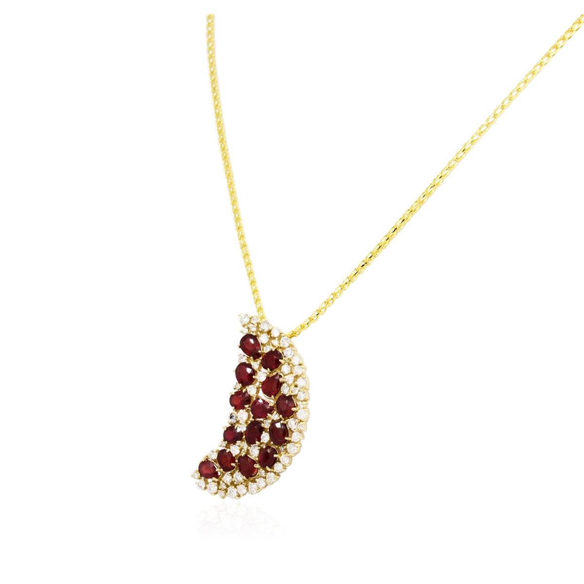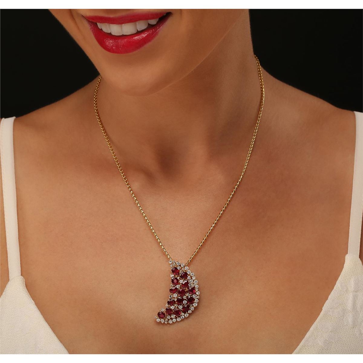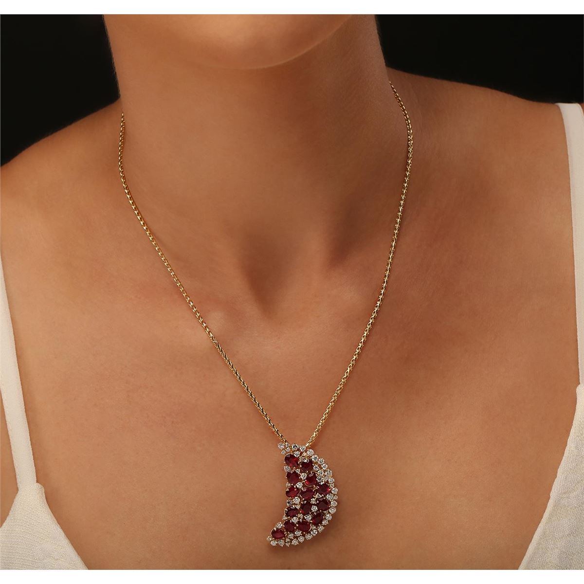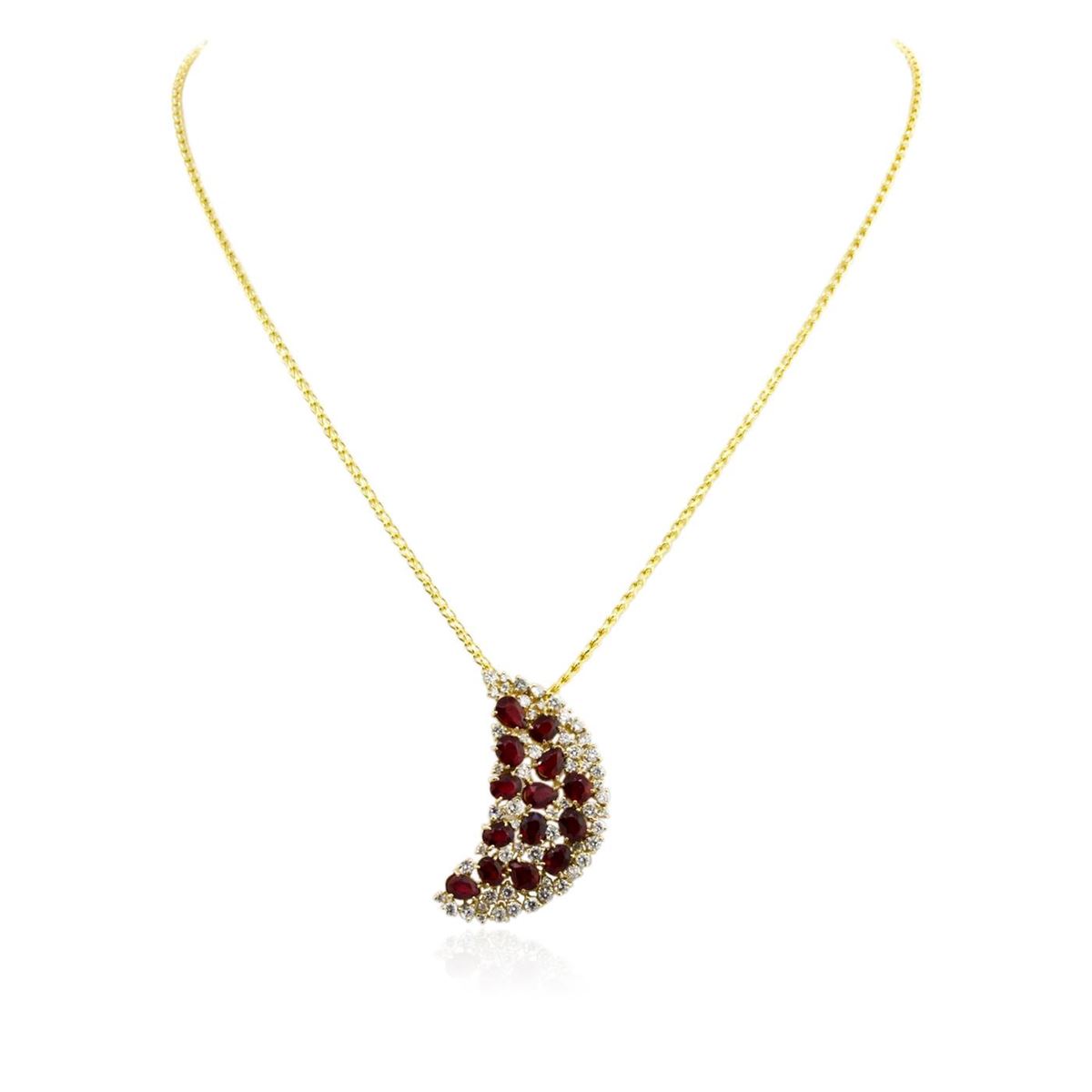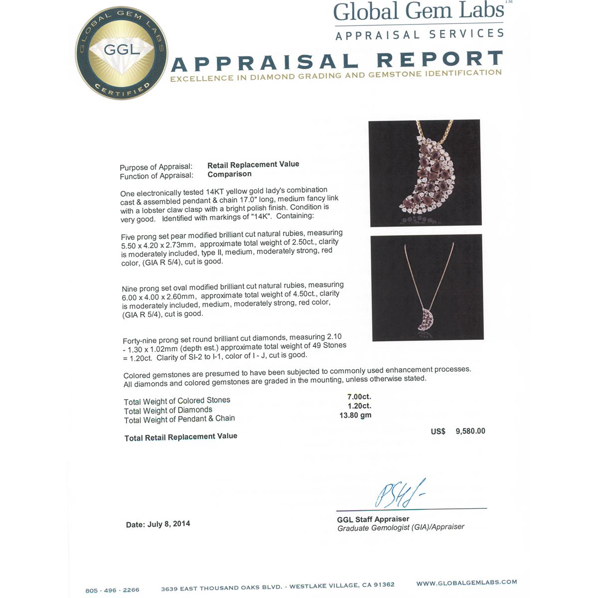 One electronically tested 14KT yellow gold Ladies combination cast & assembled pendant & chain 17.0" long, medium fancy link with a lobster claw clasp with a bright polish finish. Condition is very good. Identified with markings of "14K". Containing: Five prong set pear modified brilliant cut natural rubies, measuring 5.50 x 4.20 x 2.73mm, approximate. Total Weight of 2.50ct., clarity is moderately included, type II, medium, moderately strong, red color, (GIA R 5/4), cut is good. Nine prong set oval modified brilliant cut natural rubies, measuring 6.00 x 4.00 x 2.60mm, approximate. Total Weight of 4.50ct., clarity is moderately included, medium, moderately strong, red color, (GIA R 5/4), cut is good. Forty-Nine prong set round brilliant cut diamonds, measuring 2.10 - 1.30 x 1.02mm (depth est.) approximate. Total Weight of 49 Stones = 1.20ct. Clarity: SI-2 to I-1. Color: I - J, Cut is Good. Colored gemstones are presumed to have been subjected to commonly used enhancement processes. All diamonds and colored gemstones are graded in the mounting, unless otherwise stated. Total Weight of Colored Stones 7.00ct. Total Weight of Diamonds 1.20ct. Total Weight of Pendant & Chain 13.80 grams. GGL Appraised at $9,580.00.
