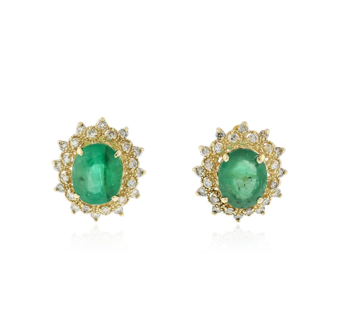 One pair electronically tested 14KT yellow gold ladies cast emerald and diamond earrings with friction posts with a bright polish finish. Identified with markings of "14K". Condition is new. Containing: Two prong set oval modified brilliant cut natural emeralds, measuring 11.20 x 9.20 x 5.98mm, approximate total weight of 7.04ct., clarity is heavily included, type III, medium, moderately strong, green color, (GIA G 5/4), cut is good. Twenty-Four prong set round brilliant cut diamonds, measuring 1.50 - 1.30 x 0.84mm (depth est.) approximate total weight of 24 Stones = 0.24ct. Clarity: SI-2 to I-1. Color: K - L, Cut is Good. Diamonds and colored gemstones are graded in the mounting, unless otherwise stated. Colored gemstones are presumed to have been subjected to commonly used enhancement processes. Total Weight of Colored Stones 7.04ct. Total Weight of Diamonds 0.24ct. Total Weight of Earrings 7.00 grams. GGL Appraised at $4,560.00.