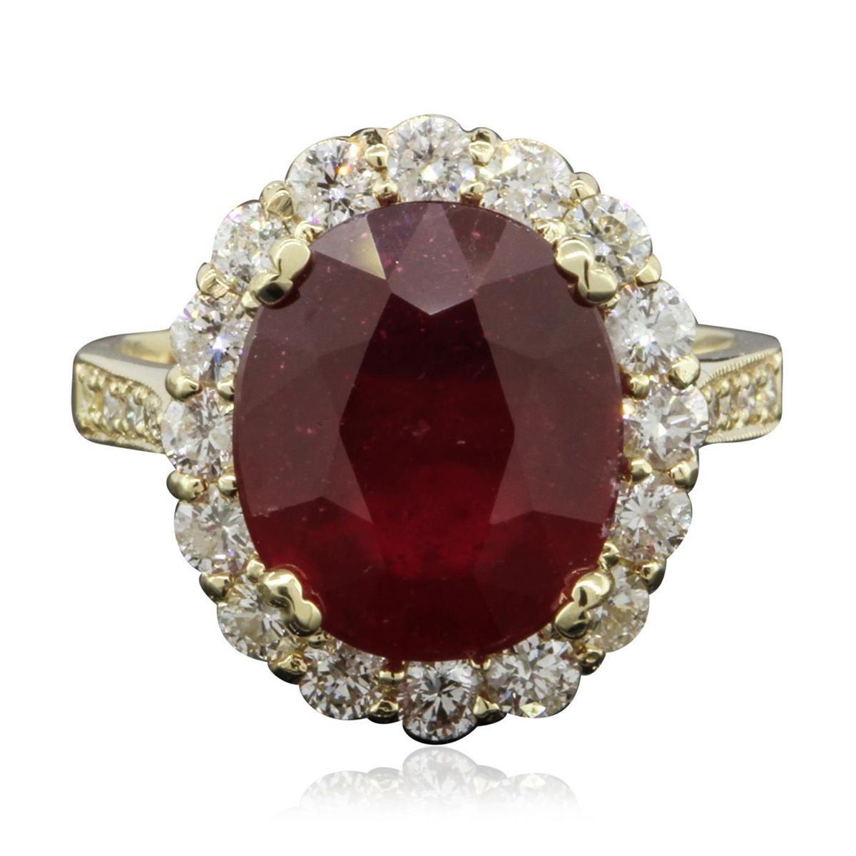 One electronically tested 14KT yellow gold ladies cast ruby & diamond ring. Condition is new, good workmanship. The featured ruby is set within a diamond bezel supported by diamond set shoulders and completed by a three millimeter wide band. Bright polish finish with milgrain detailing. Identified with markings of "K14". Containing: One prong set oval mixed cut natural ruby, measuring 12.30 x 10.30 x 6.30mm, 12% bulge factor, approximate weight of 7.21ct. with a medium Red fluorescence, clarity is moderately included, type II, medium dark, moderately strong, slightly purplish red color, (GIA slpR 6/4), cut is good. Transmitting light somewhat diffusely, transparent to translucent. Naturally occurring internal & external characteristics are present. Indications of laboratory high temperature heat treatment, with glass & flux additives. Colored Stone Grading Report attached. Graded in the setting. Ruby has a low tolerance to rhodium plating, repolishing the surface, & ultrasonic cleaning. Sixteen prong set round brilliant cut diamonds, measuring 2.50 - 2.40 x 1.49mm (depth est.) approximate. Total Weight of 16 Stones = 0.97ct. Graded in the setting. Clarity: SI-2 to I-1. Color: G - I Ten prong set round brilliant cut diamonds, measuring 1.50 - 1.10 x 0.79mm (depth est.) approximate. Total Weight of 10 Stones = 0.18ct. Graded in the setting. Clarity: SI-2 to I-1. Color: G - I. Total Weight of Colored Stones 7.21ct. Total Weight of Diamonds 1.15ct. Total Weight of Ring 6.92 grams. AIG Appraised at $6,185.00.