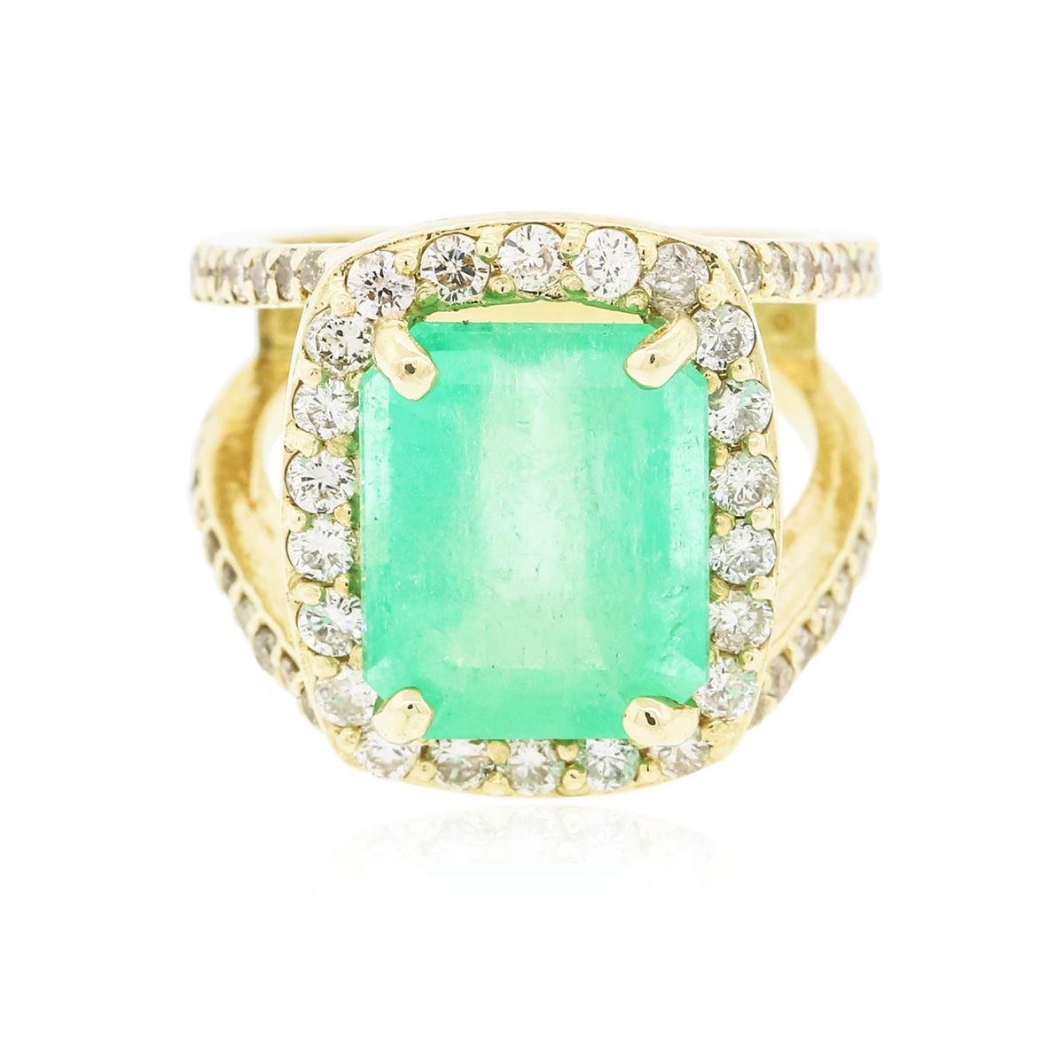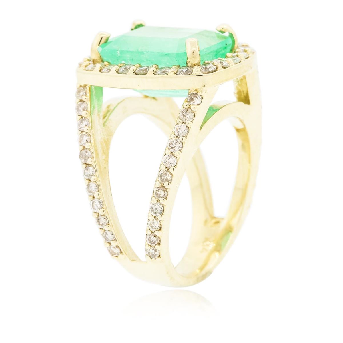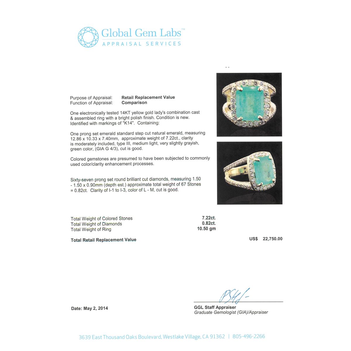 One electronically tested 14KT yellow gold Ladies combination cast & assembled ring with a bright polish finish. Condition is new. Identified with markings of "K14". Containing: One prong set emerald standard step cut natural emerald, measuring 12.86 x 10.33 x 7.40mm, approximate weight of 7.22ct., clarity is moderately included, type III, medium light, very slightly grayish, green color, (GIA G 4/3), cut is good. Colored gemstones are presumed to have been subjected to commonly used color/clarity enhancement processes. Sixty-Seven prong set round brilliant cut diamonds, measuring 1.50 - 1.50 x 0.90mm (depth est.) approximate. Total Weight of 67 Stones = 0.82ct. Clarity: I-1 to I-3. Color: L - M, Cut is Good. Total Weight of Colored Stones 7.22ct. Total Weight of Diamonds 0.82ct. Total Weight of Ring 10.50 grams. GGL Appraised at $22,750.00.