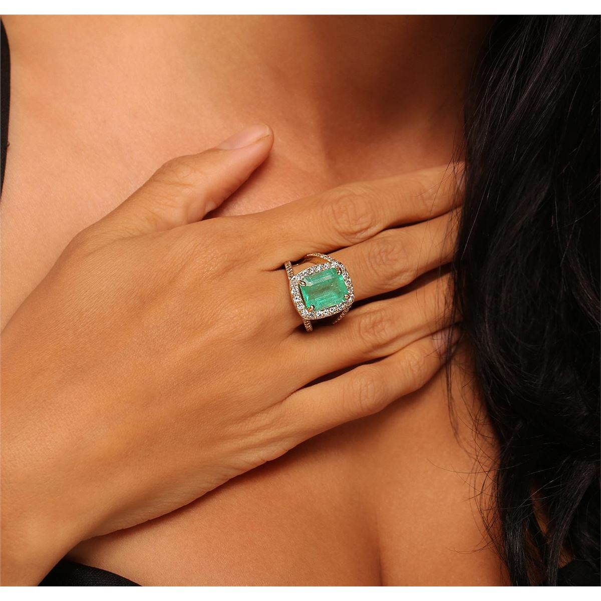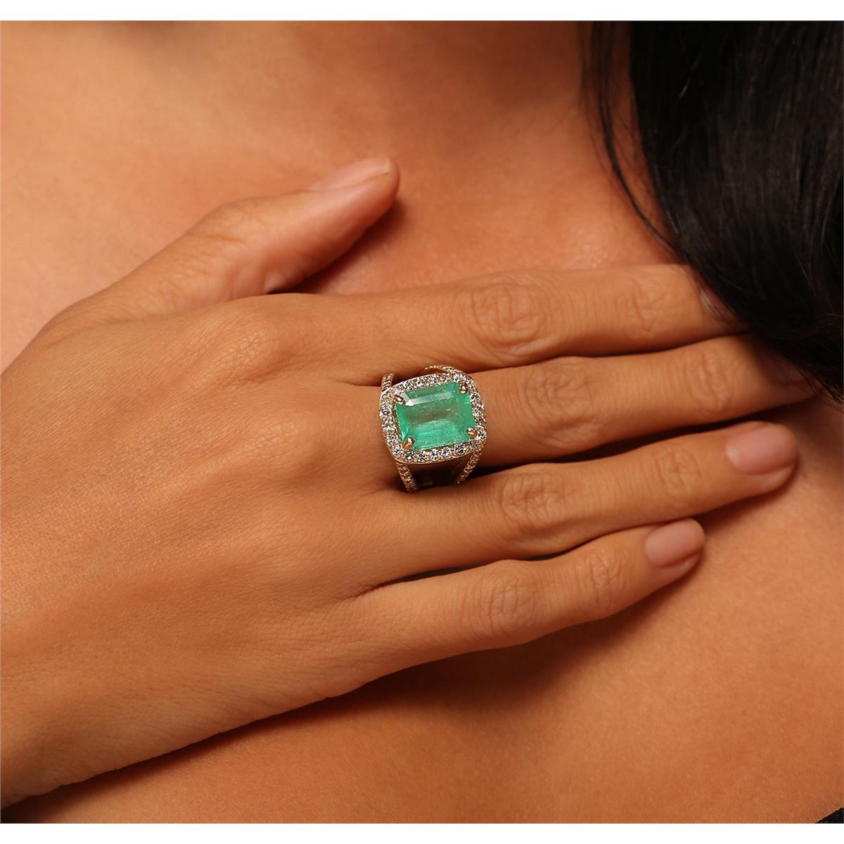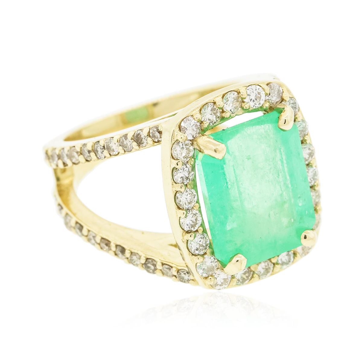 One electronically tested 14KT yellow gold Ladies combination cast & assembled ring with a bright polish finish. Condition is new. Identified with markings of "K14". Containing: One prong set emerald standard step cut natural emerald, measuring 12.86 x 10.33 x 7.40mm, approximate weight of 7.22ct., clarity is moderately included, type III, medium light, very slightly grayish, green color, (GIA G 4/3), cut is good. Colored gemstones are presumed to have been subjected to commonly used color/clarity enhancement processes. Sixty-Seven prong set round brilliant cut diamonds, measuring 1.50 - 1.50 x 0.90mm (depth est.) approximate. Total Weight of 67 Stones = 0.82ct. Clarity: I-1 to I-3. Color: L - M, Cut is Good. Total Weight of Colored Stones 7.22ct. Total Weight of Diamonds 0.82ct. Total Weight of Ring 10.50 grams. GGL Appraised at $22,750.00.