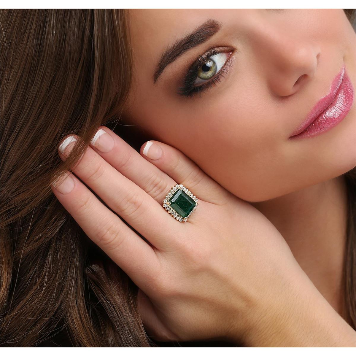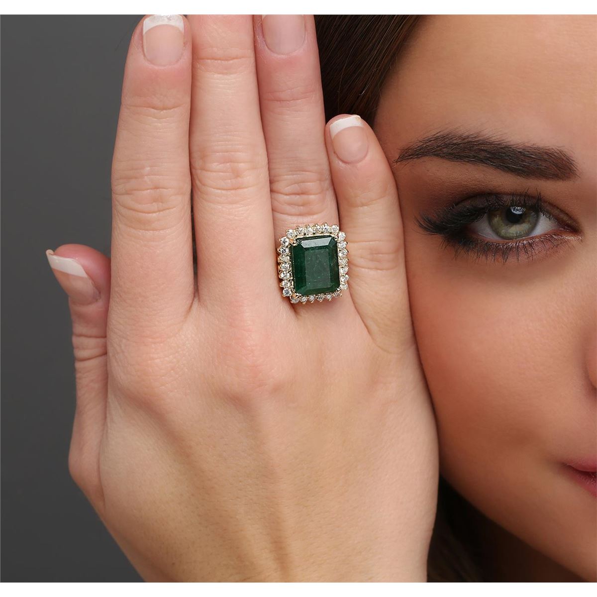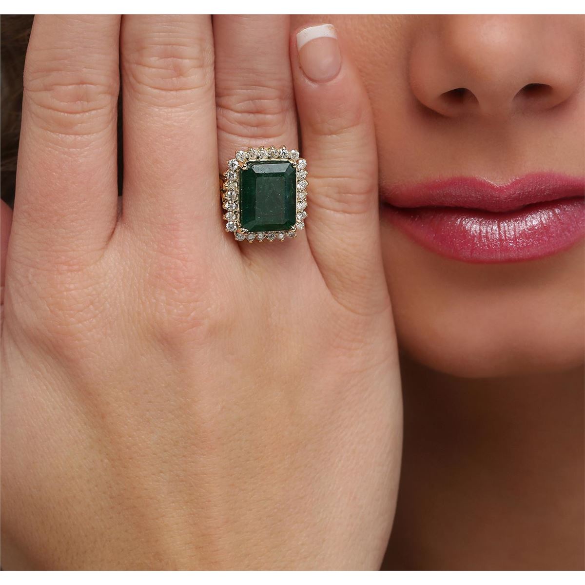 One electronically tested 14KT yellow gold ladies combination cast & assembled emerald and diamond ring with a split shoulder shank with a bright polish finish. Identified with markings of "14K". Condition is new. Containing: One prong set emerald standard step cut natural emerald, measuring 13.42 x 10.57 x 7.08mm, approximate weight of 7.38ct., clarity is heavily included, type III, medium dark, moderately strong, green color, (GIA G 6/4), cut is good. Twenty-Six prong set round brilliant cut diamonds, measuring 1.80 - 1.80 x 1.08mm (depth est.) approximate total weight of 26 Stones = 0.55ct. Clarity: I-1 to I-2. Color: L - M, Cut is Good. All diamonds and colored gemstones are graded in the mounting, unless otherwise stated. Colored gemstones are presumed to have been subjected to commonly used enhancement processes. Total Weight of Colored Stones 7.38ct. Total Weight of Diamonds 0.55ct. Total Weight of Ring 8.60 grams. GGL Appraised at $7,450.00.