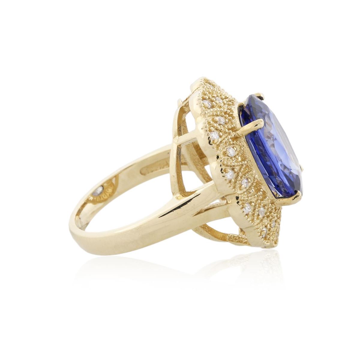 One electronically tested 14KT yellow gold Ladies combination cast & assembled ring with a high polish finish. Condition is new. Identified with markings of "K14". Containing: One prong set oval modified mixed cut natural tanzanite, measuring 13.00 x 10.00 x 6.50mm, approximate weight of 7.38ct., clarity is eye clean, type I, medium, moderately strong, bluish violet color, (GIA bV 5/4), cut is very good. Colored gemstones are presumed to have been subjected to commonly used color/clarity enhancement processes. Forty-Eight prong set round brilliant cut diamonds, measuring 1.50 - 1.20 x 0.81mm (depth est.) approximate. Total Weight of 48 Stones = 0.51ct. Clarity: I-1 to I-2. Color: I - J, Cut is Good. Total Weight of Colored Stones 7.38ct. Total Weight of Diamonds 0.51ct. Total Weight of Ring 10.10 grams. GGL Appraised at $9,560.00.