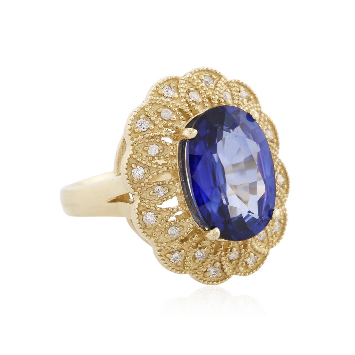 One electronically tested 14KT yellow gold Ladies combination cast & assembled ring with a high polish finish. Condition is new. Identified with markings of "K14". Containing: One prong set oval modified mixed cut natural tanzanite, measuring 13.00 x 10.00 x 6.50mm, approximate weight of 7.38ct., clarity is eye clean, type I, medium, moderately strong, bluish violet color, (GIA bV 5/4), cut is very good. Colored gemstones are presumed to have been subjected to commonly used color/clarity enhancement processes. Forty-Eight prong set round brilliant cut diamonds, measuring 1.50 - 1.20 x 0.81mm (depth est.) approximate. Total Weight of 48 Stones = 0.51ct. Clarity: I-1 to I-2. Color: I - J, Cut is Good. Total Weight of Colored Stones 7.38ct. Total Weight of Diamonds 0.51ct. Total Weight of Ring 10.10 grams. GGL Appraised at $9,560.00.