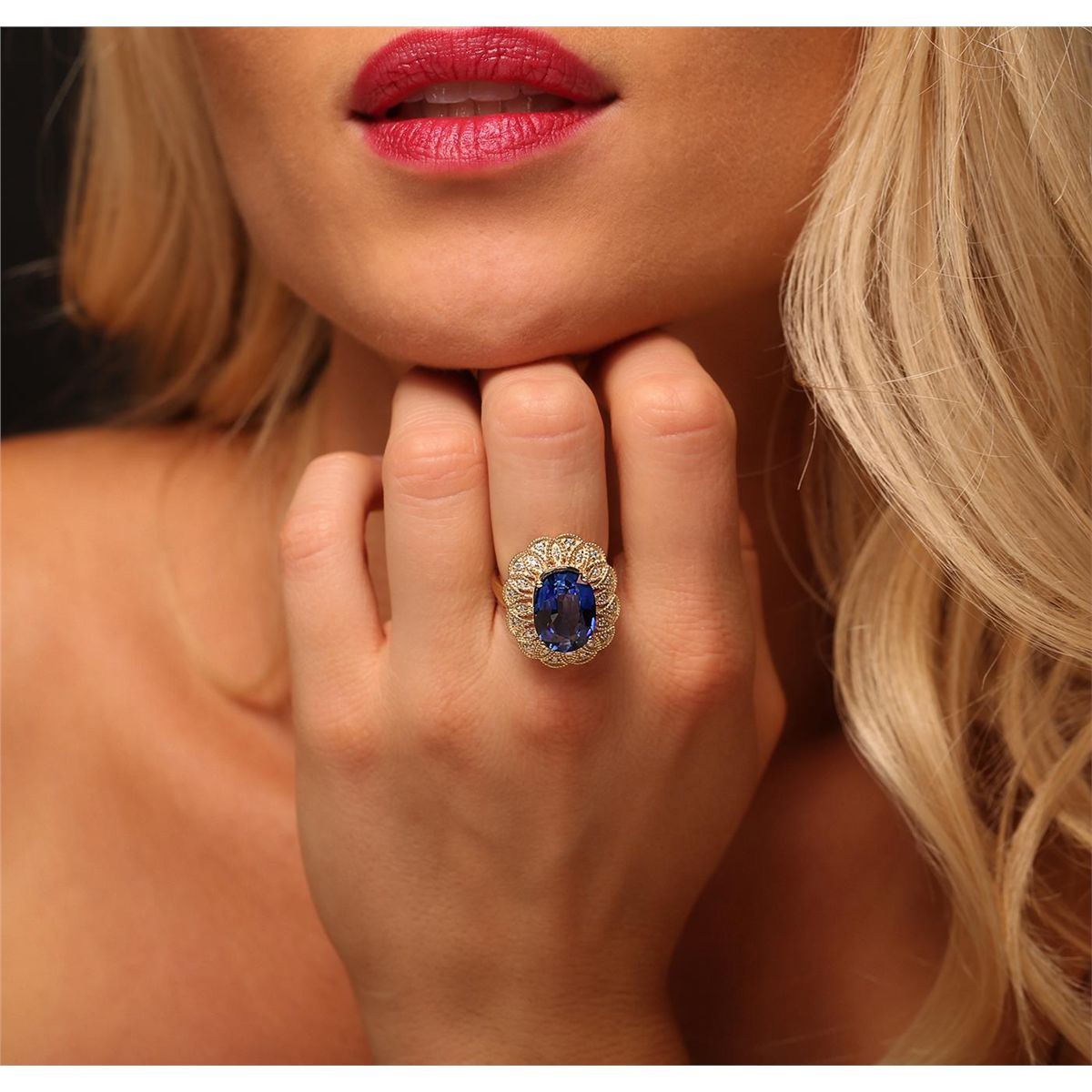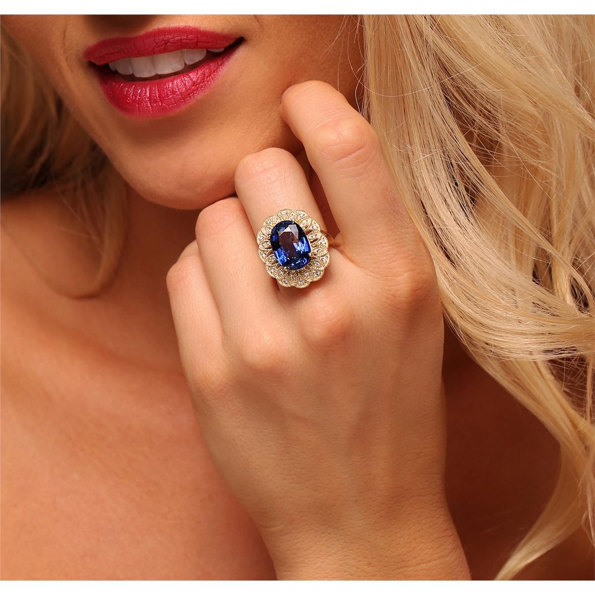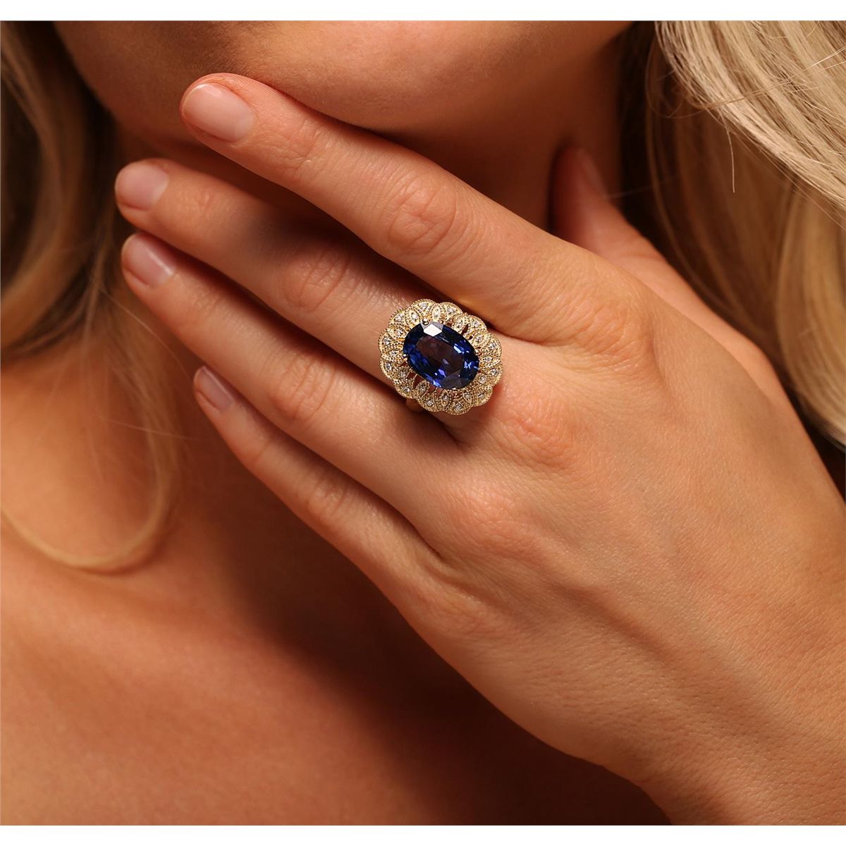 One electronically tested 14KT yellow gold Ladies combination cast & assembled ring with a high polish finish. Condition is new. Identified with markings of "K14". Containing: One prong set oval modified mixed cut natural tanzanite, measuring 13.00 x 10.00 x 6.50mm, approximate weight of 7.38ct., clarity is eye clean, type I, medium, moderately strong, bluish violet color, (GIA bV 5/4), cut is very good. Colored gemstones are presumed to have been subjected to commonly used color/clarity enhancement processes. Forty-Eight prong set round brilliant cut diamonds, measuring 1.50 - 1.20 x 0.81mm (depth est.) approximate. Total Weight of 48 Stones = 0.51ct. Clarity: I-1 to I-2. Color: I - J, Cut is Good. Total Weight of Colored Stones 7.38ct. Total Weight of Diamonds 0.51ct. Total Weight of Ring 10.10 grams. GGL Appraised at $9,560.00.