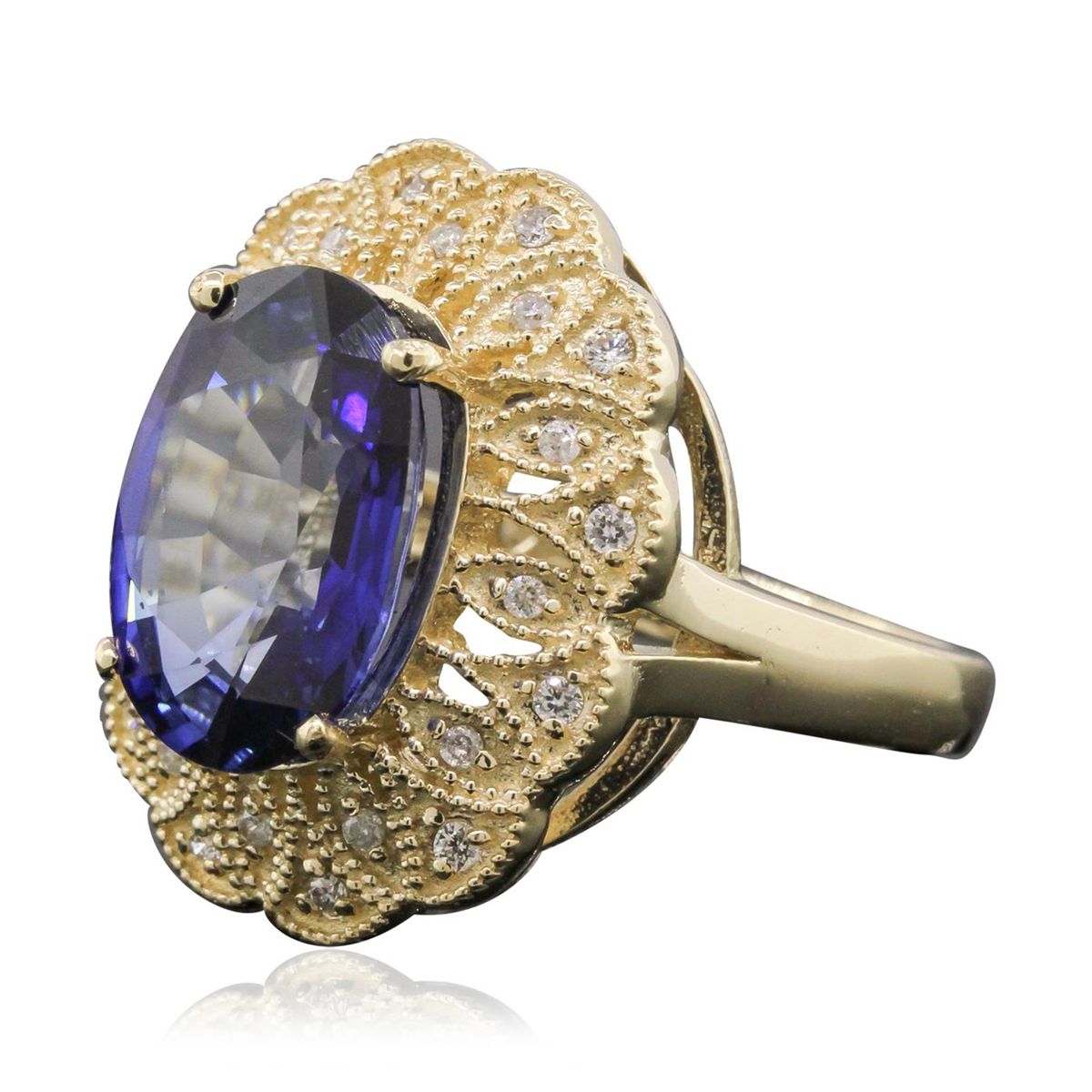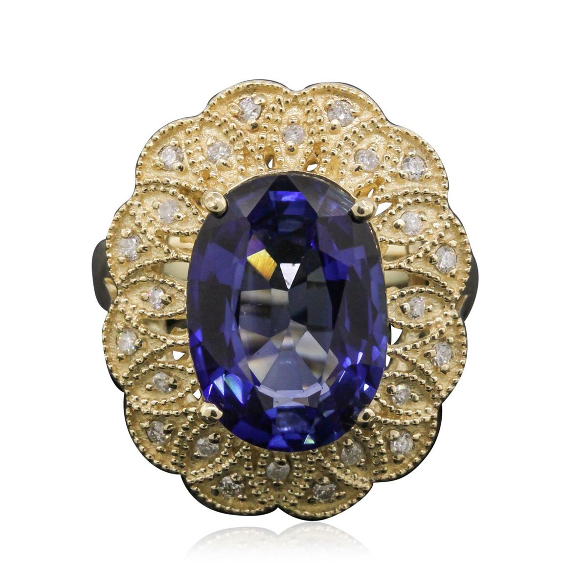 One electronically tested 14KT yellow gold Ladies combination cast & assembled ring with a high polish finish. Condition is new. Identified with markings of "K14". Containing: One prong set oval modified mixed cut natural tanzanite, measuring 13.00 x 10.00 x 6.50mm, approximate weight of 7.38ct., clarity is eye clean, type I, medium, moderately strong, bluish violet color, (GIA bV 5/4), cut is very good. Colored gemstones are presumed to have been subjected to commonly used color/clarity enhancement processes. Forty-Eight prong set round brilliant cut diamonds, measuring 1.50 - 1.20 x 0.81mm (depth est.) approximate. Total Weight of 48 Stones = 0.51ct. Clarity: I-1 to I-2. Color: I - J, Cut is Good. Total Weight of Colored Stones 7.38ct. Total Weight of Diamonds 0.51ct. Total Weight of Ring 10.10 grams. GGL Appraised at $9,560.00.
