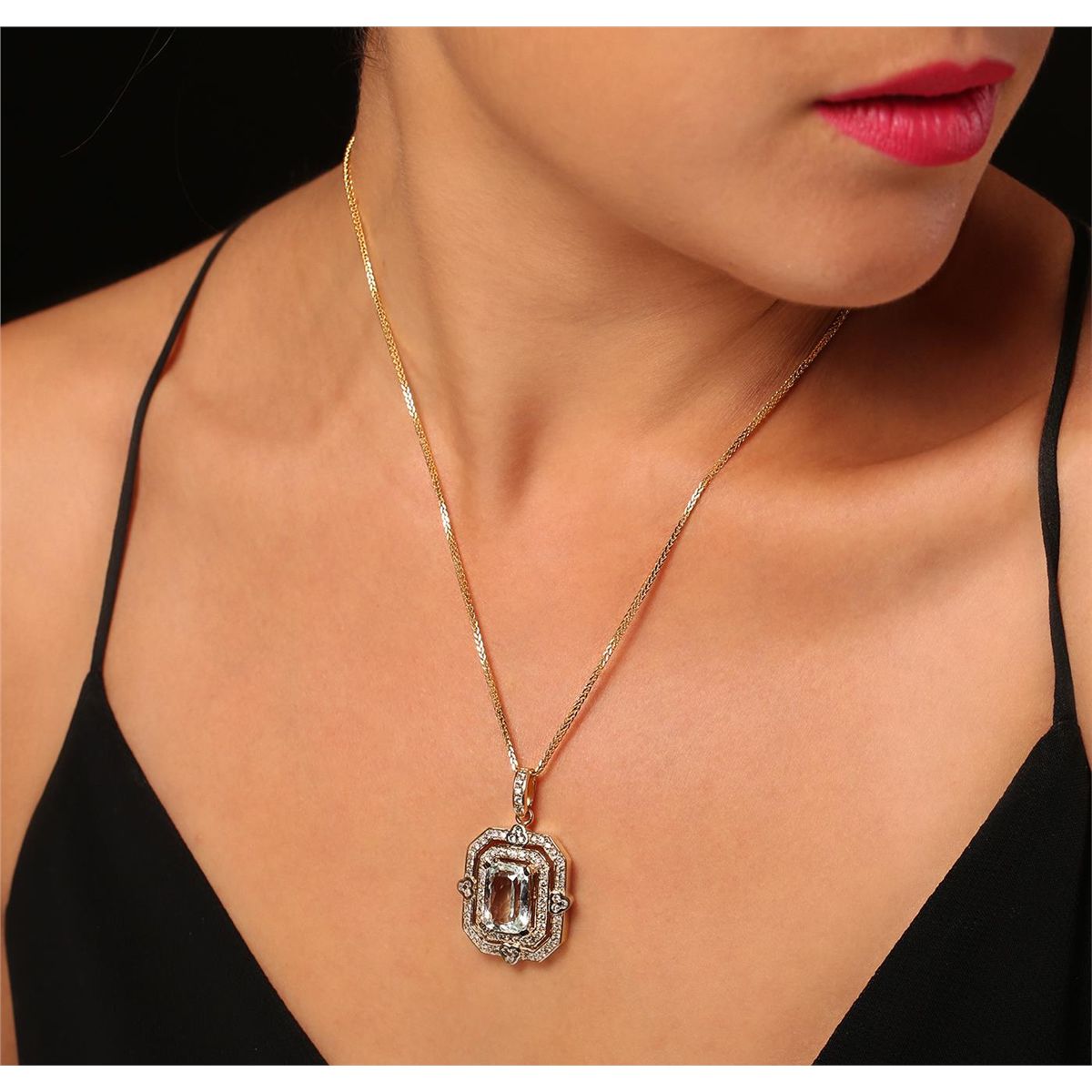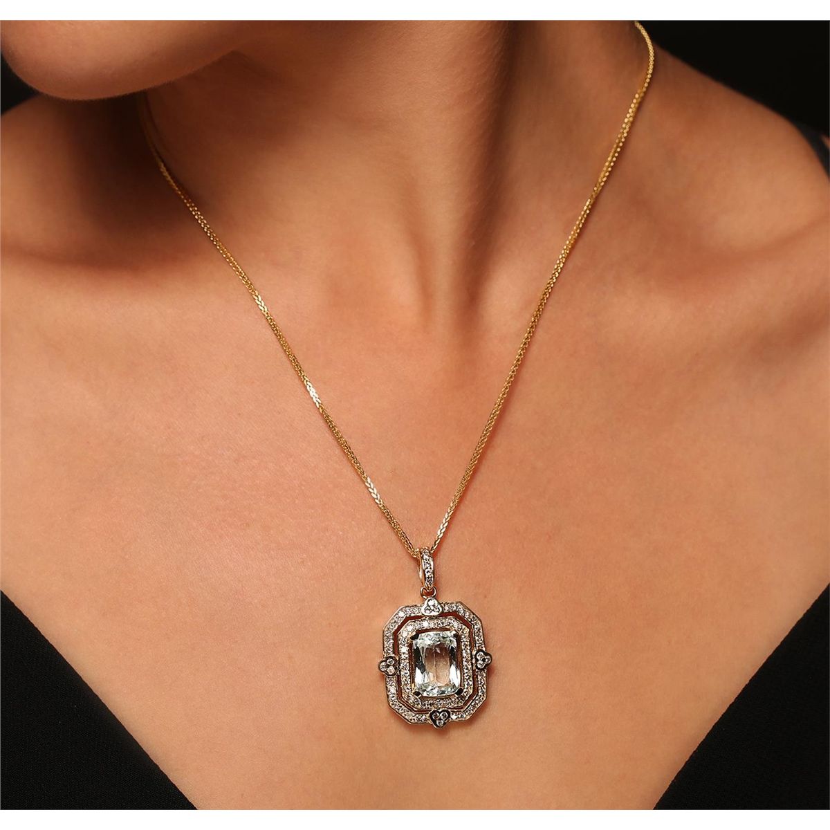One electronically tested 14KT yellow gold ladies cast & assembled aquamarine and diamond pendant with chain. Condition is new, good workmanship. The pendant features an aquamarine set within stylized diamond bezels, completed by a diamond set bail. The pendant is supported by an eighteen inch length 14KT yellow gold designer style chain, terminating in a lobster claw clasp. Containing: One prong set rectangular cushion mixed cut natural aquamarine, measuring 13.80 x 9.55 x 7.10mm, 20%. bulge factor, approximate weight of 7.50ct., clarity is slightly included, type I, medium light, very slightly grayish, very slightly greenish blue color, (GIA vslgB 4/3), cut is good. Transmitting light with a minimum of distortion, transparent. Naturally occurring internal & external characteristics are present. Colored Stone Grading Report attached. Graded in the setting. Eighty-One bead & bezel set round brilliant cut diamonds, measuring 1.70 - 1.60 x 0.99mm (depth est.) approximate. Total Weight of 81 Stones = 1.40ct. Graded in the setting. Clarity: SI-1 to I-1. Color: G - I. Total Weight of Colored Stones 7.50ct. Total Weight of Diamonds 1.40ct. Total Weight of Pendant With Chain 14.33 grams. AIG Appraised at $9,825.00.
