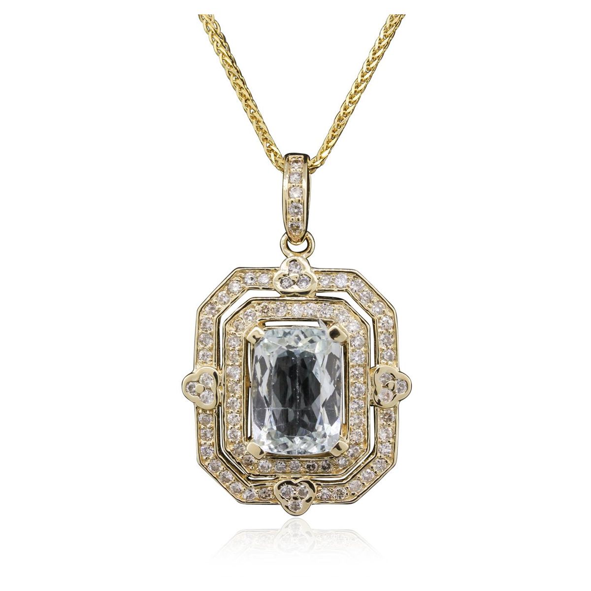 One electronically tested 14KT yellow gold ladies cast & assembled aquamarine and diamond pendant with chain. Condition is new, good workmanship. The pendant features an aquamarine set within stylized diamond bezels, completed by a diamond set bail. The pendant is supported by an eighteen inch length 14KT yellow gold designer style chain, terminating in a lobster claw clasp. Containing: One prong set rectangular cushion mixed cut natural aquamarine, measuring 13.80 x 9.55 x 7.10mm, 20%. bulge factor, approximate weight of 7.50ct., clarity is slightly included, type I, medium light, very slightly grayish, very slightly greenish blue color, (GIA vslgB 4/3), cut is good. Transmitting light with a minimum of distortion, transparent. Naturally occurring internal & external characteristics are present. Colored Stone Grading Report attached. Graded in the setting. Eighty-One bead & bezel set round brilliant cut diamonds, measuring 1.70 - 1.60 x 0.99mm (depth est.) approximate. Total Weight of 81 Stones = 1.40ct. Graded in the setting. Clarity: SI-1 to I-1. Color: G - I. Total Weight of Colored Stones 7.50ct. Total Weight of Diamonds 1.40ct. Total Weight of Pendant With Chain 14.33 grams. AIG Appraised at $9,825.00.