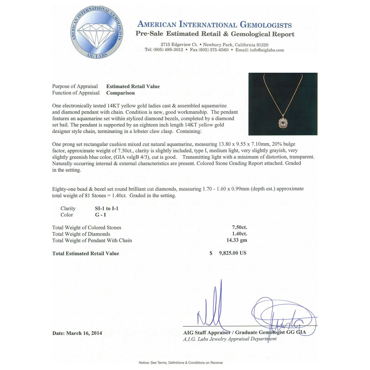One electronically tested 14KT yellow gold ladies cast & assembled aquamarine and diamond pendant with chain. Condition is new, good workmanship. The pendant features an aquamarine set within stylized diamond bezels, completed by a diamond set bail. The pendant is supported by an eighteen inch length 14KT yellow gold designer style chain, terminating in a lobster claw clasp. Containing: One prong set rectangular cushion mixed cut natural aquamarine, measuring 13.80 x 9.55 x 7.10mm, 20%. bulge factor, approximate weight of 7.50ct., clarity is slightly included, type I, medium light, very slightly grayish, very slightly greenish blue color, (GIA vslgB 4/3), cut is good. Transmitting light with a minimum of distortion, transparent. Naturally occurring internal & external characteristics are present. Colored Stone Grading Report attached. Graded in the setting. Eighty-One bead & bezel set round brilliant cut diamonds, measuring 1.70 - 1.60 x 0.99mm (depth est.) approximate. Total Weight of 81 Stones = 1.40ct. Graded in the setting. Clarity: SI-1 to I-1. Color: G - I. Total Weight of Colored Stones 7.50ct. Total Weight of Diamonds 1.40ct. Total Weight of Pendant With Chain 14.33 grams. AIG Appraised at $9,825.00.