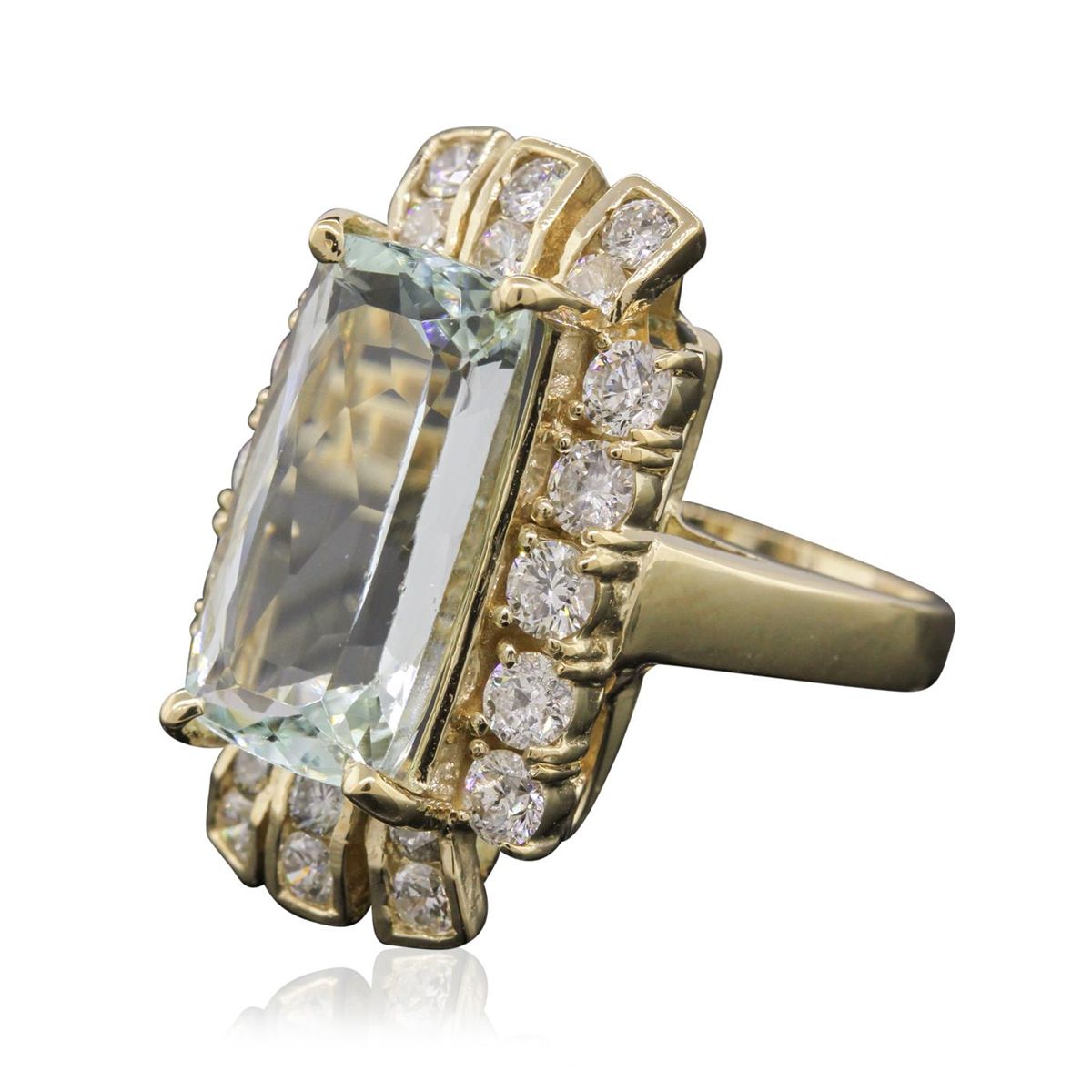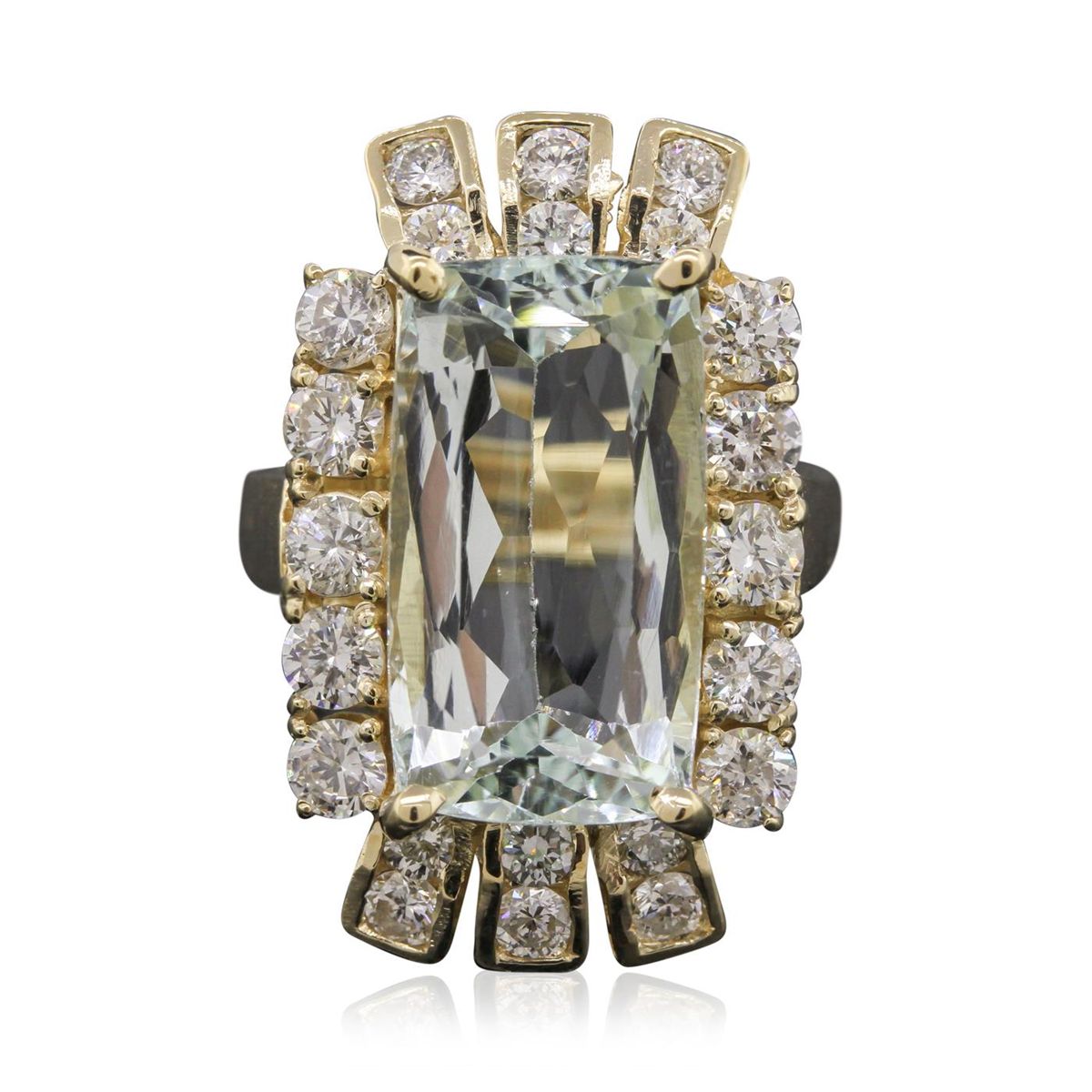 One electronically tested 14KT yellow gold Ladies combination cast & assembled ring with a bright polish finish. Condition is new. Identified with markings of "14K". Containing: One prong set rectangular cushion modified brilliant cut natural aquamarine, measuring 17.47 x 9.78 x 6.90mm, approximate weight of 7.54ct., clarity is eye clean, type I, light, very slightly grayish, blue color, (GIA B 3/3), cut is very good. Colored gemstones are presumed to have been subjected to commonly used color/clarity enhancement processes. Ten prong set round brilliant cut diamonds, measuring 3.10 - 3.10 x 1.86mm (depth est.) approximate. Total Weight of 10 Stones = 1.09ct. Clarity: I-1. Color: I - J, Cut is Good. Twelve channel set round brilliant cut diamonds, measuring 2.50 - 2.50 x 1.50mm (depth est.) approximate. Total Weight of 12 Stones = 0.69ct. Clarity: I-1. Color: I - J, Cut is Good. Total Weight of Colored Stones 7.54ct. Total Weight of Diamonds 1.78ct. Total Weight of Ring 10.90 grams. GGL Appraised at $8,900.00.