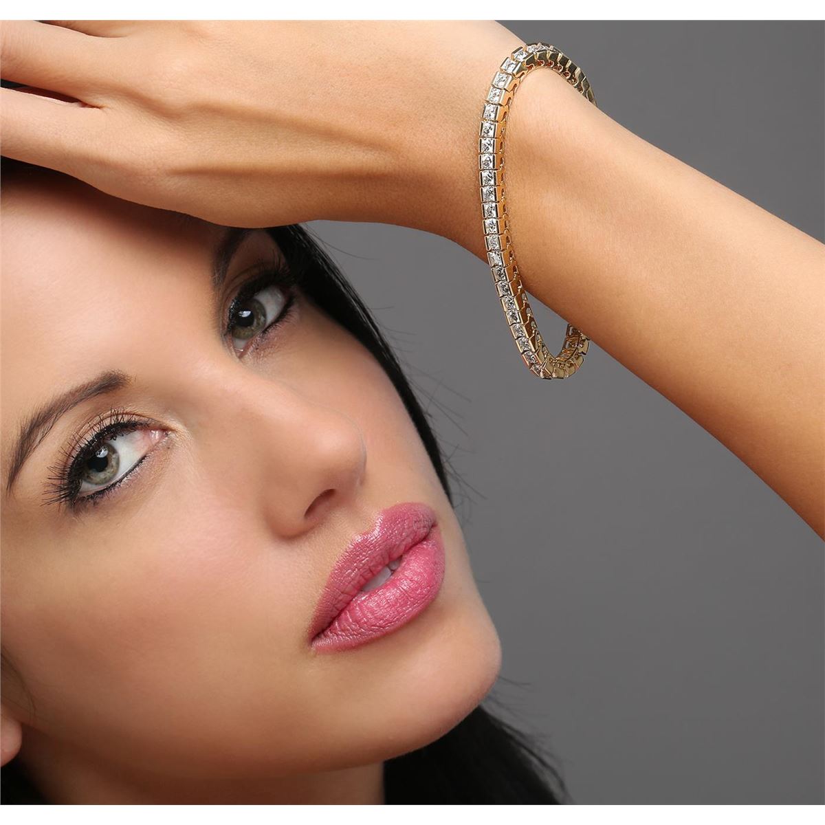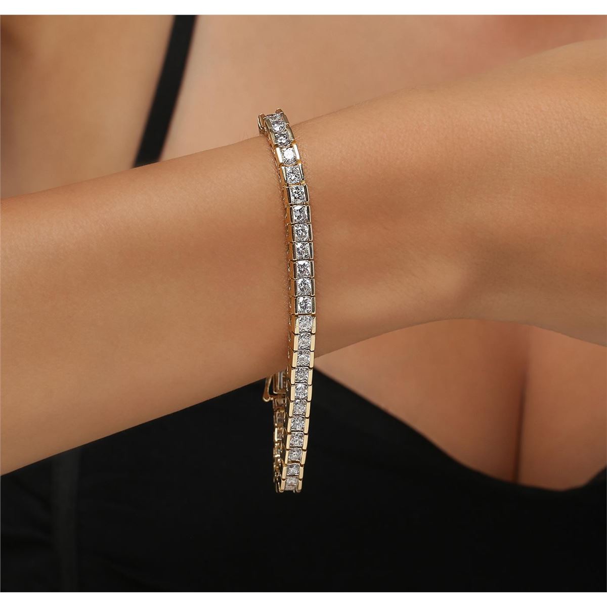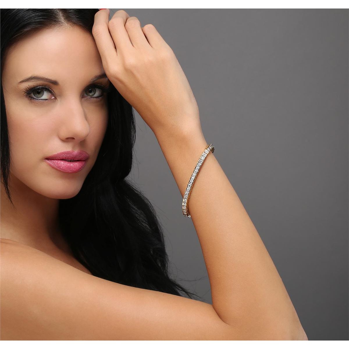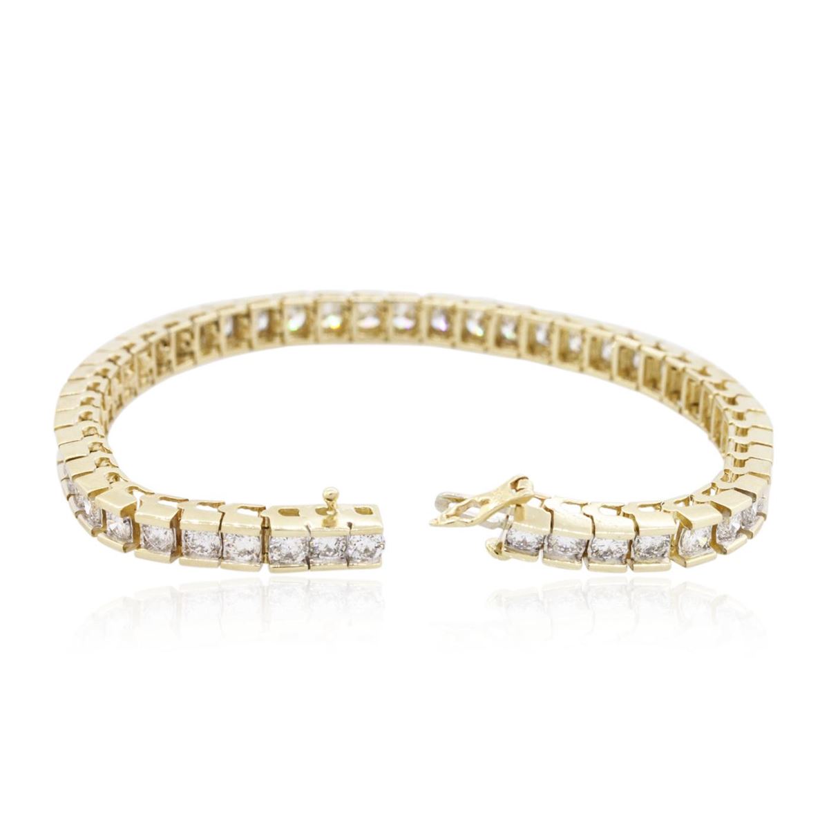 One electronically tested 14KT yellow gold ladies cast & assembled diamond tennis bracelet. Seven and one-quarter inch length bracelet composed of a flexible ribbon of diamonds, terminating in a concealed clasp with safety. Bright polish finish with rhodium accents. Identified with markings of "14K". Condition is new, good workmanship. Tennis bracelets & necklaces got their unusual name from an incident involving the U.S. professional tennis player Chris Evert during a tennis match in the 1980's. Evert had been wearing an expensive diamond bracelet, an inline string of individually-set diamonds. Previously these bracelets were known as eternity bracelets. When the clasp snapped during play, she asked the officials to stop the tennis match until the bracelet could be found. Since that day, bracelets and necklaces featuring an inline string of diamonds have been called tennis bracelets and tennis necklaces. Containing: Forty-Nine channel set round brilliant cut diamonds, measuring 3.50 - 3.40 x 2.10mm (depth est.) approximate total weight of 49 Stones = 7.56ct. Graded in the setting. Clarity: SI-1 to I-1. Color: G - I. Total Weight of Diamonds 7.56ct. Total Weight of Tennis Bracelet 21.16 grams. AIG Appraised at $26,770.00.