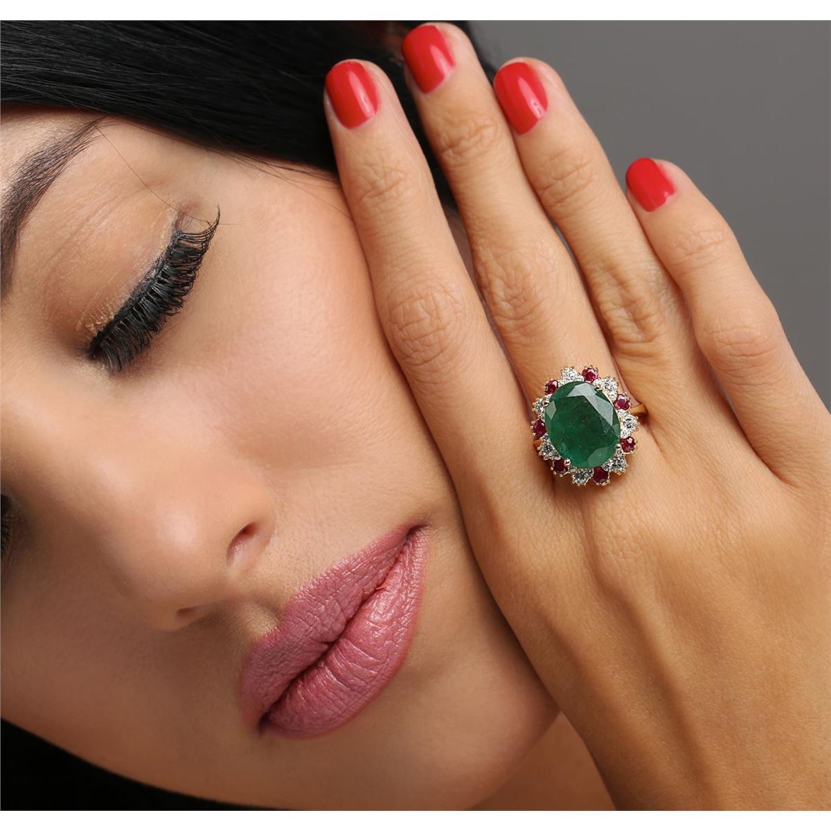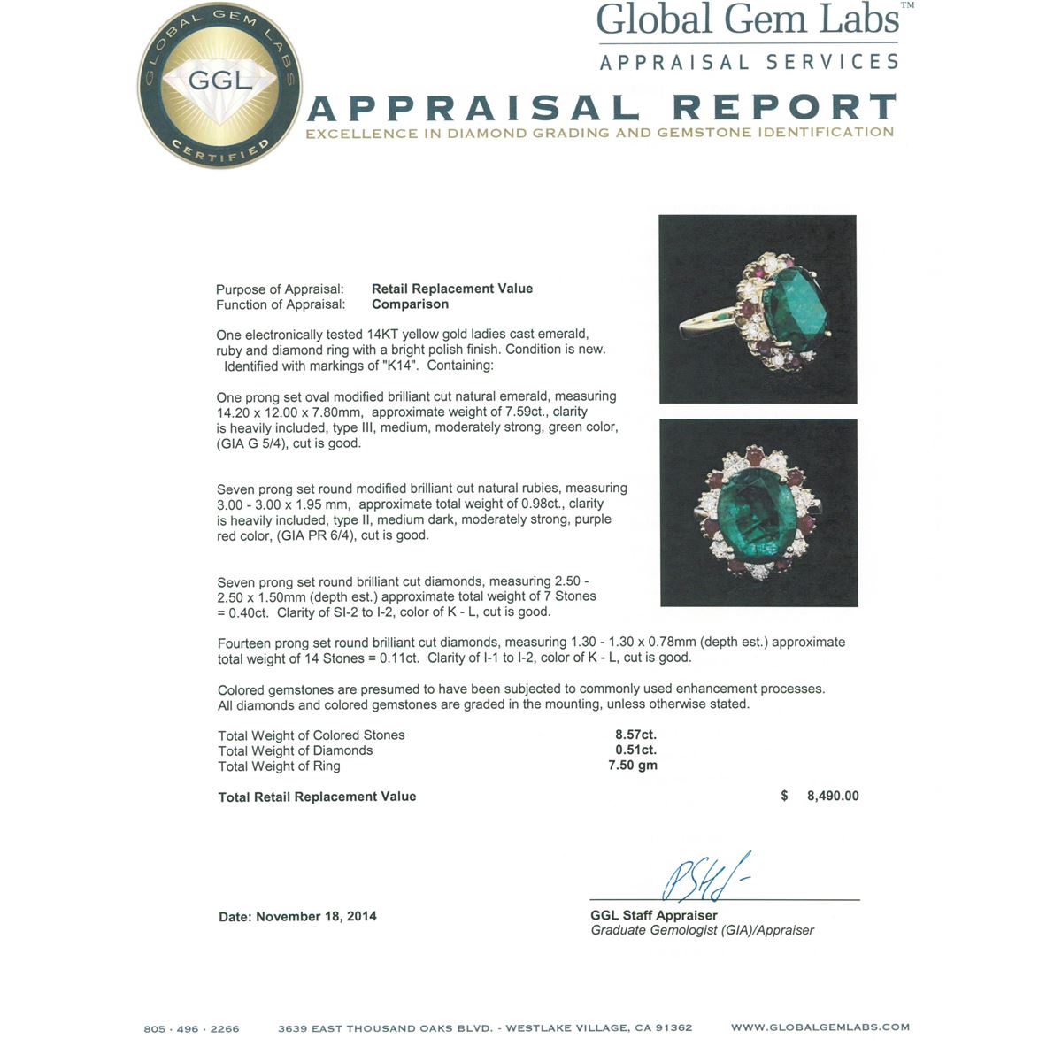 One electronically tested 14KT yellow gold ladies cast emerald, ruby and diamond ring with a bright polish finish. Identified with markings of "K14". Condition is new. Containing: One prong set oval modified brilliant cut natural emerald, measuring 14.20 x 12.00 x 7.80mm, approximate weight of 7.59ct., clarity is heavily included, type III, medium, moderately strong, green color, (GIA G 5/4), cut is good. Seven prong set round modified brilliant cut natural rubies, measuring 3.00 - 3.00 x 1.95 mm, approximate total weight of 0.98ct., clarity is heavily included, type II, medium dark, moderately strong, purple red color, (GIA PR 6/4), cut is good. Seven prong set round brilliant cut diamonds, measuring 2.50 - 2.50 x 1.50mm (depth est.) approximate total weight of 7 Stones = 0.40ct. Clarity: SI-2 to I-2. Color: K - L, Cut is Good. Fourteen prong set round brilliant cut diamonds, measuring 1.30 - 1.30 x 0.78mm (depth est.) approximate total weight of 14 Stones = 0.11ct. Clarity: I-1 to I-2. Color: K - L, Cut is Good. Colored gemstones are presumed to have been subjected to commonly used enhancement processes. All diamonds and colored gemstones are graded in the mounting, unless otherwise stated. Total Weight of Colored Stones 8.57ct. Total Weight of Diamonds 0.51ct. Total Weight of Ring 7.50 grams. GGL Appraised at $8,490.00.