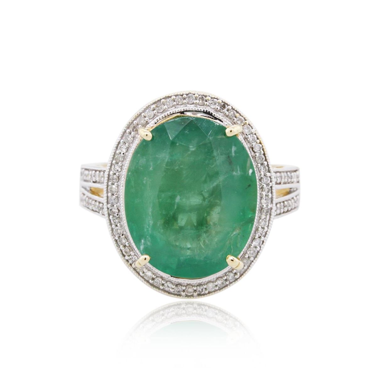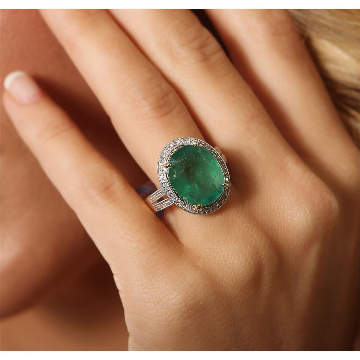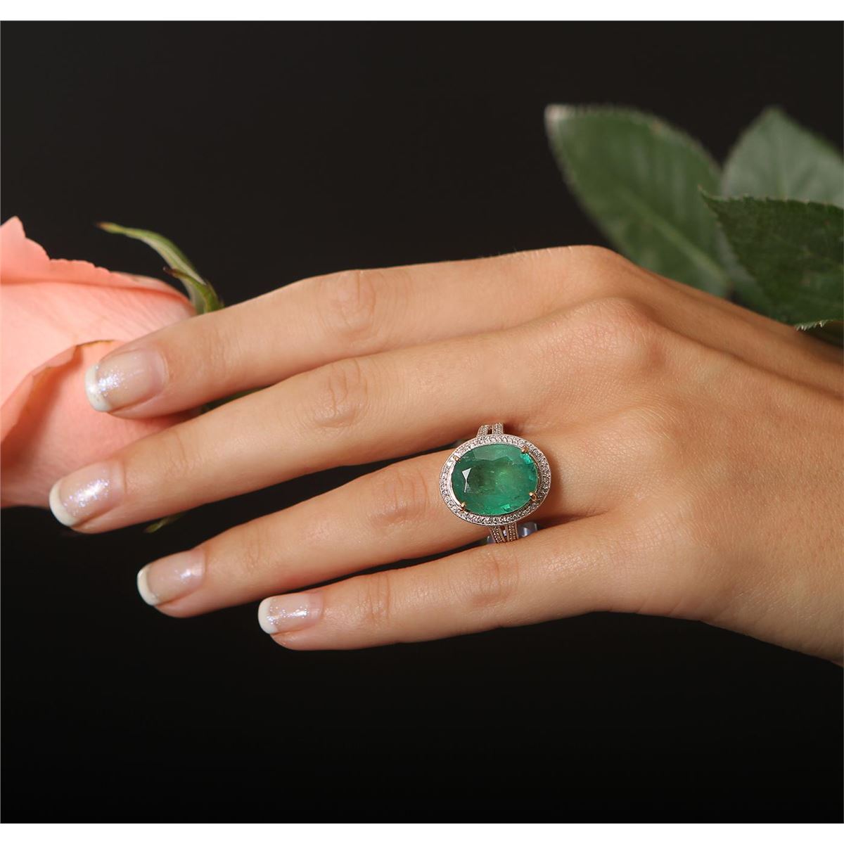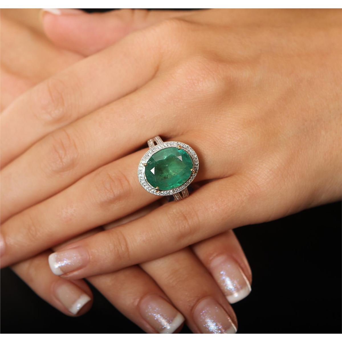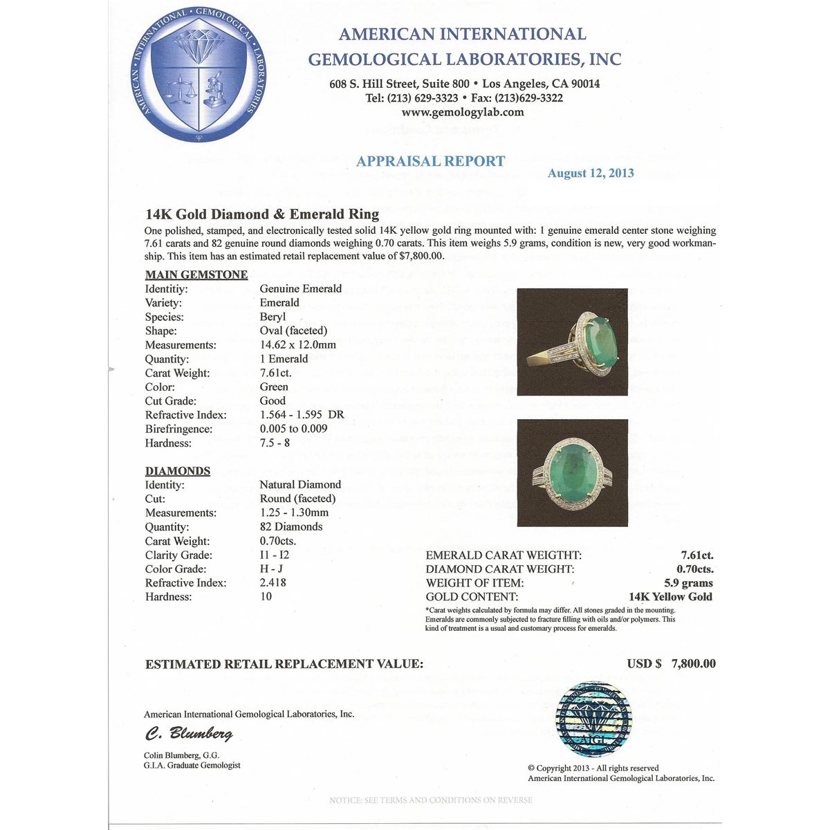 One polished, stamped, and electronically tested solid 14K yellow gold ring mounted with: 1 genuine emerald center stone weighing 7.61 carats and 82 genuine round diamonds weighing 0.70 carats. This item weighs 5.9 grams, condition is new, very good workmanship. AIGL Appraised at $7,800.00.