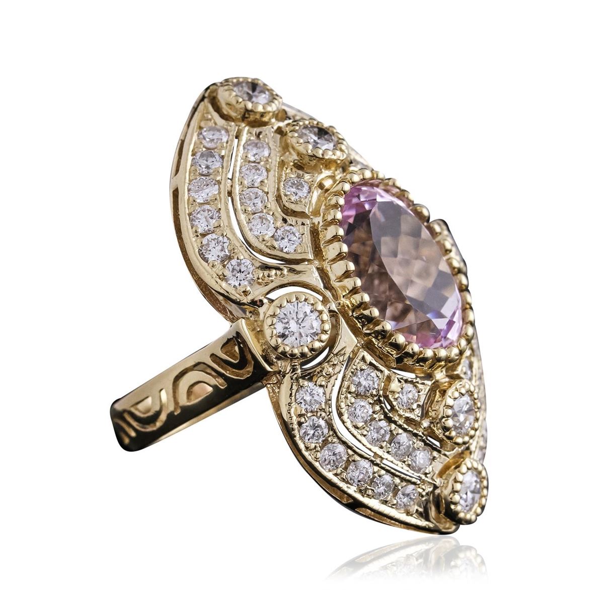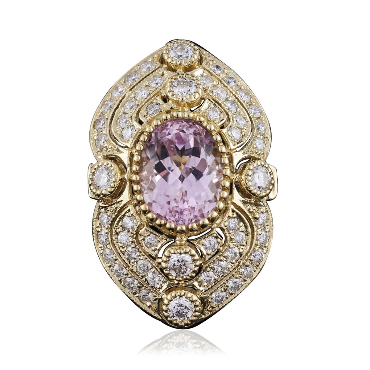 One electronically tested 14KT yellow gold ladies combination cast & assembled ring with a bright polish finish. Identified with markings of "K14". Condition is new. Containing: One gypsy set oval modified brilliant cut natural kunzite, measuring 14.00 x 11.50 x 7.40mm, approximate weight of 7.65ct., clarity is eye clean, type I, light, very slightly grayish, purple color, (GIA P 3/3), cut is good. Six gypsy set round brilliant cut diamonds, measuring 3.50 - 3.50 x 2.10mm (depth est.) approximate total weight of 6 Stones = 0.94ct. Clarity: VS-2 to SI-1. Color: H - I, Cut is Good. Forty-Eight prong set round brilliant cut diamonds, measuring 2.00 - 2.00 x 1.20mm (depth est.) approximate total weight of 48 Stones = 1.40ct. Clarity: SI-1 to I-1. Color: G - H, Cut is Good. Colored gemstones are presumed to have been subjected to commonly used enhancement processes. All diamonds and colored gemstones are graded in the mounting, unless otherwise stated. Total Weight of Colored Stones 7.65ct. Total Weight of Diamonds 2.34ct. Total Weight of Ring 12.20 grams. GGL Appraised at $14,255.00.