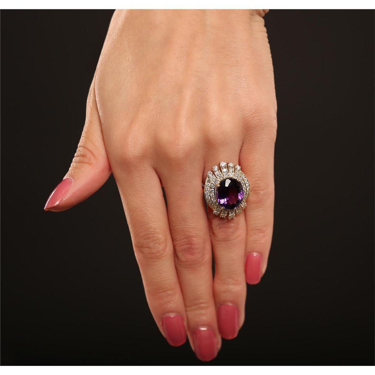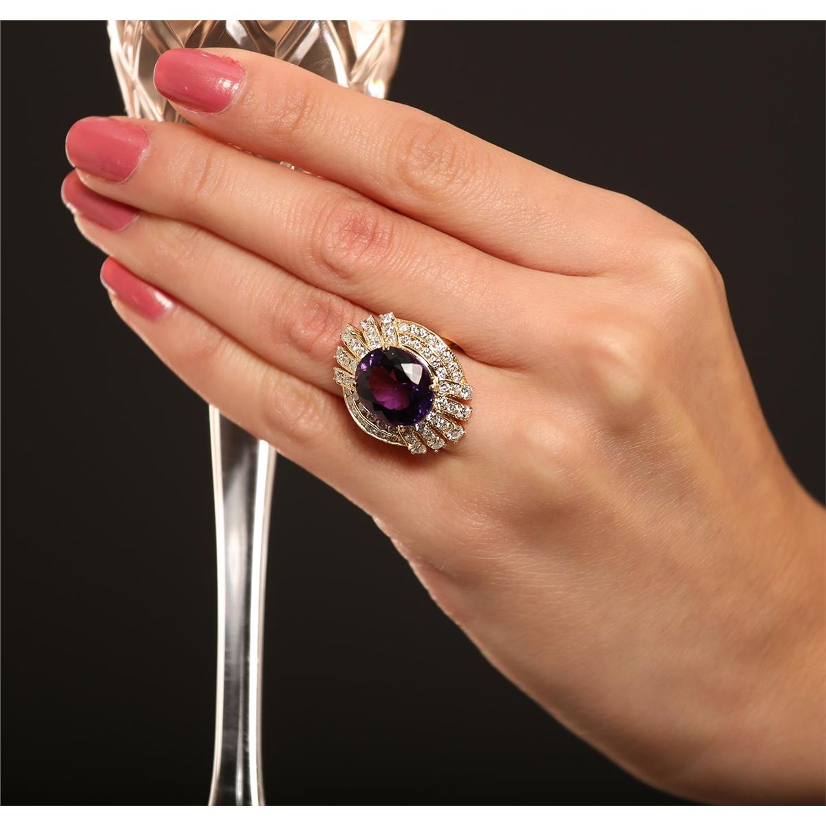 One electronically tested 14KT yellow gold ladies cast amethyst and diamond ring. Condition is new, good workmanship. The featured amethyst is set within an elaborate diamond set gallery, completed by a two and one-half millimeter wide band. Bright polish finish with milgrain detailing throughout. Identified with markings of "K14". Containing: One prong set oval mixed cut natural amethyst, measuring 13.90 x 12.00 x 8.00mm, 5% bulge factor, approximate weight of 7.67ct., clarity is eye clean, type II, medium dark, very slightly grayish, reddish purple color, (GIA rP 6/3), cut is good. Transmitting light with no distortion, transparent. Colored Stone Grading Report attached. Graded in the setting. Fifty-six prong and channel set round brilliant cut diamonds, measuring 2.70 - 2.00 x 1.41mm (depth est.) approximate total weight of 56 Stones = 1.94ct. Graded in the setting. Clarity I-1 to 1-2. Color G - H. Total Weight of Colored Stones 7.67ct. Total Weight of Diamonds 1.94ct. Total Weight of Ring 8.84gm. AIG Appraised at $6,585.00.