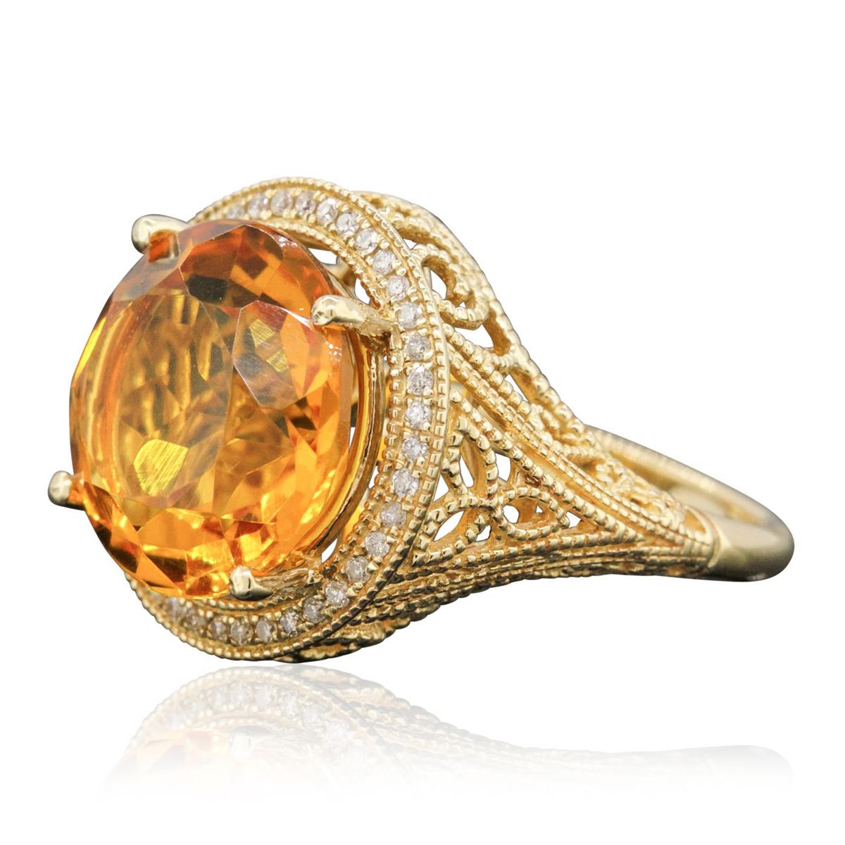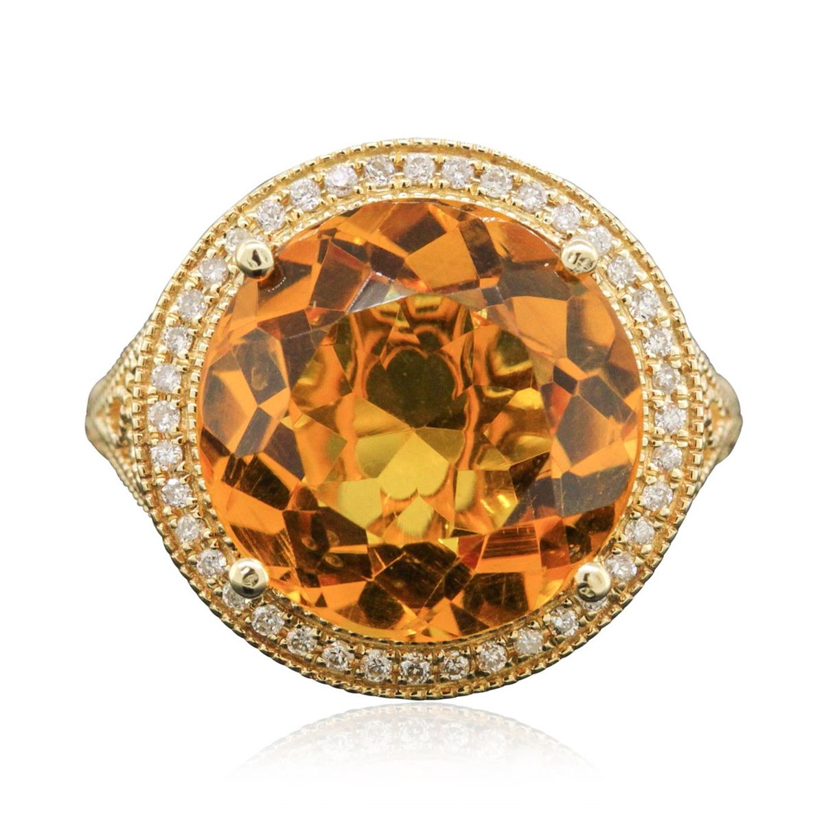 One electronically tested 14KT yellow gold ladies combination cast & assembled ring with a bright polish finish. Condition is new. Identified with markings of "14K". Containing: One prong set round modified brilliant cut natural citrine quartz, measuring 13.05 - 13.00 x 8.47 mm, approximate weight of 7.67ct., clarity is eye clean, type I, medium light, yellow color, (GIA Y 4/0), cut is good. Forty prong set round brilliant cut diamonds, measuring 1.00 - 1.00 x 0.60mm (depth est.) approximate total weight of 40 Stones = 0.14ct. Clarity: I-1 to I-2. Color: I - J, Cut is Good. Colored gemstones are presumed to have been subjected to commonly used enhancement processes. All diamonds and colored gemstones are graded in the mounting, unless otherwise stated. Total Weight of Colored Stones 7.67ct. Total Weight of Diamonds 0.14ct. Total Weight of Ring 6.20 grams. GGL Appraised at $3,175.00.