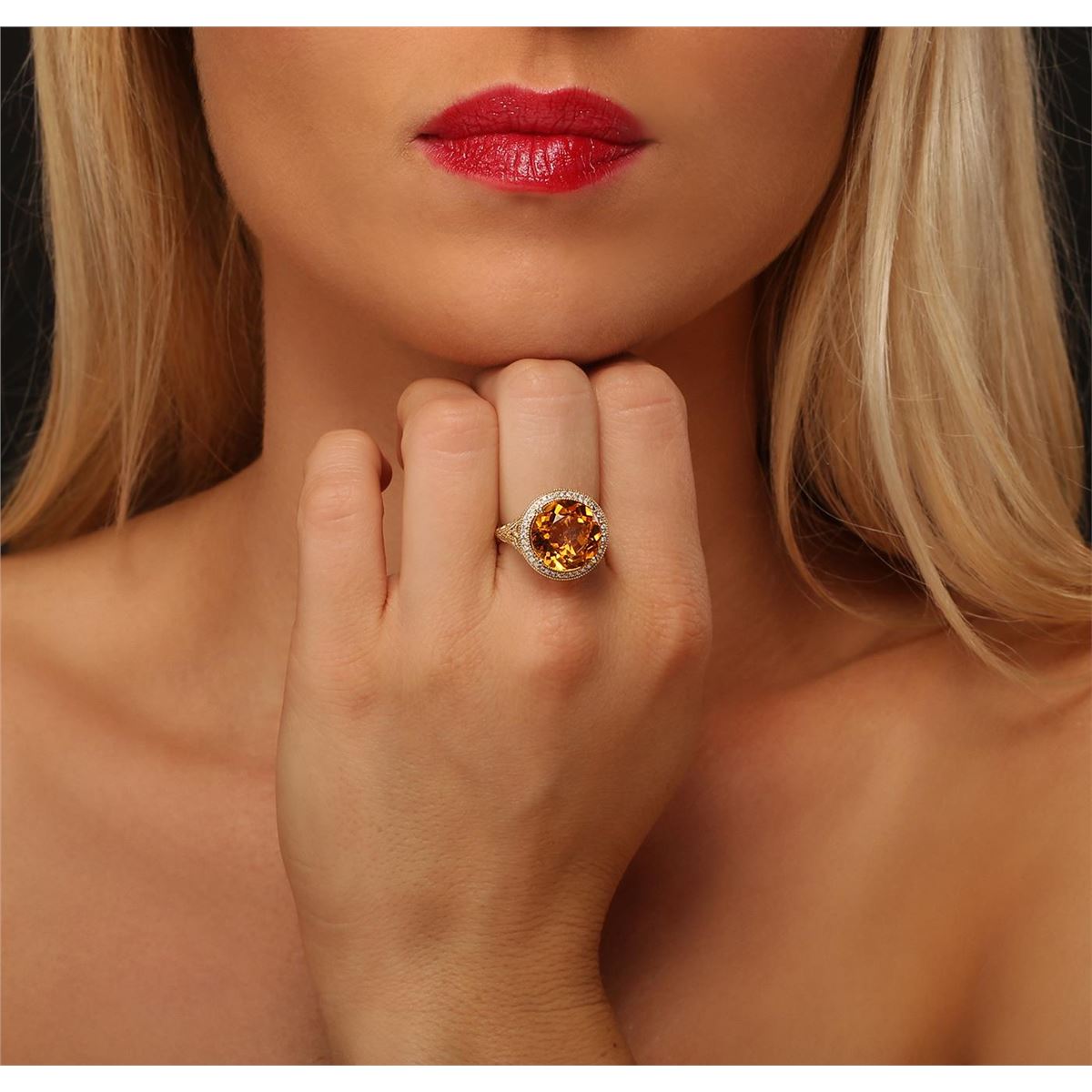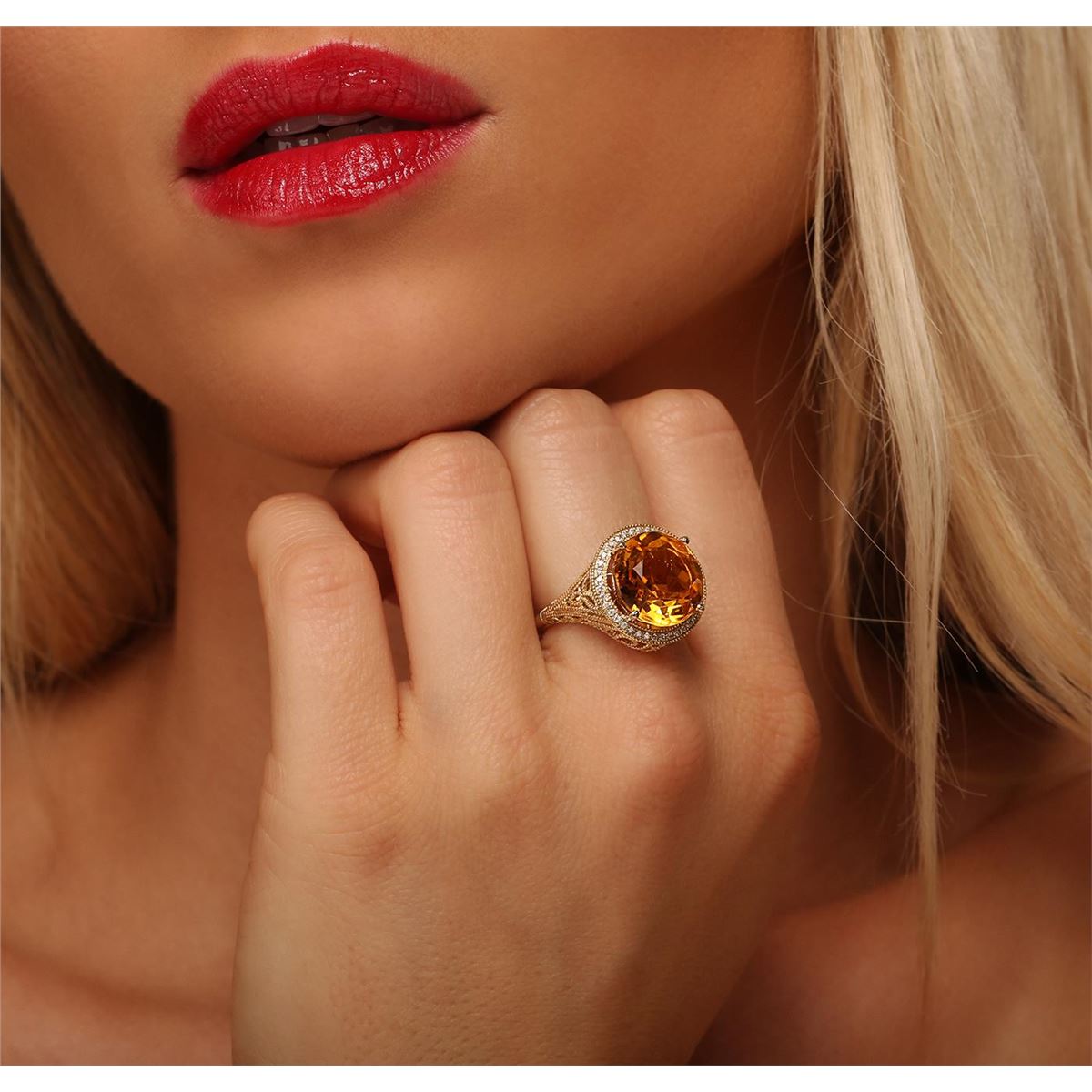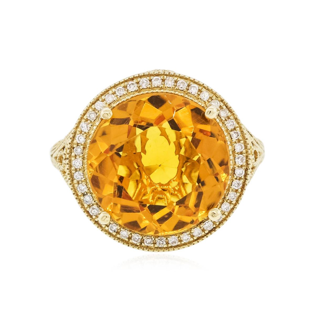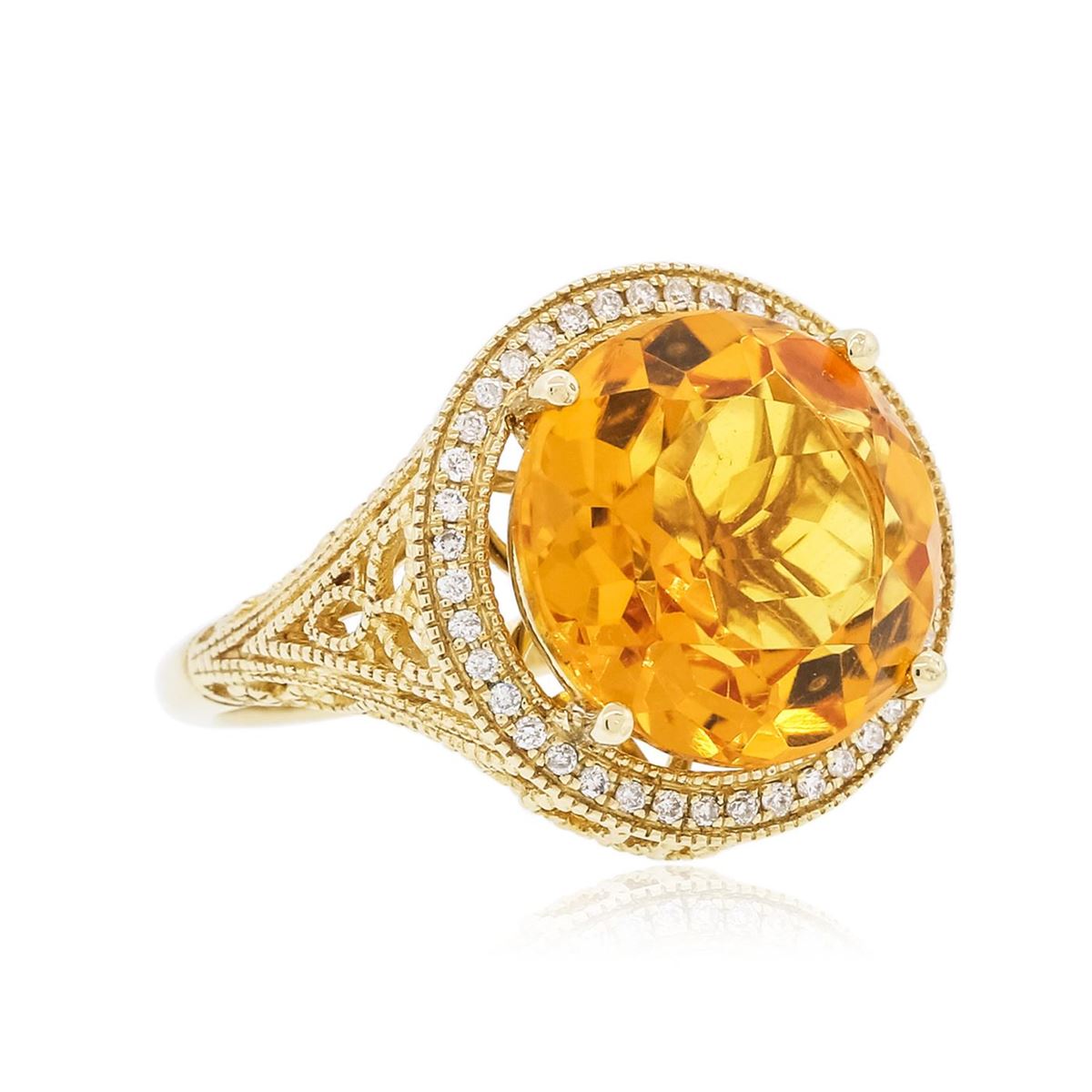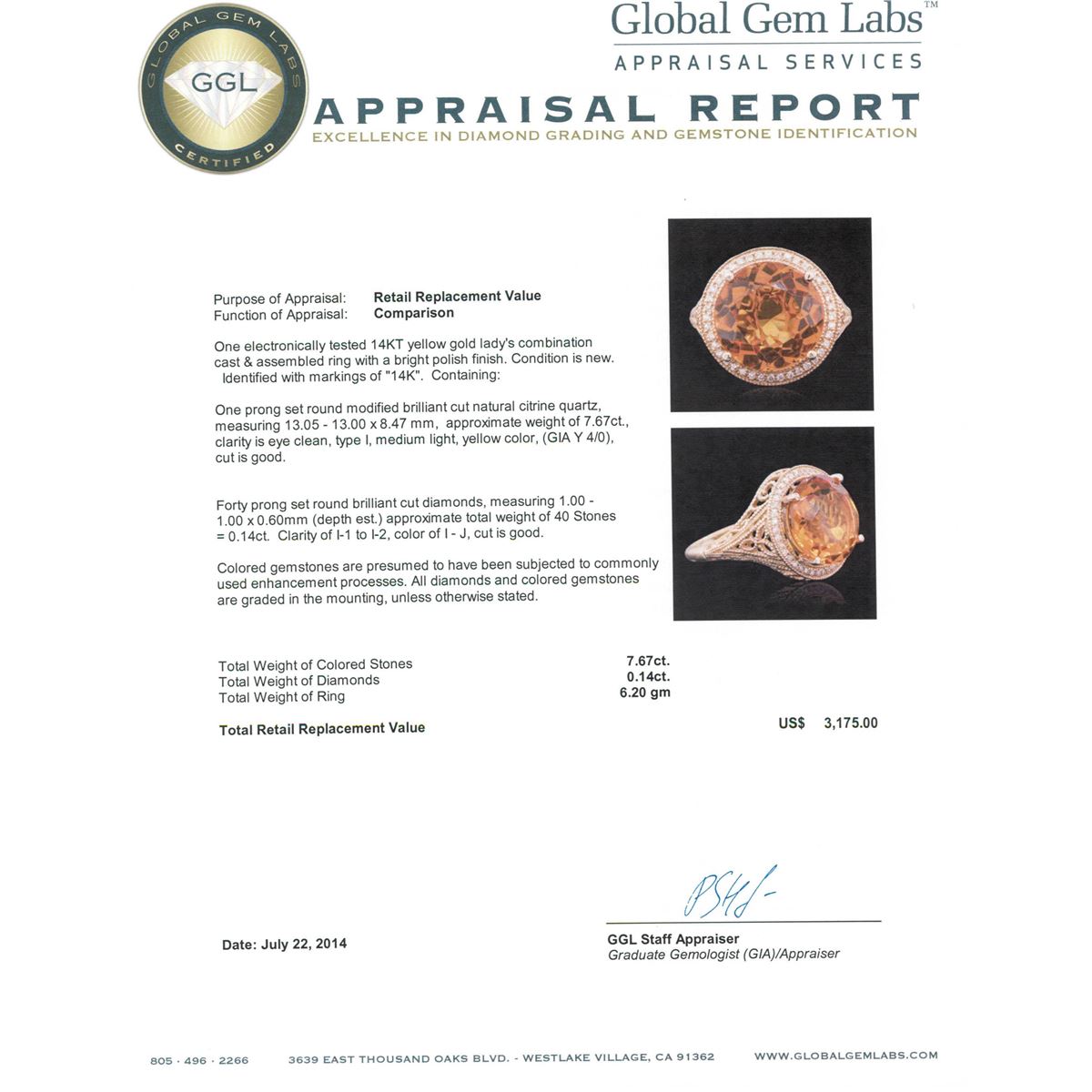 One electronically tested 14KT yellow gold ladies combination cast & assembled ring with a bright polish finish. Condition is new. Identified with markings of "14K". Containing: One prong set round modified brilliant cut natural citrine quartz, measuring 13.05 - 13.00 x 8.47 mm, approximate weight of 7.67ct., clarity is eye clean, type I, medium light, yellow color, (GIA Y 4/0), cut is good. Forty prong set round brilliant cut diamonds, measuring 1.00 - 1.00 x 0.60mm (depth est.) approximate total weight of 40 Stones = 0.14ct. Clarity: I-1 to I-2. Color: I - J, Cut is Good. Colored gemstones are presumed to have been subjected to commonly used enhancement processes. All diamonds and colored gemstones are graded in the mounting, unless otherwise stated. Total Weight of Colored Stones 7.67ct. Total Weight of Diamonds 0.14ct. Total Weight of Ring 6.20 grams. GGL Appraised at $3,175.00.