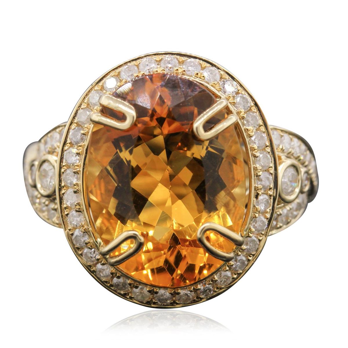 One electronically tested 14KT yellow gold Ladies combination cast & assembled ring with a bright polish finish. Condition is new. Identified with markings of "14K". Containing: One prong set oval modified brilliant cut natural citrine quartz, measuring 16.07 x 11.63 x 7.56mm, approximate weight of 7.71ct., clarity is eye clean, type I, medium light, brownish, orangy yellow color, (GIA oY 4/3), cut is good. Colored gemstones are presumed to have been subjected to commonly used color/clarity enhancement processes. Two bezel set round brilliant cut diamonds, measuring 2.50 - 2.50 x 1.50mm (depth est.) approximate. Total Weight of 2 Stones = 0.11ct. Clarity: I-2 to I-3. Color: I - J, Cut is Good. Thirty-Six prong set round brilliant cut diamonds, measuring 1.50 - 1.50 x 0.90mm (depth est.) approximate. Total Weight of 36 Stones = 0.44ct. Clarity: I-2 to I-3. Color: I - J, Cut is Good. All grading of diamonds and colored gemstones in this piece of jewelry are graded in the mounting, unless otherwise stated. Total Weight of Colored Stones 7.71ct. Total Weight of Diamonds 0.56ct. Total Weight of Ring 9.80 grams. GGL Appraised at $5,010.00.