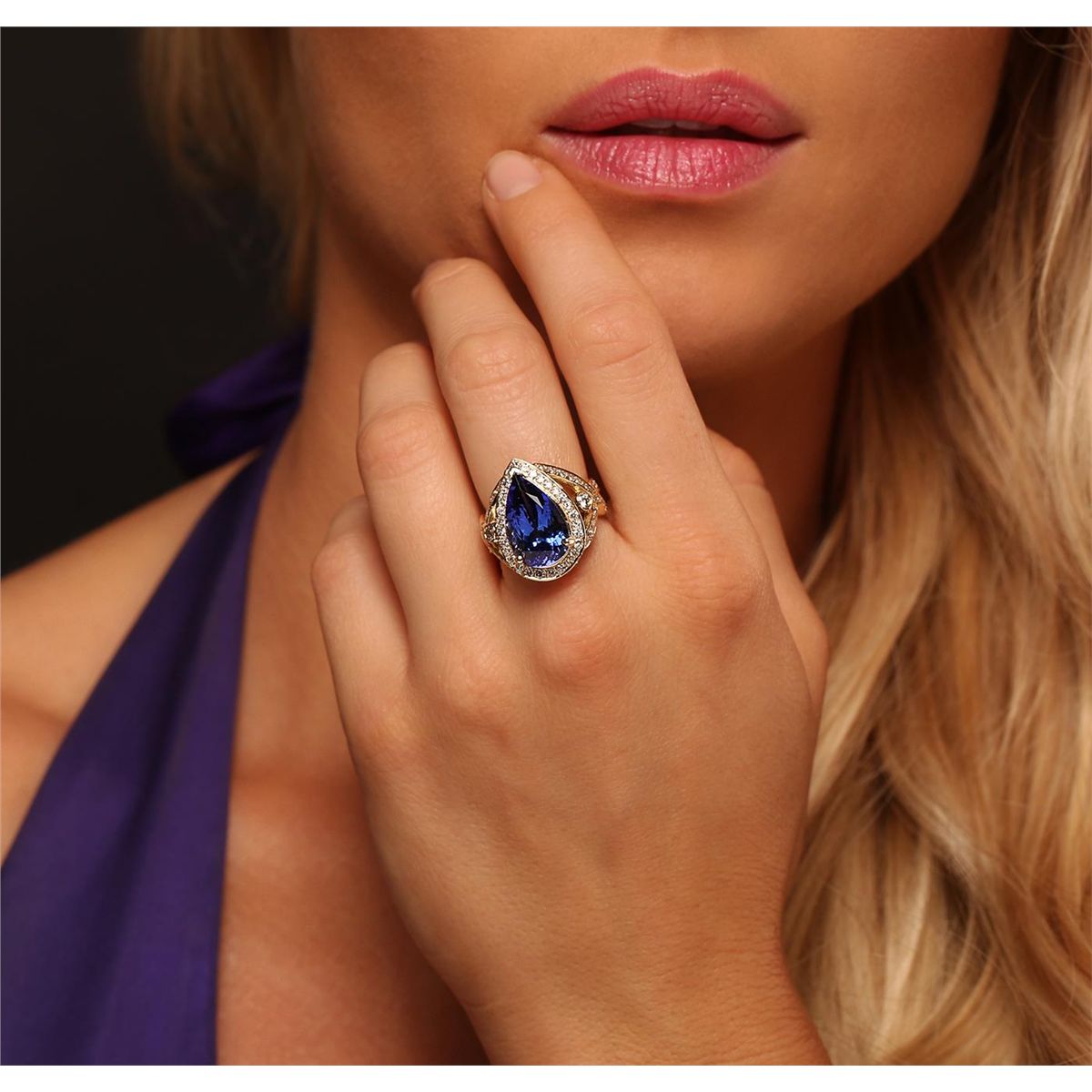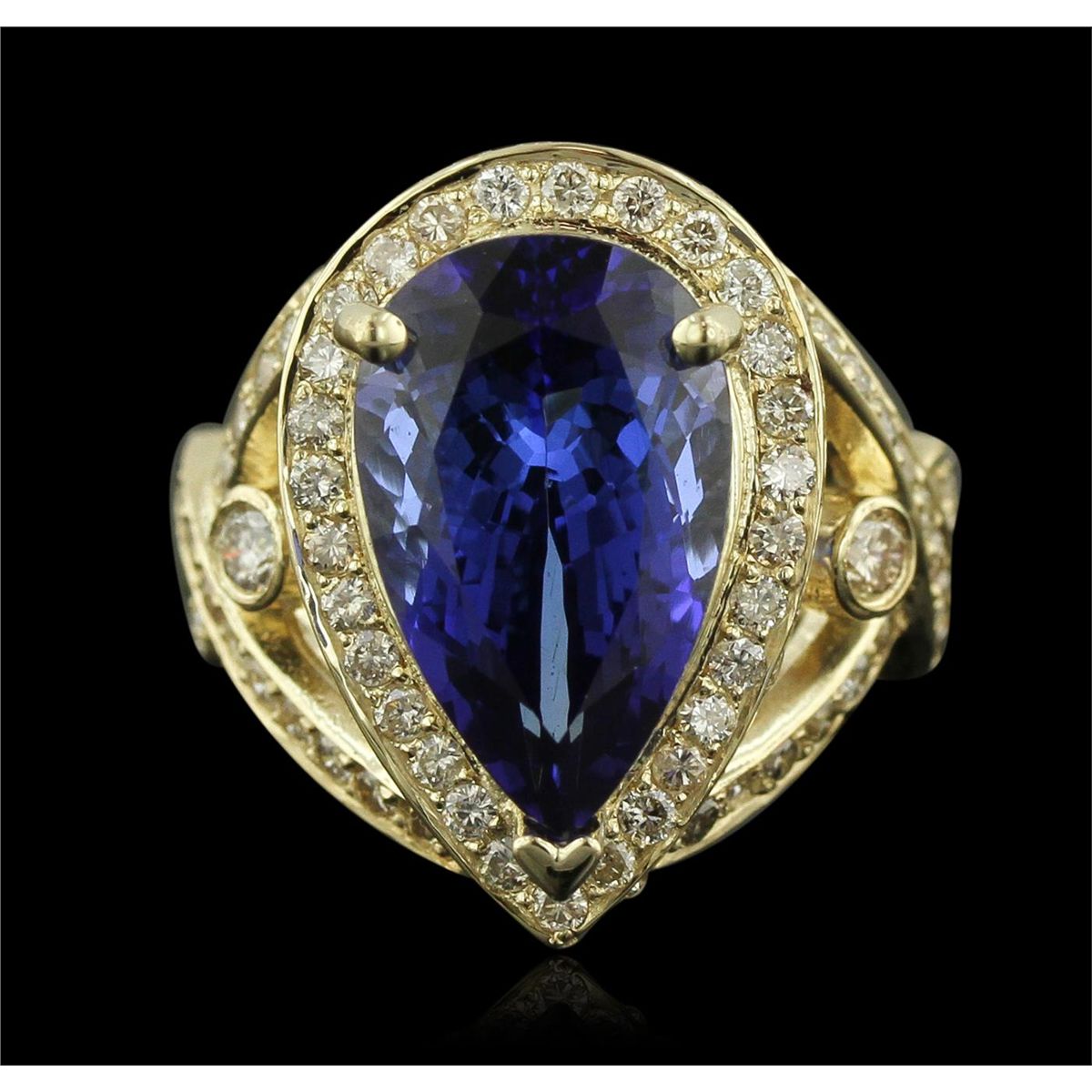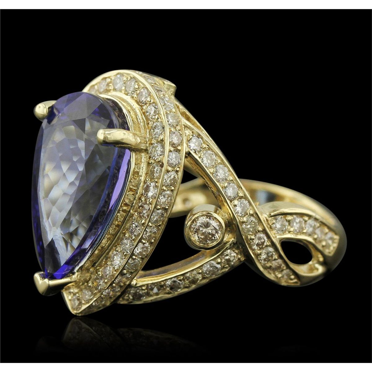 One electronically tested 14KT yellow gold ladies cast tanzanite and diamond ring with a bright polish finish. Condition is new, good workmanship. The featured tanzanite is set within a diamond bezel, supported by diamond set intertwined ribbons of diamonds as shoulders and completed by a four millimeter wide band. Identified with markings of "14K". Containing: One prong set pear modified brilliant cut natural tanzanite, measuring 15.79 x 9.73 x 7.74mm, exact weight 7.74ct., clarity is eye clean, type I, medium dark, moderately strong, violetish blue color, (GIA vB 6/4), cut is good. Transmitting light with no distortion, transparent. GIA Gemological Report attached. Graded loose prior to setting in the GIA Laboratory, Report #6157951680.Tanzanite is a very rare gemstone that is only found in the country of Tanzania. Originally discovered in 1967. Tiffany & Company, named the stone Tanzanite. It is found in the Usumburu Mountains that border the Umba Valley of northern Tanzania. Tanzanite occurs in gray, brown, violet, blue, reddish-purple, & green. The gem is interesting because of its exceptional pleochroism. Rotated in different directions a tanzanite will exhibit multiple changes of color. Tanzanite has a low tolerance to ultrasonic cleaning, and should not be cleaned using this method. One Hundred Thirty-Two bead & bezel set round brilliant cut diamonds, measuring 2.50 - 1.50 x 1.20mm (depth est.) approximate. Total Weight of 132 Stones = 1.84ct. Graded in the setting. Clarity: SI-1 to I-1. Color: G - I. Total Weight of Colored Stones 7.74ct. Total Weight of Diamonds 1.84ct. Total Weight of Ring 10.10 grams. AIGAppraised at $28,825.00.