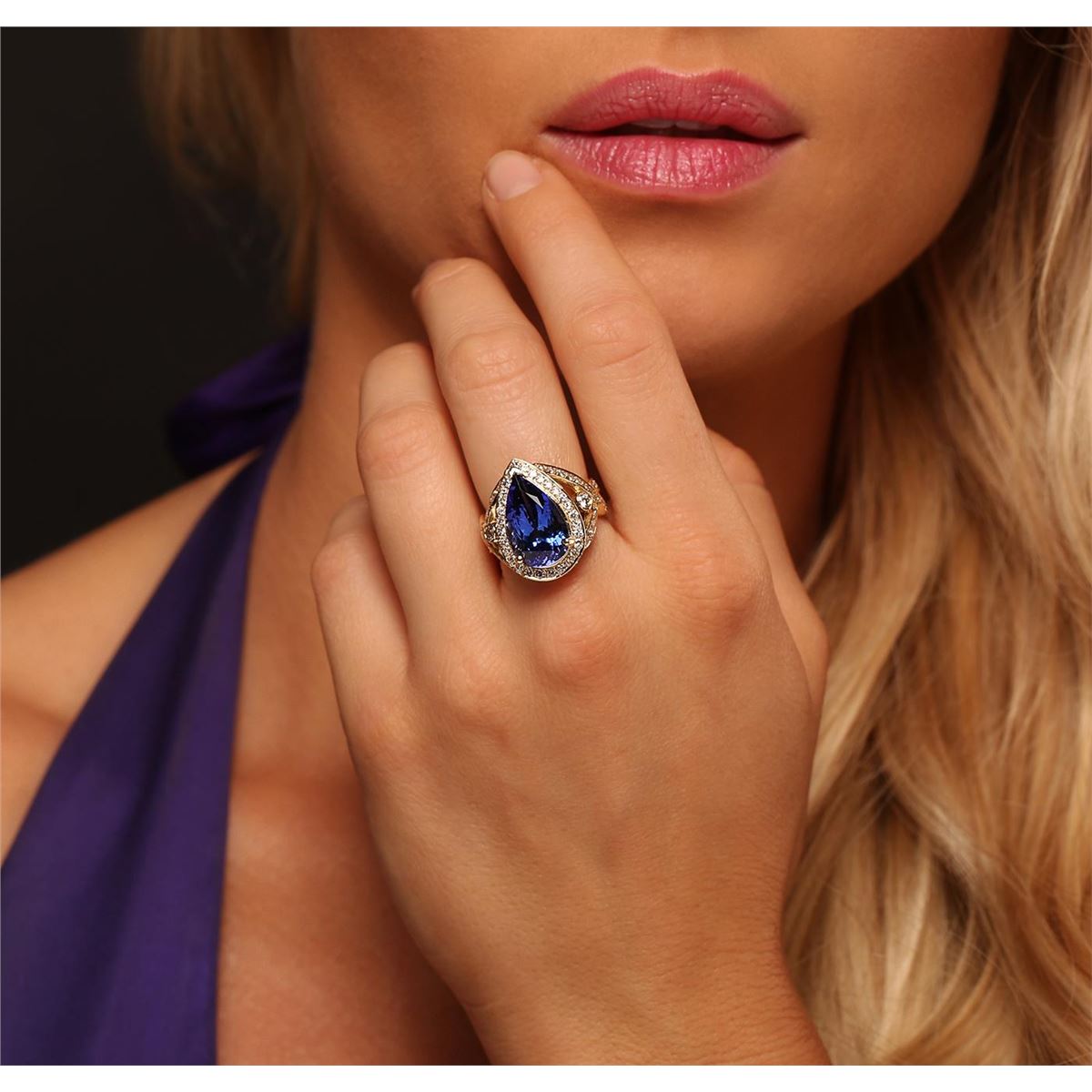 One electronically tested 14KT yellow gold ladies cast tanzanite and diamond ring with a bright polish finish. Condition is new, good workmanship. The featured tanzanite is set within a diamond bezel, supported by diamond set intertwined ribbons of diamonds as shoulders and completed by a four millimeter wide band. Identified with markings of "14K". Containing: One prong set pear modified brilliant cut natural tanzanite, measuring 15.79 x 9.73 x 7.74mm, exact weight 7.74ct., clarity is eye clean, type I, medium dark, moderately strong, violetish blue color, (GIA vB 6/4), cut is good. Transmitting light with no distortion, transparent. GIA Gemological Report attached. Graded loose prior to setting in the GIA Laboratory, Report #6157951680.Tanzanite is a very rare gemstone that is only found in the country of Tanzania. Originally discovered in 1967. Tiffany & Company, named the stone Tanzanite. It is found in the Usumburu Mountains that border the Umba Valley of northern Tanzania. Tanzanite occurs in gray, brown, violet, blue, reddish-purple, & green. The gem is interesting because of its exceptional pleochroism. Rotated in different directions a tanzanite will exhibit multiple changes of color. Tanzanite has a low tolerance to ultrasonic cleaning, and should not be cleaned using this method. One Hundred Thirty-Two bead & bezel set round brilliant cut diamonds, measuring 2.50 - 1.50 x 1.20mm (depth est.) approximate. Total Weight of 132 Stones = 1.84ct. Graded in the setting. Clarity: SI-1 to I-1. Color: G - I. Total Weight of Colored Stones 7.74ct. Total Weight of Diamonds 1.84ct. Total Weight of Ring 10.10 grams. AIG Appraised at $28,825.00.