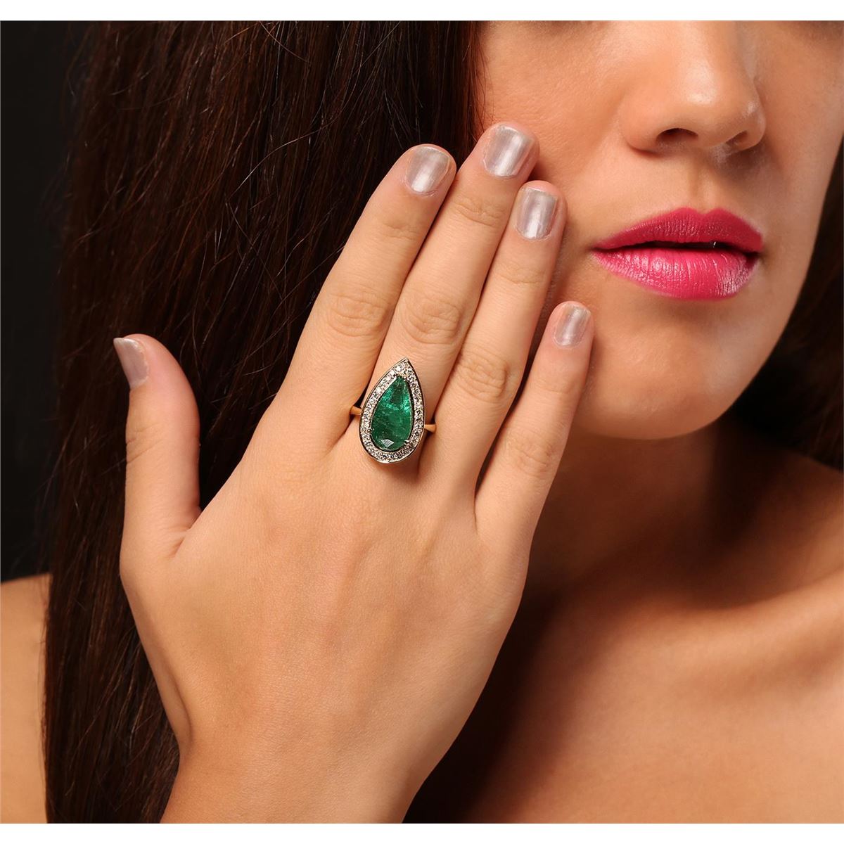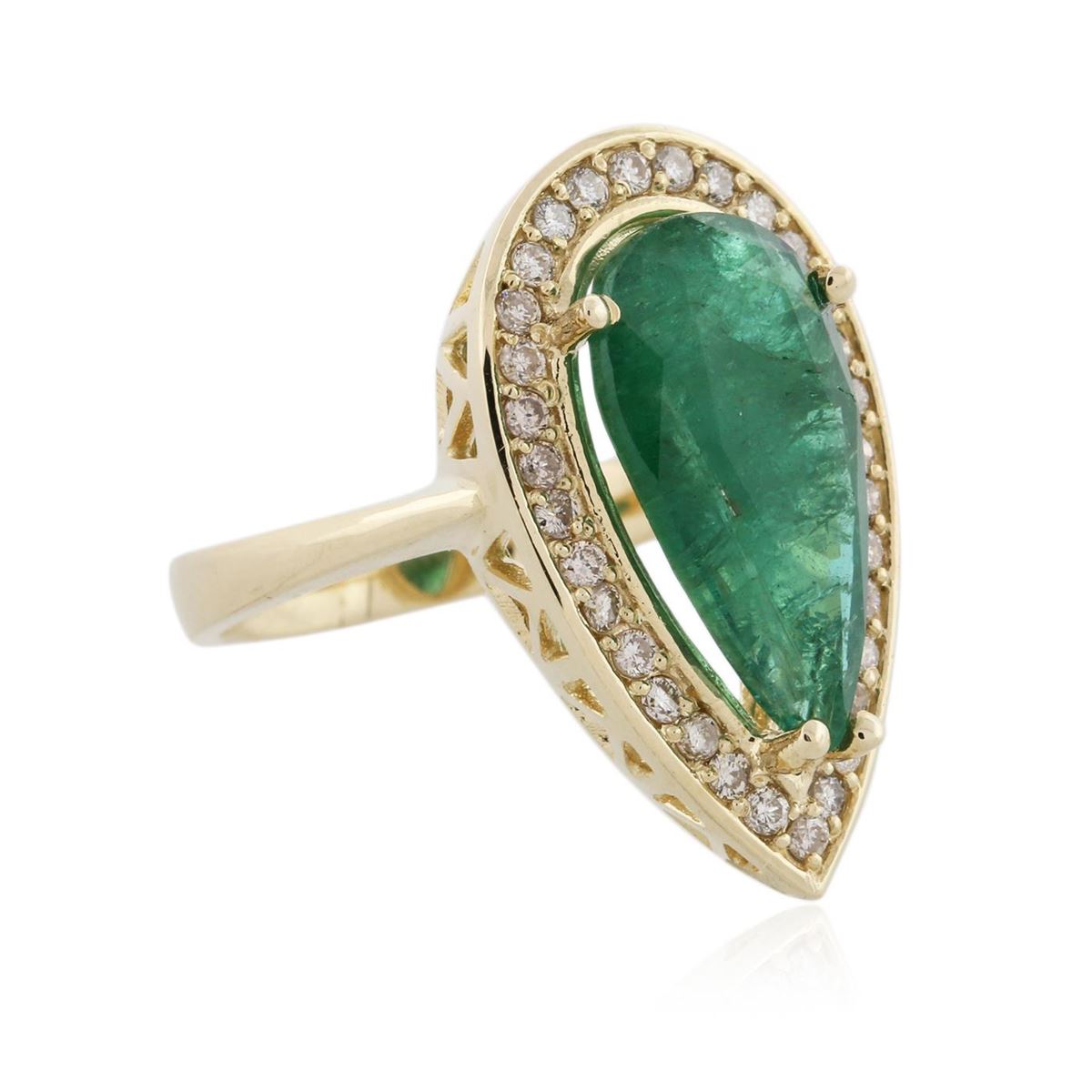 One electronically tested 14KT yellow gold Ladies combination cast & assembled fashion ring with a high polish finish. Condition is new. Identified with markings of "14K". Containing: One prong set pear modified mixed cut natural emerald, measuring 27.00 x 9.00 x 5.90mm, approximate weight of 7.80ct., clarity is heavily included, type III, medium dark, moderately strong, very slightly bluish green color, (GIA vslbG 6/4), cut is good. Colored gemstones are presumed to have been subjected to commonly used and possible undetectable color/clarity enhancement processes. Thirty-Two prong set round brilliant cut diamonds, measuring 1.50 - 1.50 x 0.90mm (depth est.) approximate total weight of 32 Stones = 0.39ct. Clarity of SI-1 to I-1, Color of K - L, Cut is Good. Total Weight of Colored Stones 7.80ct. Total Weight of Diamonds 0.39ct. Total Weight of Ring 8.20 grams. GGL Appraised at $18,265.00.