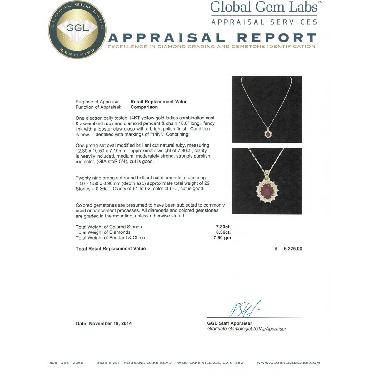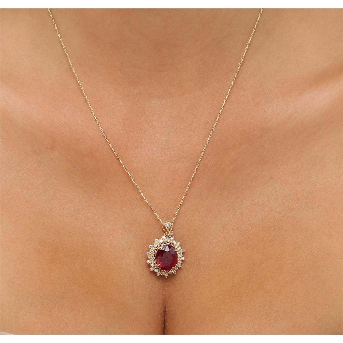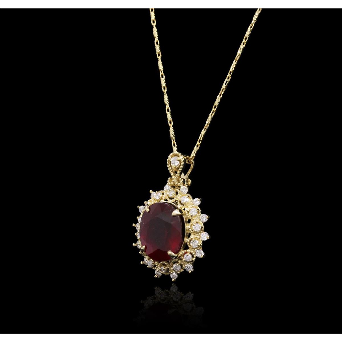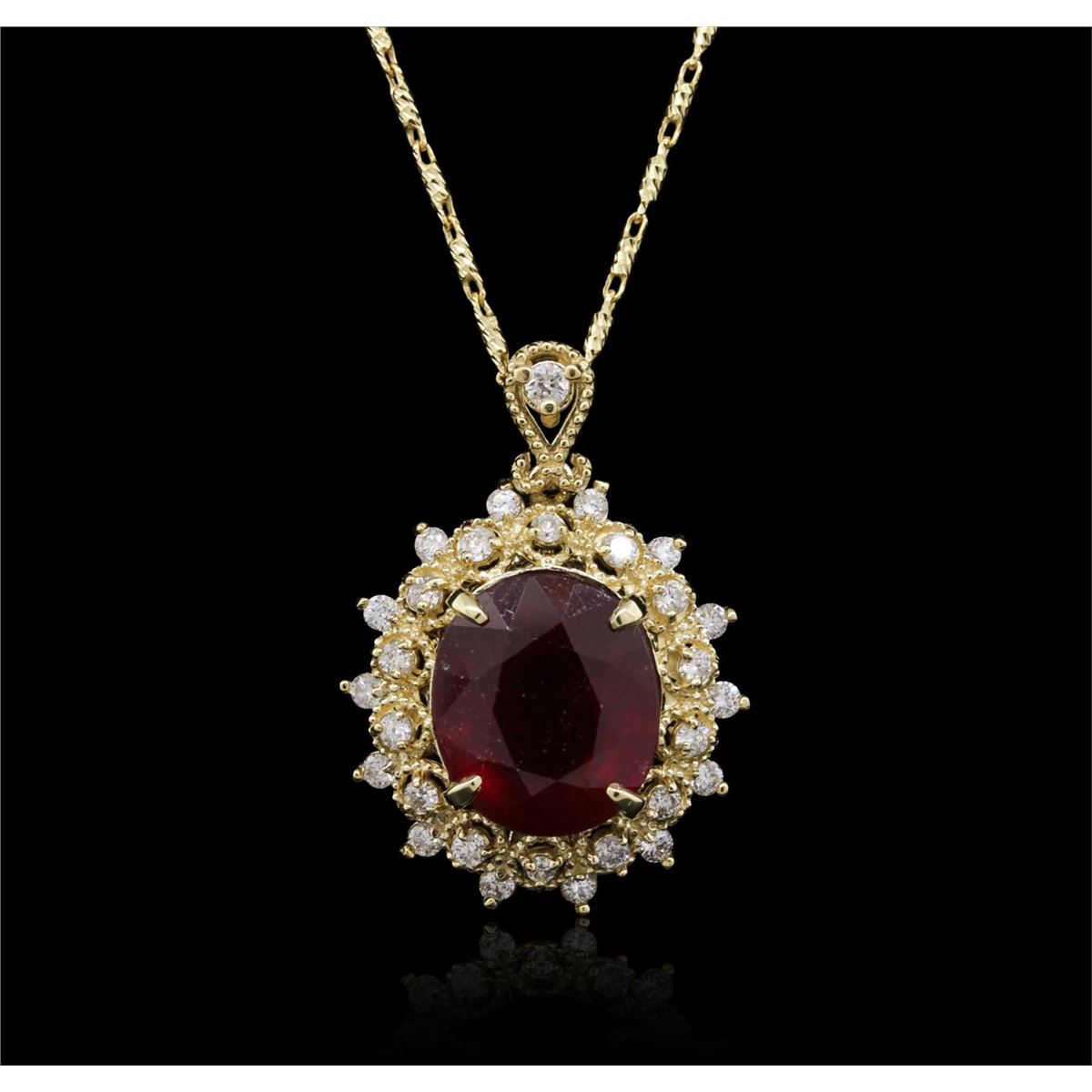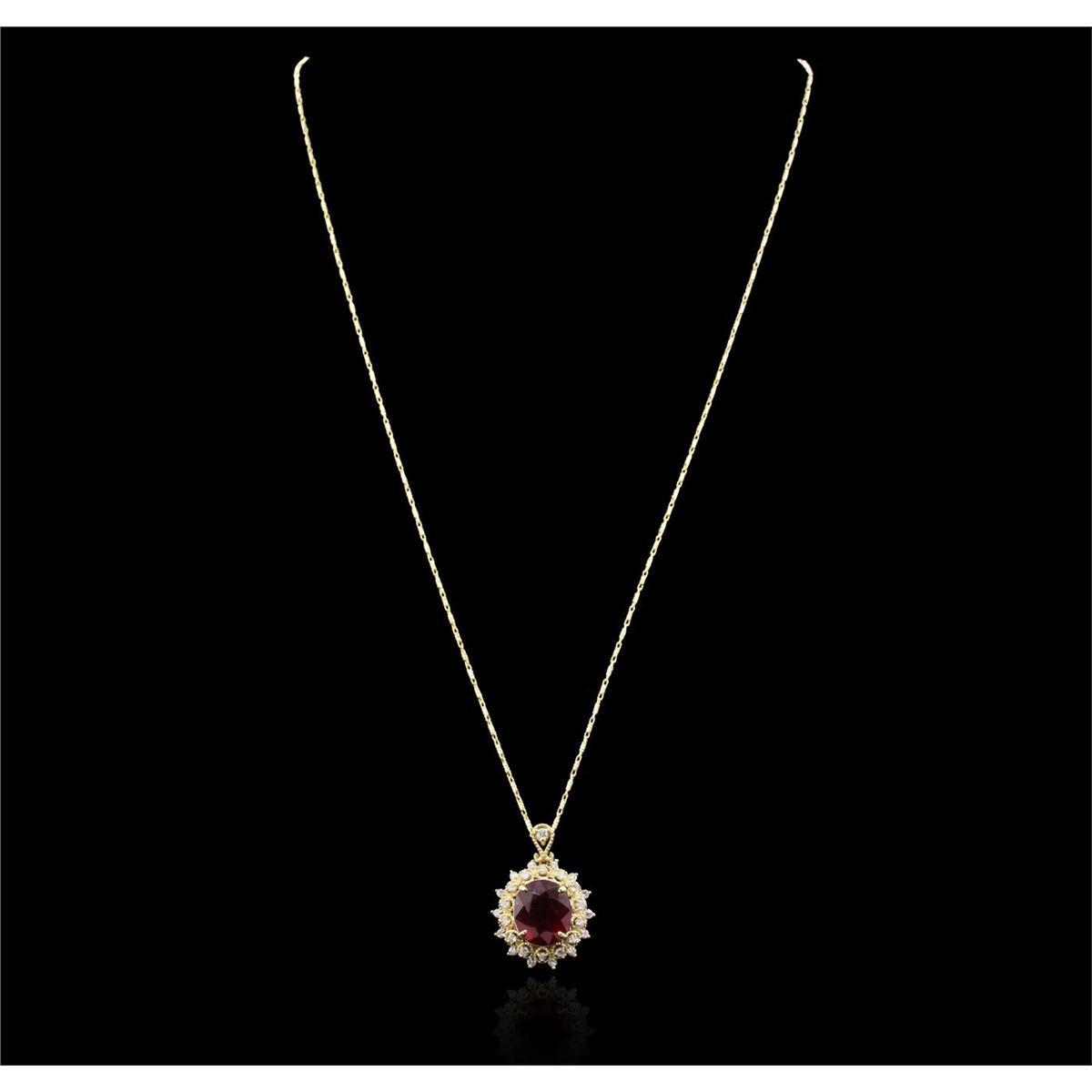 One electronically tested 14KT yellow gold ladies combination cast & assembled ruby and diamond pendant & chain 18.0" long, fancy link with a lobster claw clasp with a bright polish finish. Identified with markings of "14K". Condition is new. Containing: One prong set oval modified brilliant cut natural ruby, measuring 12.30 x 10.50 x 7.10mm, approximate weight of 7.80ct., clarity is heavily included, medium, moderately strong, strongly purplish red color, (GIA stpR 5/4), cut is good. Twenty-Nine prong set round brilliant cut diamonds, measuring 1.50 - 1.50 x 0.90mm (depth est.) approximate total weight of 29 Stones = 0.36ct. Clarity: I-1 to I-2. Color: I - J, Cut is Good. Colored gemstones are presumed to have been subjected to commonly used enhancement processes. All diamonds and colored gemstones are graded in the mounting, unless otherwise stated. Total Weight of Colored Stones 7.80ct. Total Weight of Diamonds 0.36ct. Total Weight of Pendant & Chain 7.80 grams. GGL Appraised at $5,225.00.