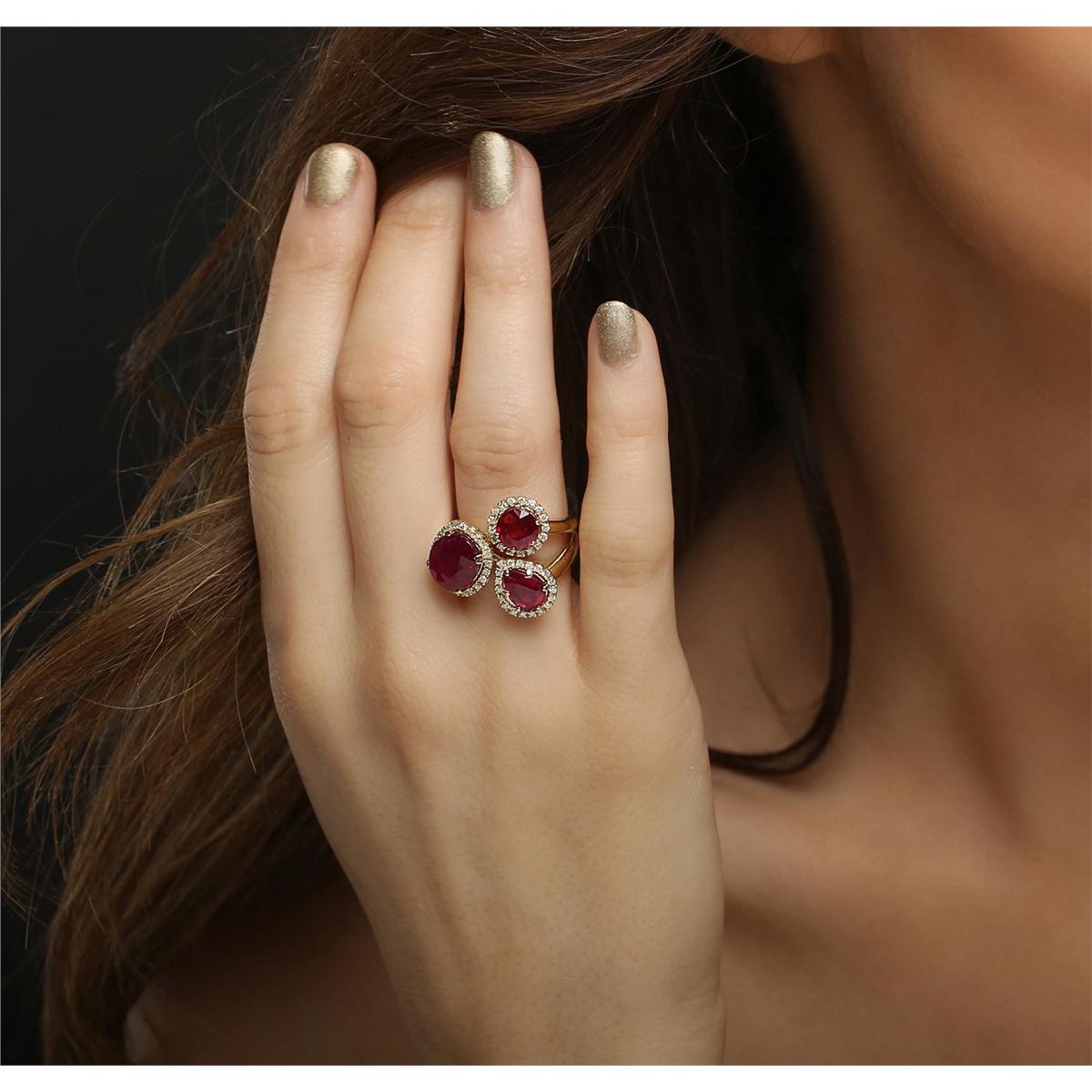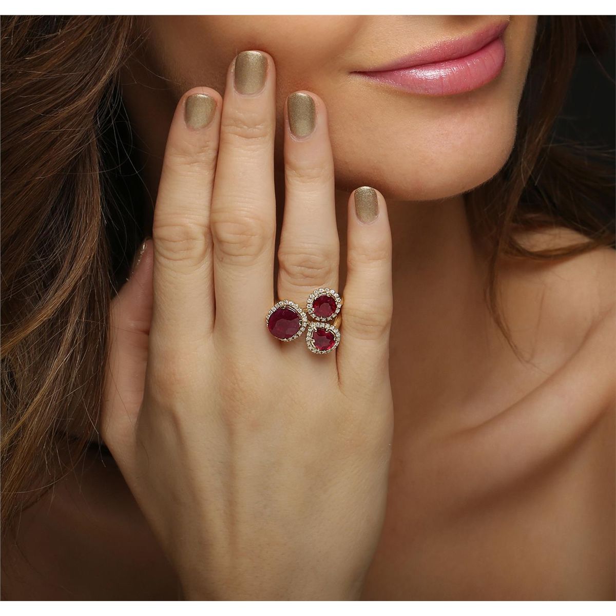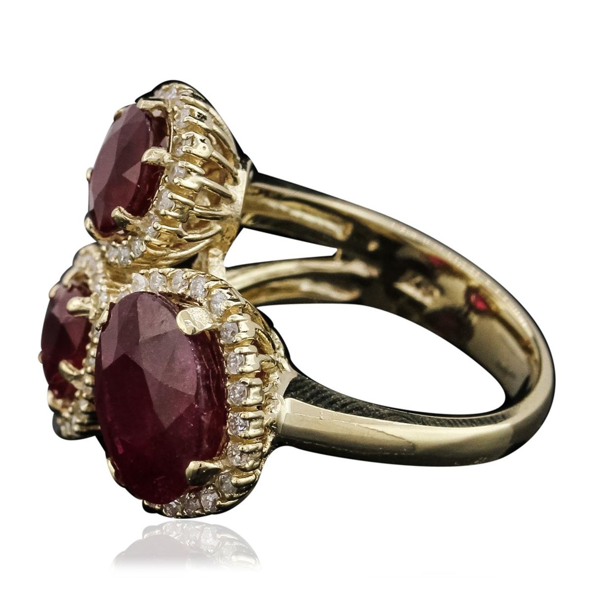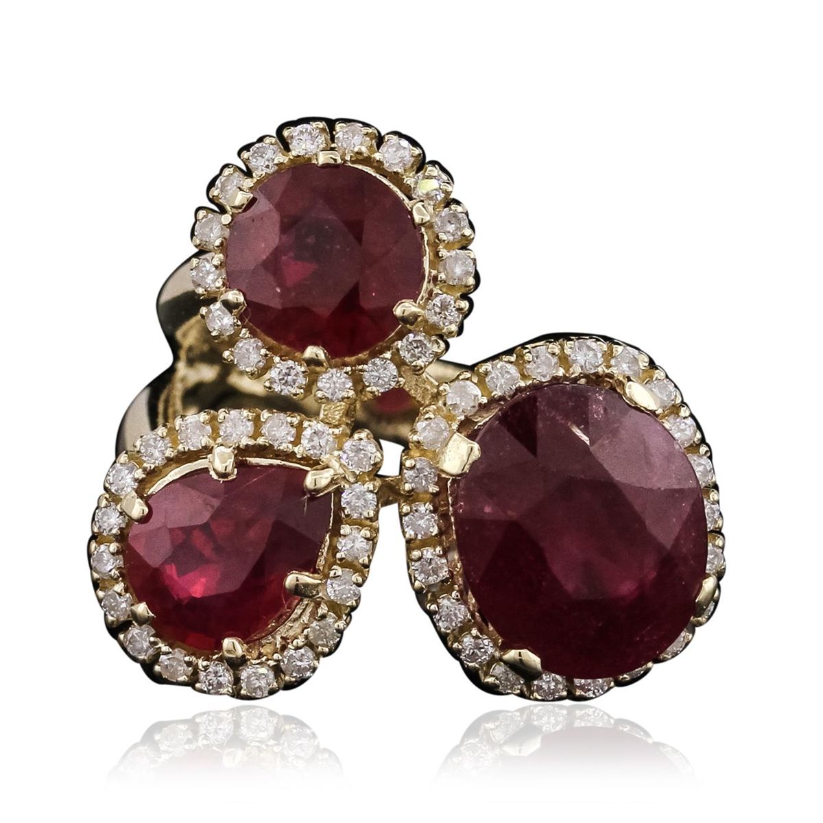 One electronically tested 14KT yellow gold ladies cast ruby and diamond ring with a bright polish finish. The ring features a trio of ruby and diamond bezels supported by split shoulders, completed by a three and one-half millimeter wide band. Identified with markings of "14K". Condition is new, good workmanship. Containing: Three prong set oval, pear and round mixed cut natural rubies approximate total weight of 7.81ct., clarity is heavily included, type II, medium dark, very slightly brownish, slightly purplish red color, (GIA slpR 6/3), cut is good. Transmitting light somewhat diffusely, transparent to translucent. Naturally occurring internal & external characteristics are present. Indications of laboratory high temperature heat treatment, with glass & flux additives. Color grade is an average for the group. Graded in the setting. Ruby has a low tolerance to rhodium plating, repolishing the surface, & ultrasonic cleaning. Fifty-Eight prong set round brilliant cut diamonds, measuring 1.30 - 1.20 x 0.75mm (depth est.) approximate total weight of 58 Stones = 0.51ct. Graded in the setting. Clarity: SI-1 to I-1. Color: G - I. Total Weight of Colored Stones 7.81ct. Total Weight of Diamonds 0.51ct. Total Weight of Ring 9.64 grams. AIG Appraised at $4,835.00.