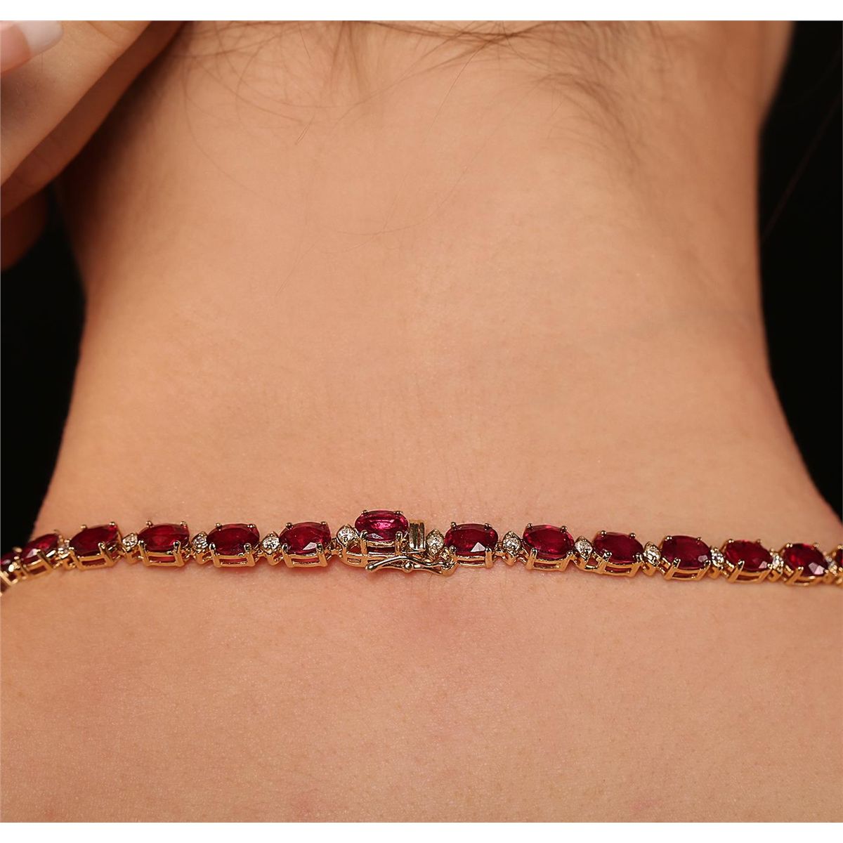 One electronically tested 14KT yellow gold ladies cast & assembled ruby and diamond necklace with a bright polish finish. Condition is new, good workmanship. Seventeen inch length necklace features a ruby and diamond floral pendant supported by a ribbon of rubies and diamonds and terminating in a concealed clasp with safety. Identified with markings of "K14". Containing: One prong set oval mixed cut natural ruby, measuring 13.90 x 11.80 x 7.67mm, 8% bulge factor, approximate weight of 10.94ct. with a medium Blue fluorescence, clarity is heavily included, type II, dark, very slightly brownish, slightly purplish red color, (GIA slpR 7/3), cut is good. Transmitting light somewhat diffusely, transparent to translucent. Naturally occurring internal & external characteristics are present. Indications of laboratory high temperature heat treatment, with glass & flux additives. Colored Stone Grading Report attached. Graded in the setting. Sixty-one prong set oval mixed cut natural rubies, measuring 7.00 x 5.00 x 3.25mm, 6% bulge factor, approximate. Total Weight of 60.39ct, clarity is heavily included, type II, dark, very slightly brownish, slightly purplish red color, (GIA slpR 7/3), cut is good. Transmitting light somewhat diffusely, transparent to translucent. Naturally occurring internal & external characteristics are present. Indications of laboratory high temperature heat treatment, with glass & flux additives. Measurements & the color grade are an average for the group. Graded in the setting. Ruby has a low tolerance to rhodium plating, repolishing the surface, & ultrasonic cleaning. One Hundred Three prong set round brilliant cut diamonds, measuring 3.10 - 2.10 x 1.56mm (depth est.) approximate. Total Weight of 103 Stones = 6.73ct. The color grade reflects the entire range of color for this group. Graded in the setting. Clarity: SI-2 to I-2. Color: G - J. Total Weight of Colored Stones 71.33ct. Total Weight of Diamonds 6.73ct. Total Weight of Necklace 51.90 grams. AIG Appraised at $38,075.00.