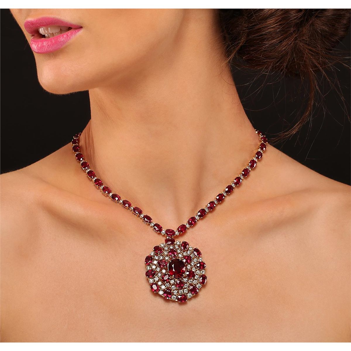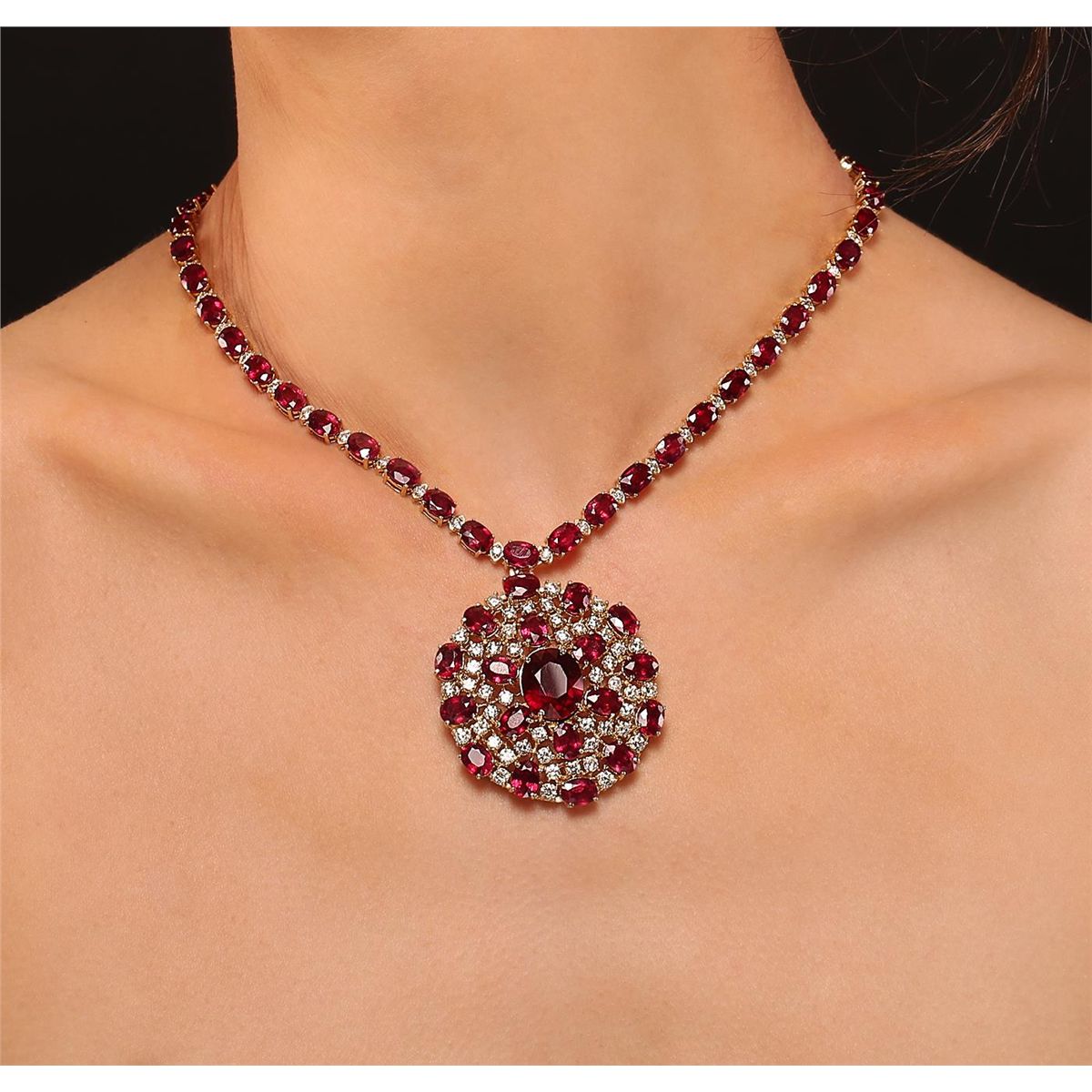 One electronically tested 14KT yellow gold ladies cast & assembled ruby and diamond necklace with a bright polish finish. Condition is new, good workmanship. Seventeen inch length necklace features a ruby and diamond floral pendant supported by a ribbon of rubies and diamonds and terminating in a concealed clasp with safety. Identified with markings of "K14". Containing: One prong set oval mixed cut natural ruby, measuring 13.90 x 11.80 x 7.67mm, 8% bulge factor, approximate weight of 10.94ct. with a medium Blue fluorescence, clarity is heavily included, type II, dark, very slightly brownish, slightly purplish red color, (GIA slpR 7/3), cut is good. Transmitting light somewhat diffusely, transparent to translucent. Naturally occurring internal & external characteristics are present. Indications of laboratory high temperature heat treatment, with glass & flux additives. Colored Stone Grading Report attached. Graded in the setting. Sixty-one prong set oval mixed cut natural rubies, measuring 7.00 x 5.00 x 3.25mm, 6% bulge factor, approximate. Total Weight of 60.39ct, clarity is heavily included, type II, dark, very slightly brownish, slightly purplish red color, (GIA slpR 7/3), cut is good. Transmitting light somewhat diffusely, transparent to translucent. Naturally occurring internal & external characteristics are present. Indications of laboratory high temperature heat treatment, with glass & flux additives. Measurements & the color grade are an average for the group. Graded in the setting. Ruby has a low tolerance to rhodium plating, repolishing the surface, & ultrasonic cleaning. One Hundred Three prong set round brilliant cut diamonds, measuring 3.10 - 2.10 x 1.56mm (depth est.) approximate. Total Weight of 103 Stones = 6.73ct. The color grade reflects the entire range of color for this group. Graded in the setting. Clarity: SI-2 to I-2. Color: G - J. Total Weight of Colored Stones 71.33ct. Total Weight of Diamonds 6.73ct. Total Weight of Necklace 51.90 grams. AIG Appraised at $38,075.00.