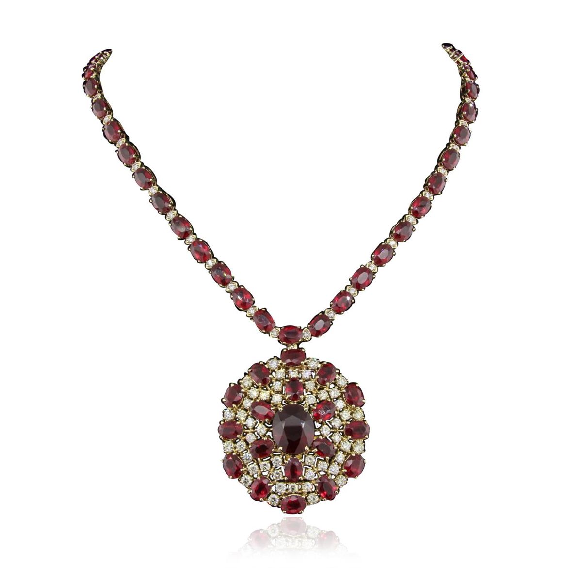 One electronically tested 14KT yellow gold ladies cast & assembled ruby and diamond necklace with a bright polish finish. Condition is new, good workmanship. Seventeen inch length necklace features a ruby and diamond floral pendant supported by a ribbon of rubies and diamonds and terminating in a concealed clasp with safety. Identified with markings of "K14". Containing: One prong set oval mixed cut natural ruby, measuring 13.90 x 11.80 x 7.67mm, 8% bulge factor, approximate weight of 10.94ct. with a medium Blue fluorescence, clarity is heavily included, type II, dark, very slightly brownish, slightly purplish red color, (GIA slpR 7/3), cut is good. Transmitting light somewhat diffusely, transparent to translucent. Naturally occurring internal & external characteristics are present. Indications of laboratory high temperature heat treatment, with glass & flux additives. Colored Stone Grading Report attached. Graded in the setting. Sixty-one prong set oval mixed cut natural rubies, measuring 7.00 x 5.00 x 3.25mm, 6% bulge factor, approximate. Total Weight of 60.39ct, clarity is heavily included, type II, dark, very slightly brownish, slightly purplish red color, (GIA slpR 7/3), cut is good. Transmitting light somewhat diffusely, transparent to translucent. Naturally occurring internal & external characteristics are present. Indications of laboratory high temperature heat treatment, with glass & flux additives. Measurements & the color grade are an average for the group. Graded in the setting. Ruby has a low tolerance to rhodium plating, repolishing the surface, & ultrasonic cleaning. One Hundred Three prong set round brilliant cut diamonds, measuring 3.10 - 2.10 x 1.56mm (depth est.) approximate. Total Weight of 103 Stones = 6.73ct. The color grade reflects the entire range of color for this group. Graded in the setting. Clarity: SI-2 to I-2. Color: G - J. Total Weight of Colored Stones 71.33ct. Total Weight of Diamonds 6.73ct. Total Weight of Necklace 51.90 grams. AIG Appraised at $38,075.00.