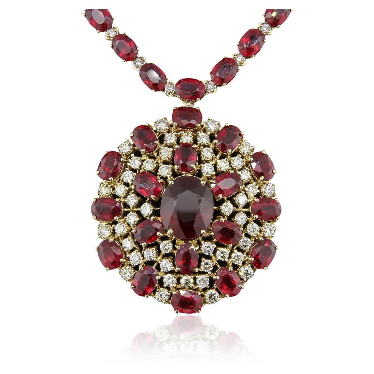 One electronically tested 14KT yellow gold ladies cast & assembled ruby and diamond necklace with a bright polish finish. Condition is new, good workmanship. Seventeen inch length necklace features a ruby and diamond floral pendant supported by a ribbon of rubies and diamonds and terminating in a concealed clasp with safety. Identified with markings of "K14". Containing: One prong set oval mixed cut natural ruby, measuring 13.90 x 11.80 x 7.67mm, 8% bulge factor, approximate weight of 10.94ct. with a medium Blue fluorescence, clarity is heavily included, type II, dark, very slightly brownish, slightly purplish red color, (GIA slpR 7/3), cut is good. Transmitting light somewhat diffusely, transparent to translucent. Naturally occurring internal & external characteristics are present. Indications of laboratory high temperature heat treatment, with glass & flux additives. Colored Stone Grading Report attached. Graded in the setting. Sixty-one prong set oval mixed cut natural rubies, measuring 7.00 x 5.00 x 3.25mm, 6% bulge factor, approximate. Total Weight of 60.39ct, clarity is heavily included, type II, dark, very slightly brownish, slightly purplish red color, (GIA slpR 7/3), cut is good. Transmitting light somewhat diffusely, transparent to translucent. Naturally occurring internal & external characteristics are present. Indications of laboratory high temperature heat treatment, with glass & flux additives. Measurements & the color grade are an average for the group. Graded in the setting. Ruby has a low tolerance to rhodium plating, repolishing the surface, & ultrasonic cleaning. One Hundred Three prong set round brilliant cut diamonds, measuring 3.10 - 2.10 x 1.56mm (depth est.) approximate. Total Weight of 103 Stones = 6.73ct. The color grade reflects the entire range of color for this group. Graded in the setting. Clarity: SI-2 to I-2. Color: G - J. Total Weight of Colored Stones 71.33ct. Total Weight of Diamonds 6.73ct. Total Weight of Necklace 51.90 grams. AIG Appraised at $38,075.00.