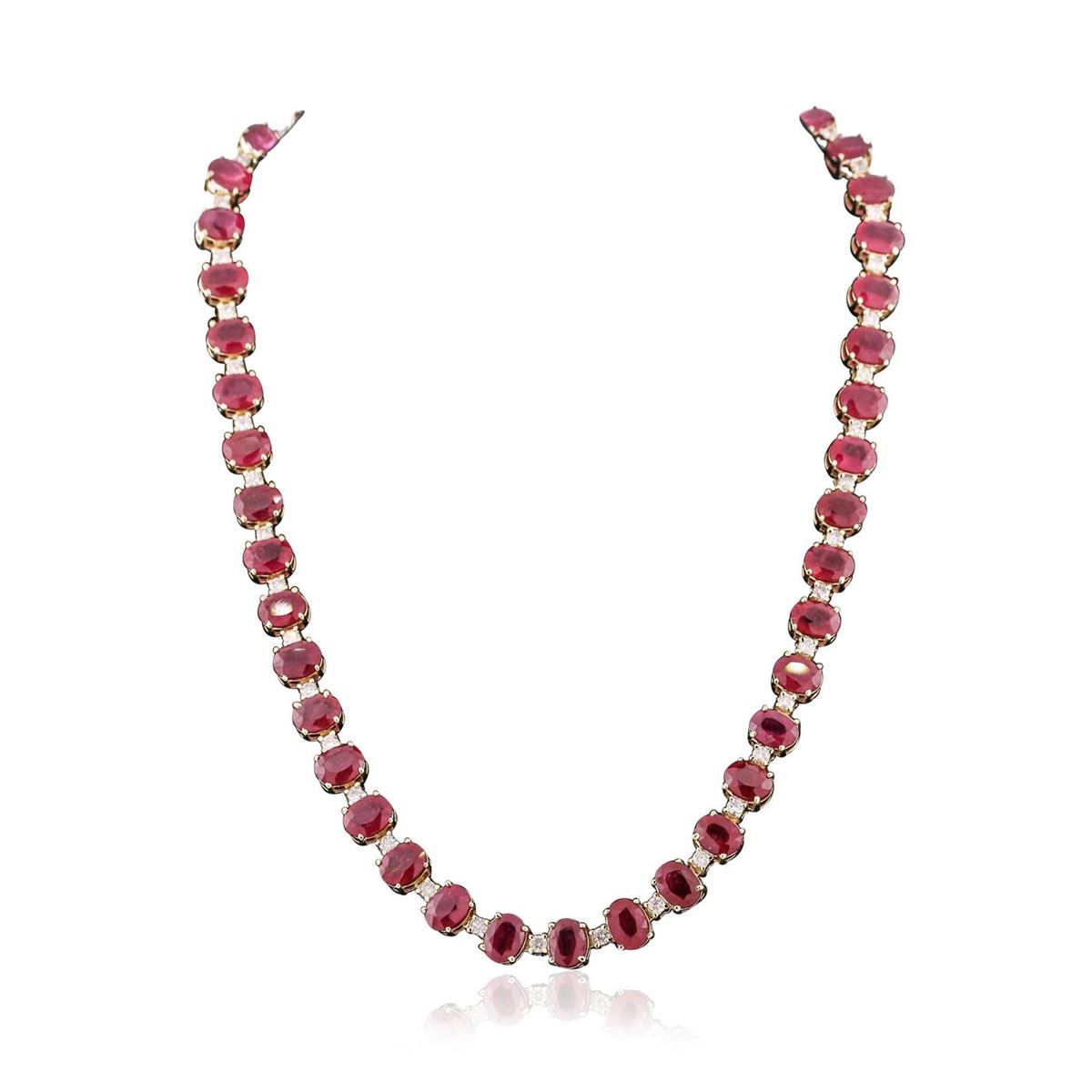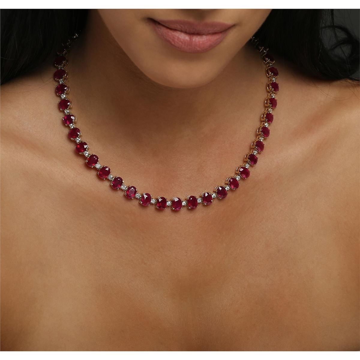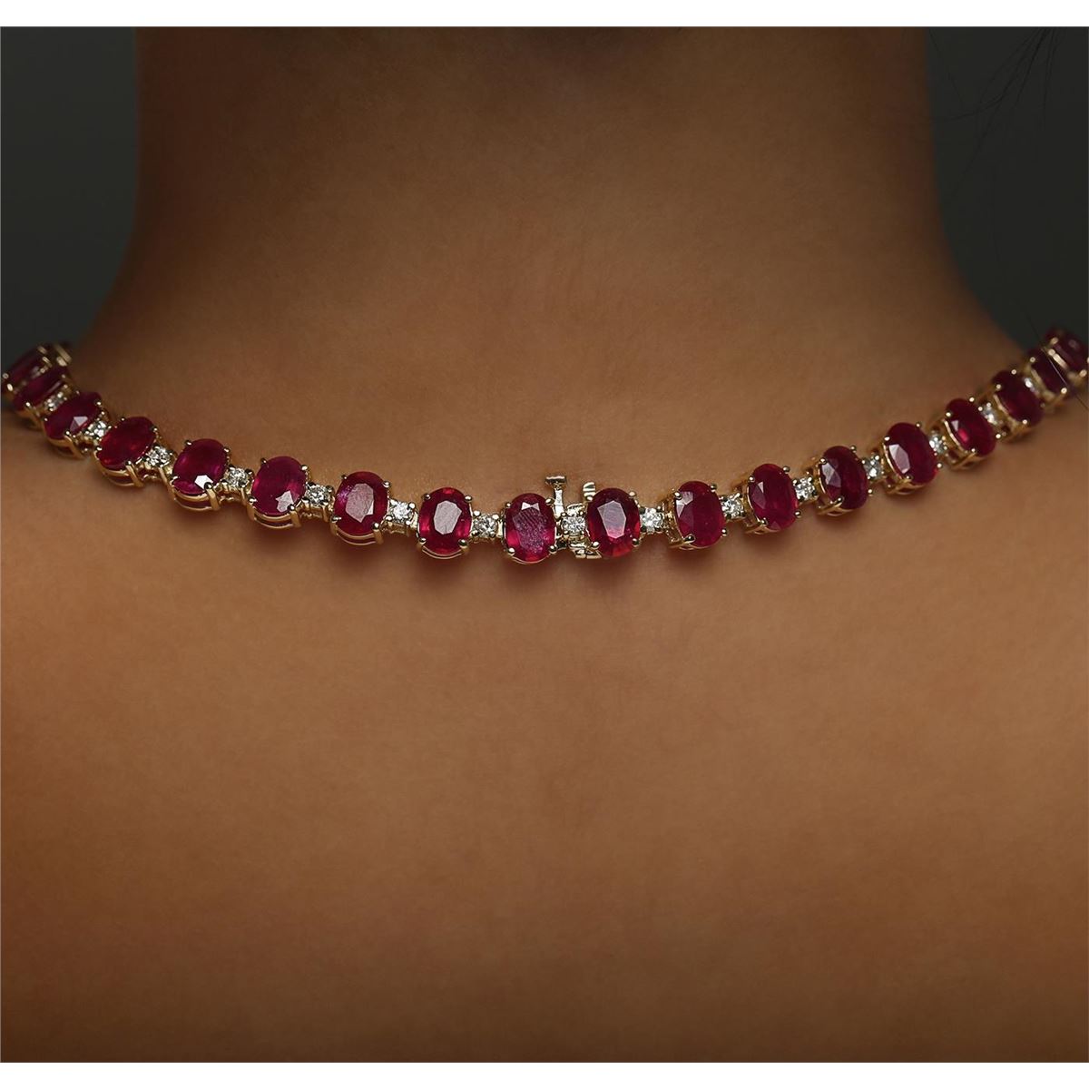 One electronically tested 14KT yellow gold ladies combination cast & assembled necklace with a hidden box clasp with a bright polish finish. Measurements: 17" in length. Identified with markings of "14K". Condition is new. Containing: Forty-four prong set oval modified brilliant cut natural rubies, measuring 8.11 x 6.11 x 4.14mm, approximate total weight of 73.48ct., clarity is heavily included, type II, medium, moderately strong, strongly purplish red color, (GIA stpR 5/4), cut is good. Forty-Four prong set round brilliant cut diamonds, measuring 2.50 - 2.50 x 1.50mm (depth est.) approximate total weight of 44 Stones = 2.51ct. Clarity: SI-2 to I-2. Color: J - K, Cut is Good. Colored gemstones are presumed to have been subjected to commonly used enhancement processes. All diamonds and colored gemstones are graded in the mounting, unless otherwise stated. Total Weight of Colored Stones 73.48ct. Total Weight of Diamonds 2.51ct. Total Weight of Necklace 47.90 grams. GGL Appraised at $23,090.00.