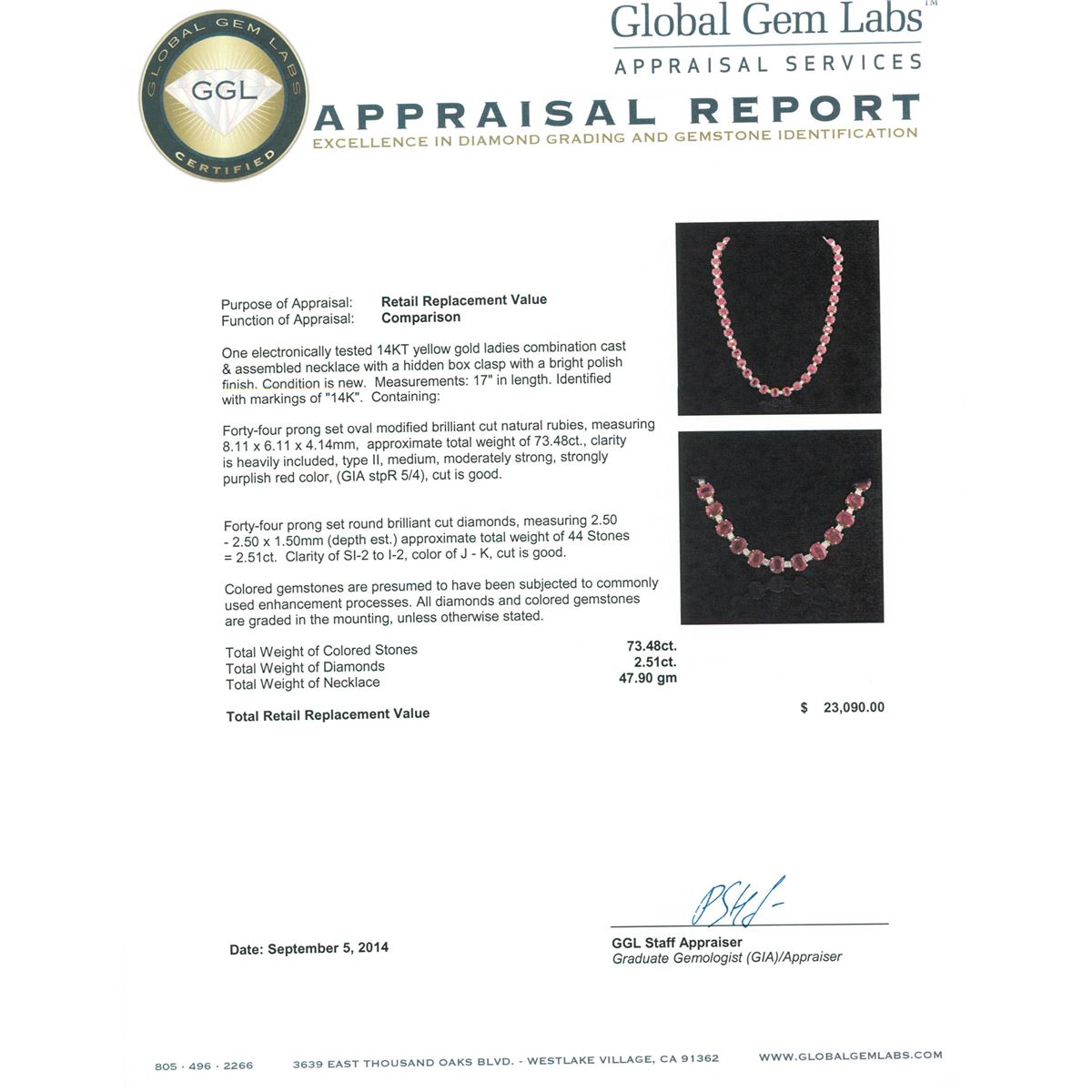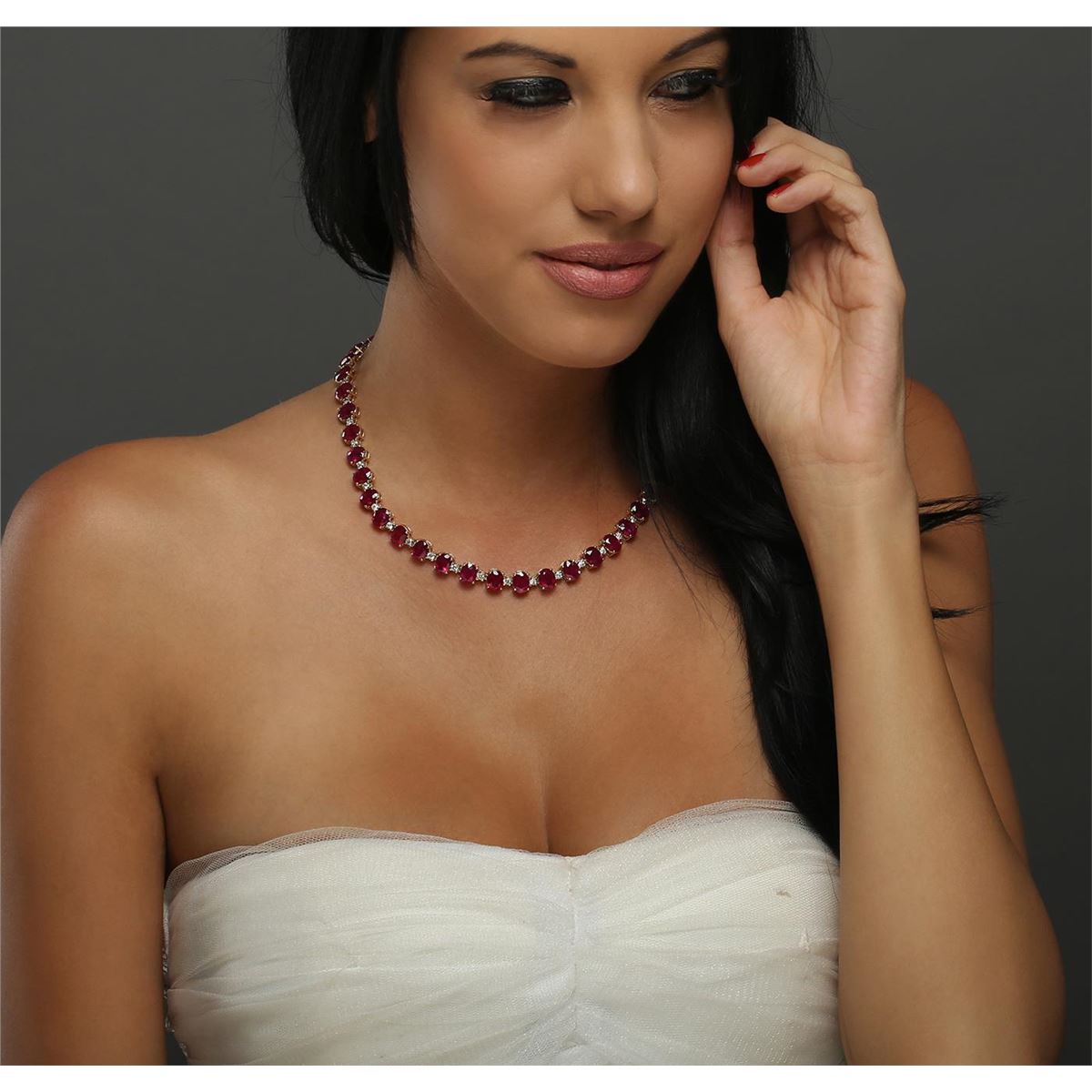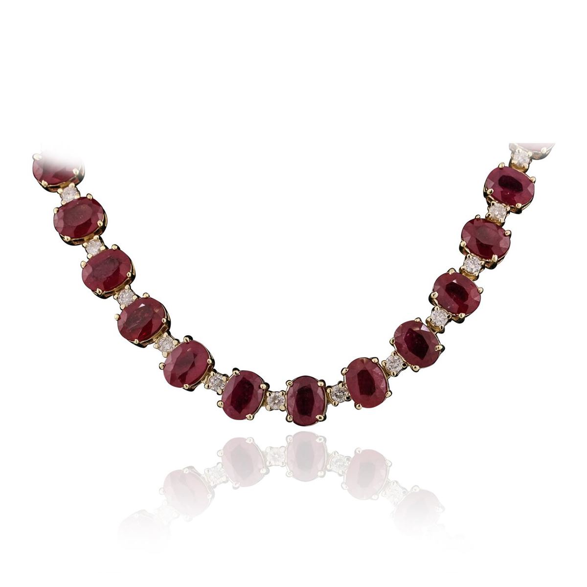 One electronically tested 14KT yellow gold ladies combination cast & assembled necklace with a hidden box clasp with a bright polish finish. Measurements: 17" in length. Identified with markings of "14K". Condition is new. Containing: Forty-four prong set oval modified brilliant cut natural rubies, measuring 8.11 x 6.11 x 4.14mm, approximate total weight of 73.48ct., clarity is heavily included, type II, medium, moderately strong, strongly purplish red color, (GIA stpR 5/4), cut is good. Forty-Four prong set round brilliant cut diamonds, measuring 2.50 - 2.50 x 1.50mm (depth est.) approximate total weight of 44 Stones = 2.51ct. Clarity: SI-2 to I-2. Color: J - K, Cut is Good. Colored gemstones are presumed to have been subjected to commonly used enhancement processes. All diamonds and colored gemstones are graded in the mounting, unless otherwise stated. Total Weight of Colored Stones 73.48ct. Total Weight of Diamonds 2.51ct. Total Weight of Necklace 47.90 grams. GGL Appraised at $23,090.00.
