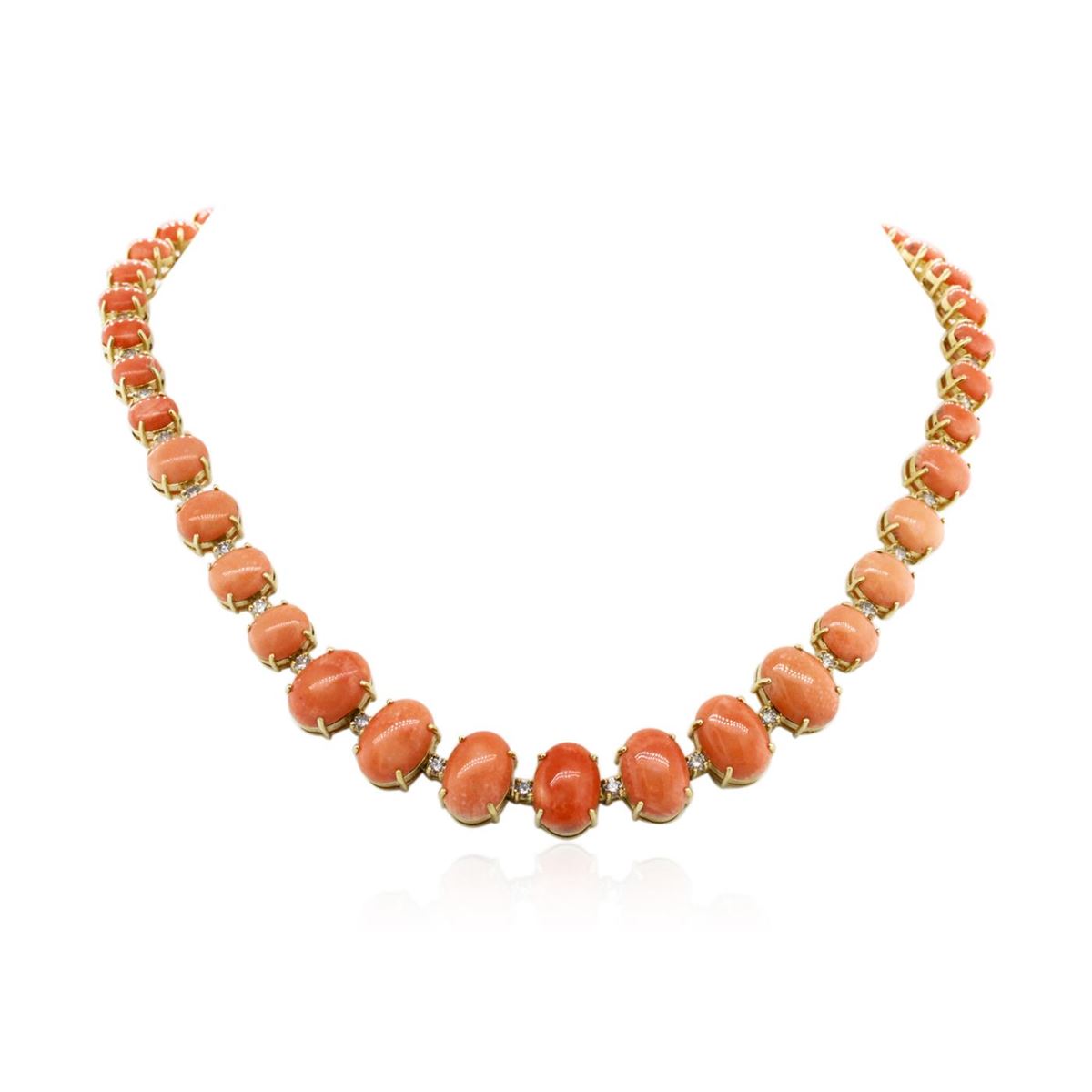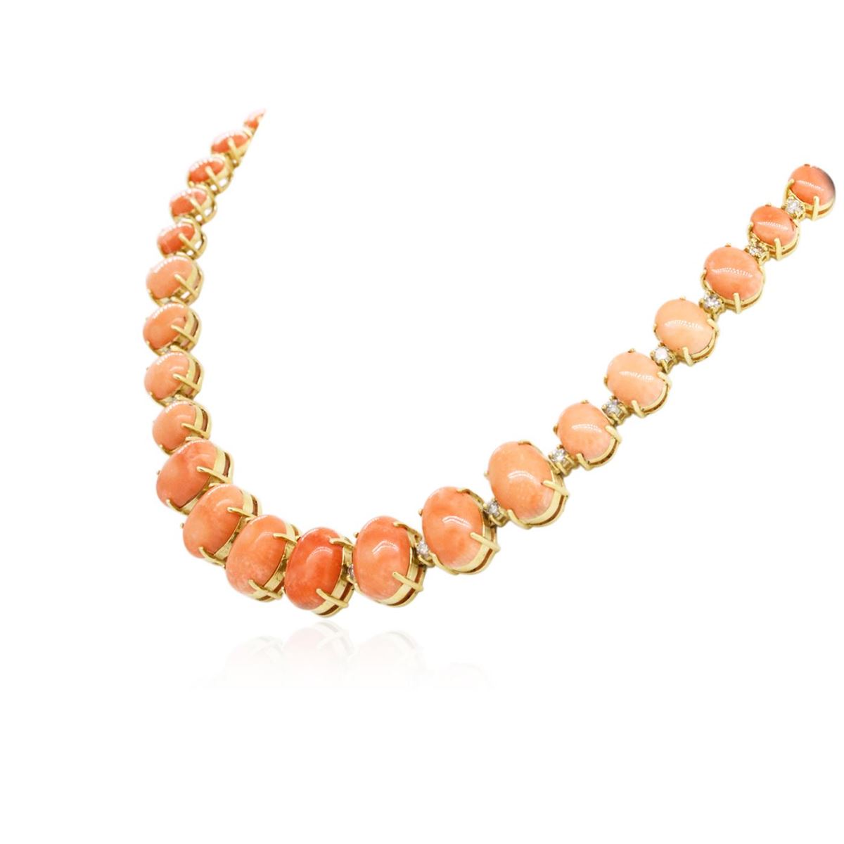 One electronically tested 14KT yellow gold Ladies combination cast & assembled necklace with a hidden box clasp with a bright polish finish. Condition is new. Measurements: 18" in length. Identified with markings of "14K". Containing: Seven prong set oval cabochon cut natural pink corals, measuring 14.00 x 10.00 x 4.50mm, approximate. Total Weight of 31.57ct., clarity is heavily included, medium light, moderately strong, pink color, (GIA Pk 4/4), cut is very good. Fourteen prong set oval cabochon cut natural pink corals, measuring 10.00 x 7.56 x 3.40mm, approximate. Total Weight of 25.76ct., clarity is heavily included, medium light, moderately strong, pink color, (GIA Pk 4/4), cut is very good. Twenty prong set oval cabochon cut natural pink corals, measuring 7.73 x 6.00 x 2.70mm, approximate. Total Weight of 18.00ct., clarity is heavily included, medium light, moderately strong, pink color, (GIA Pk 4/4), cut is very good. Colored gemstones are presumed to have been subjected to commonly used color/clarity enhancement processes. Forty-Two prong set round brilliant cut diamonds, measuring 3.00 - 3.00 x 1.80mm (depth est.) approximate. Total Weight of 42 Stones = 4.15ct. Clarity: I-1 to I-3. Color: I - J, Cut is Good. Total Weight of Colored Stones 75.33ct. Total Weight of Diamonds 4.15ct. Total Weight of Necklace 62.80 grams. GGL Appraised at $54,405.00.
