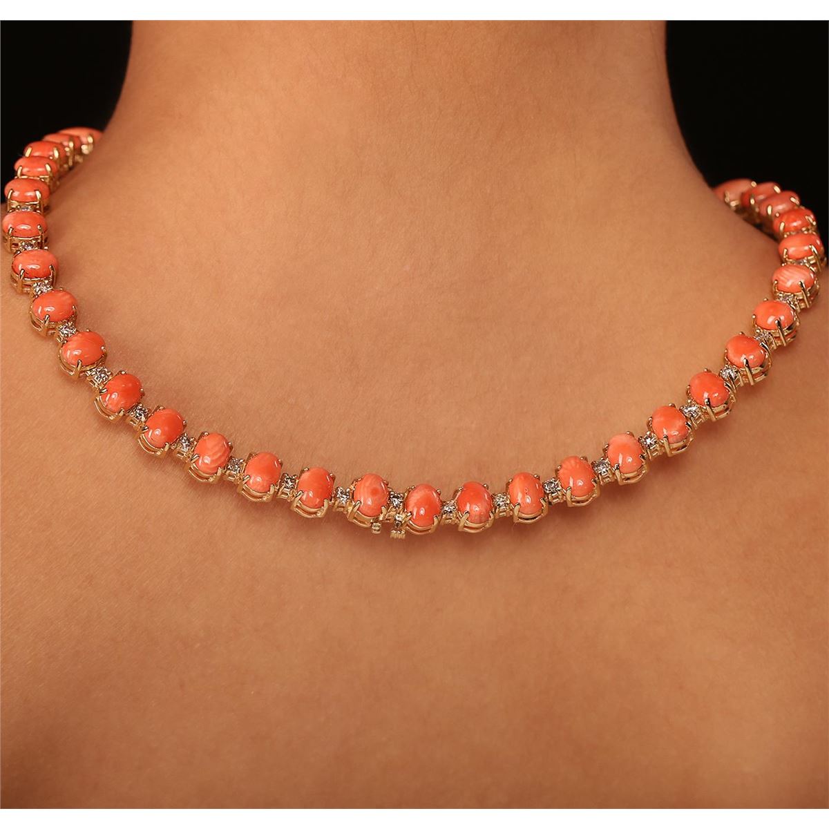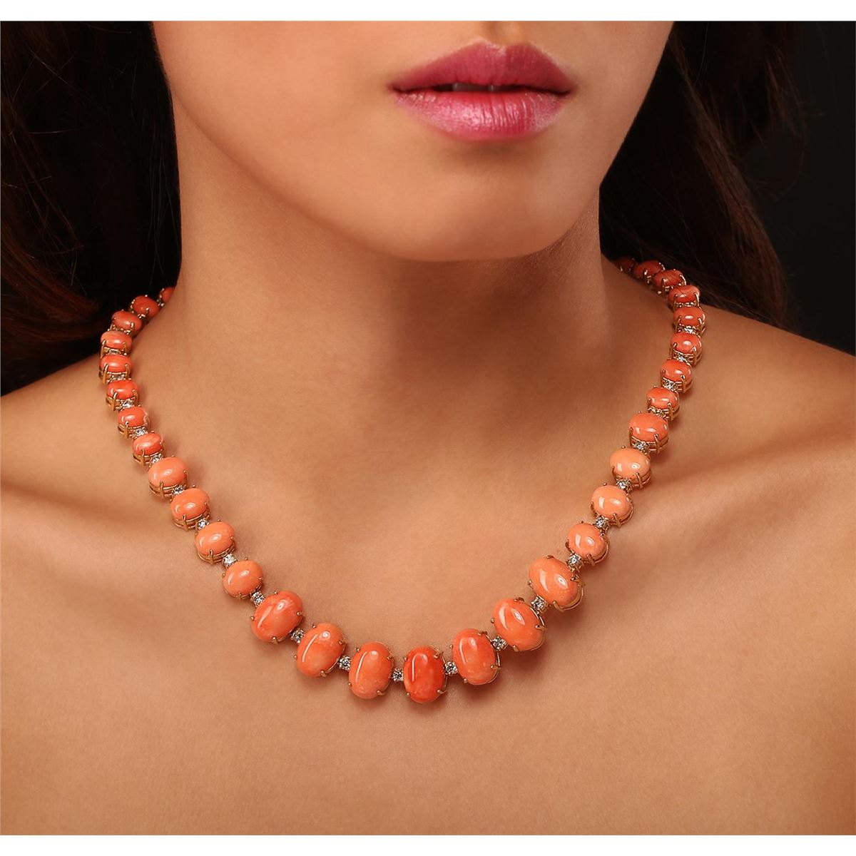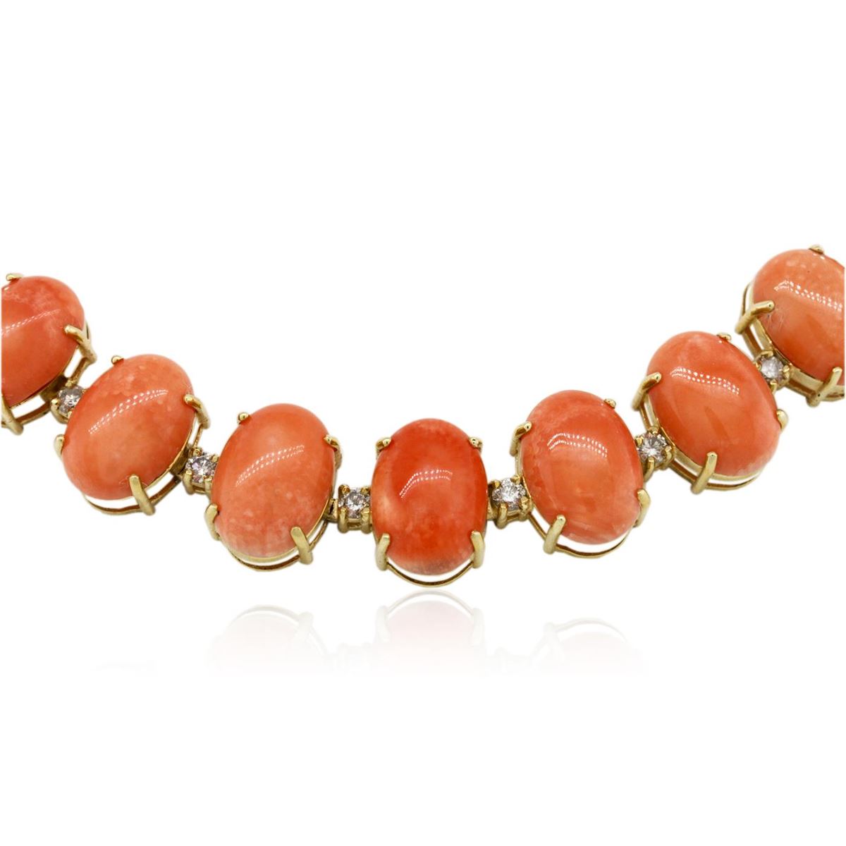 One electronically tested 14KT yellow gold Ladies combination cast & assembled necklace with a hidden box clasp with a bright polish finish. Condition is new. Measurements: 18" in length. Identified with markings of "14K". Containing: Seven prong set oval cabochon cut natural pink corals, measuring 14.00 x 10.00 x 4.50mm, approximate. Total Weight of 31.57ct., clarity is heavily included, medium light, moderately strong, pink color, (GIA Pk 4/4), cut is very good. Fourteen prong set oval cabochon cut natural pink corals, measuring 10.00 x 7.56 x 3.40mm, approximate. Total Weight of 25.76ct., clarity is heavily included, medium light, moderately strong, pink color, (GIA Pk 4/4), cut is very good. Twenty prong set oval cabochon cut natural pink corals, measuring 7.73 x 6.00 x 2.70mm, approximate. Total Weight of 18.00ct., clarity is heavily included, medium light, moderately strong, pink color, (GIA Pk 4/4), cut is very good. Colored gemstones are presumed to have been subjected to commonly used color/clarity enhancement processes. Forty-Two prong set round brilliant cut diamonds, measuring 3.00 - 3.00 x 1.80mm (depth est.) approximate. Total Weight of 42 Stones = 4.15ct. Clarity: I-1 to I-3. Color: I - J, Cut is Good. Total Weight of Colored Stones 75.33ct. Total Weight of Diamonds 4.15ct. Total Weight of Necklace 62.80 grams. GGL Appraised at $54,405.00.