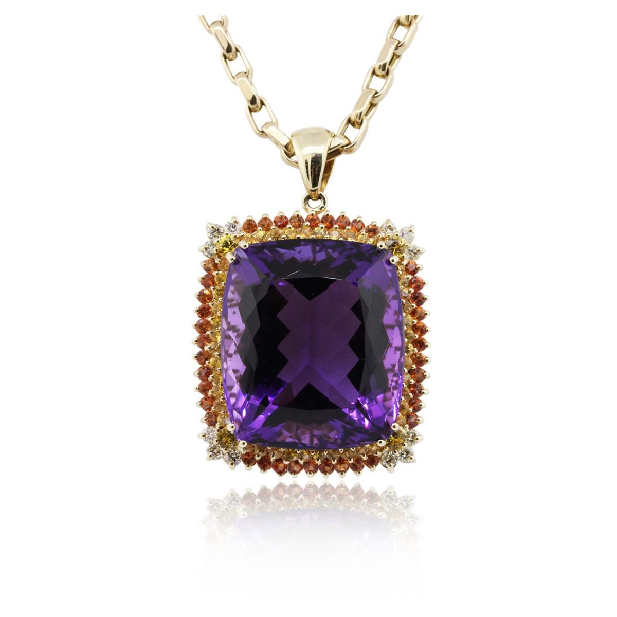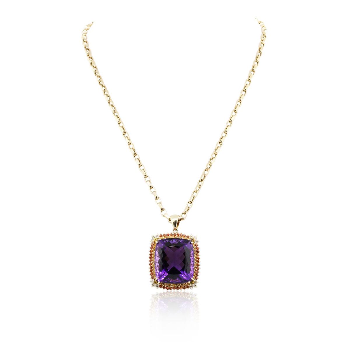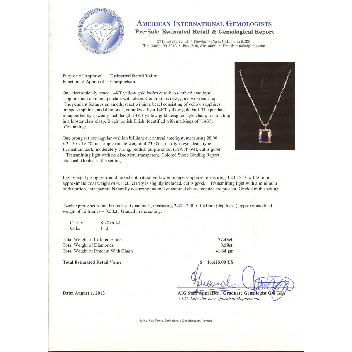 One electronically tested 14KT yellow gold ladies cast & assembled amethyst, sapphire, and diamond pendant with chain. Condition is new, good workmanship. The pendant features an amethyst set within a bezel consisting of yellow sapphires, orange sapphires, and diamonds, completed by a 14KT yellow gold bail. The pendant is supported by a twenty inch length 14KT yellow gold designer style chain, terminating in a lobster claw clasp. Bright polish finish. Identified with markings of "14K". Containing: One prong set rectangular cushion brilliant cut natural amethyst, measuring 28.00 x 24.50 x 16.70mm, approximate weight of 73.30ct., clarity is eye clean, type II, medium dark, moderately strong, reddish purple color, (GIA rP 6/4), cut is good. Transmitting light with no distortion, transparent. Colored Stone Grading Report attached. Graded in the setting. Eighty-eight prong set round mixed cut natural yellow & orange sapphires, measuring 3.20 - 2.10 x 1.50 mm, approximate total weight of 4.13ct., clarity is slightly included, cut is good. Transmitting light with a minimum of distortion, transparent. Naturally occurring internal & external characteristics are present. Graded in the setting. Twelve prong set round brilliant cut diamonds, measuring 2.40 - 2.30 x 1.41mm (depth est.) approximate total weight of 12 Stones = 0.58ct. Graded in the setting. Clarity SI-2 to I-1. Color I - J. Total Weight of Colored Stones 77.43ct. Total Weight of Diamonds 0.58ct. Total Weight of Pendant With Chain 41.64gm. AIG Appraised at $16,625.00.