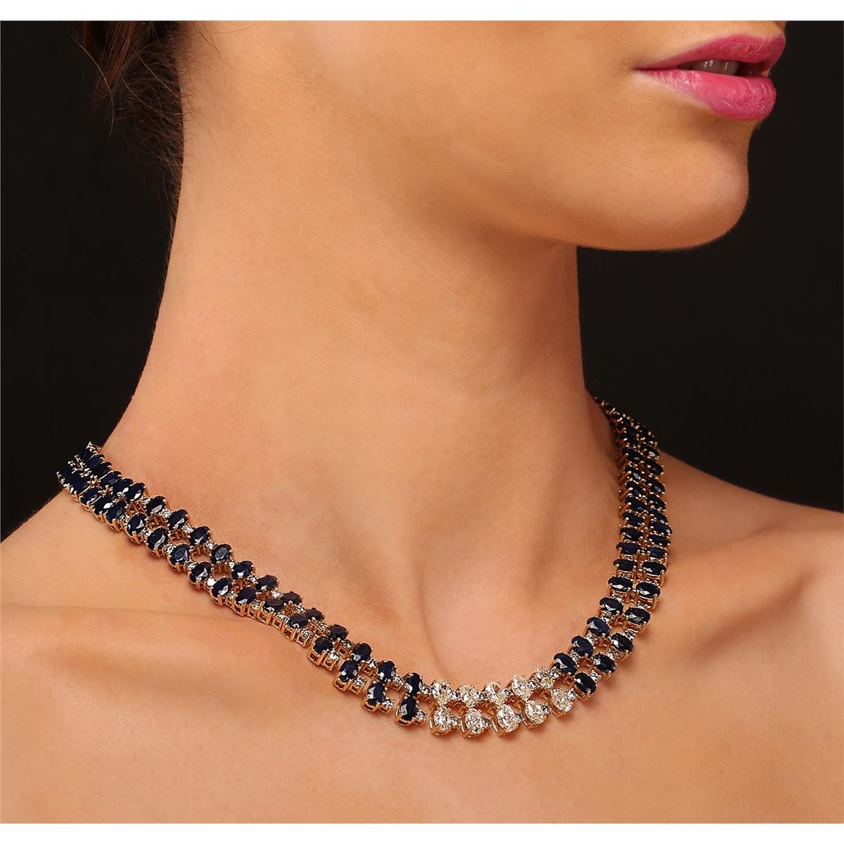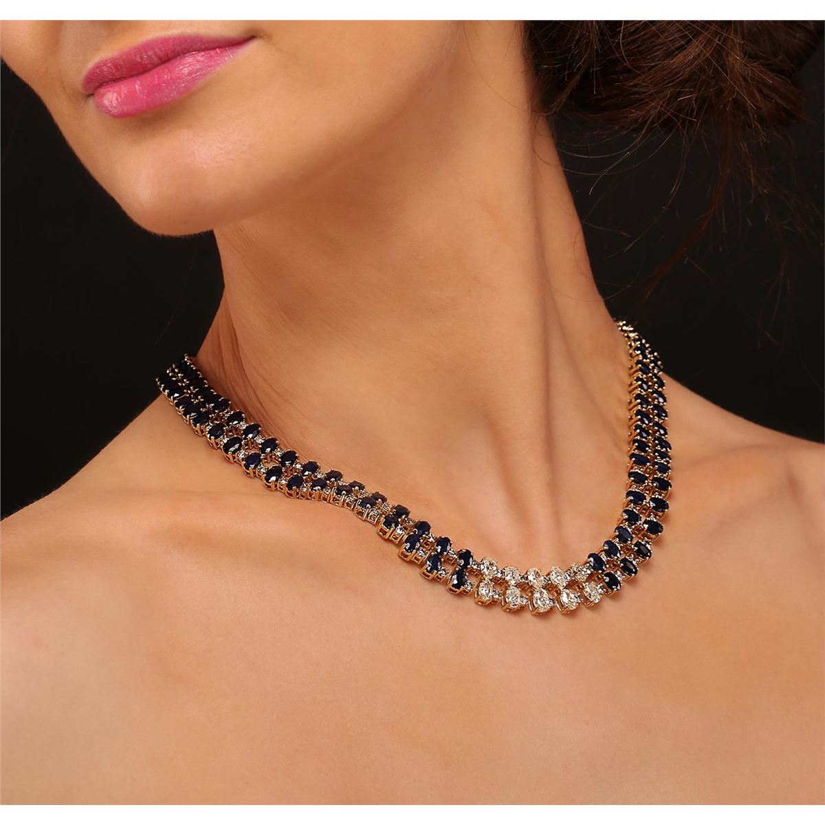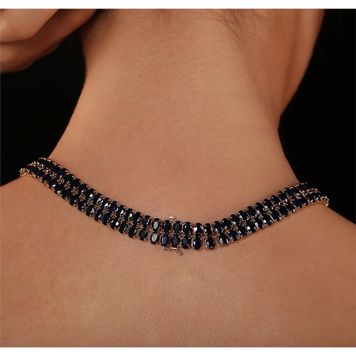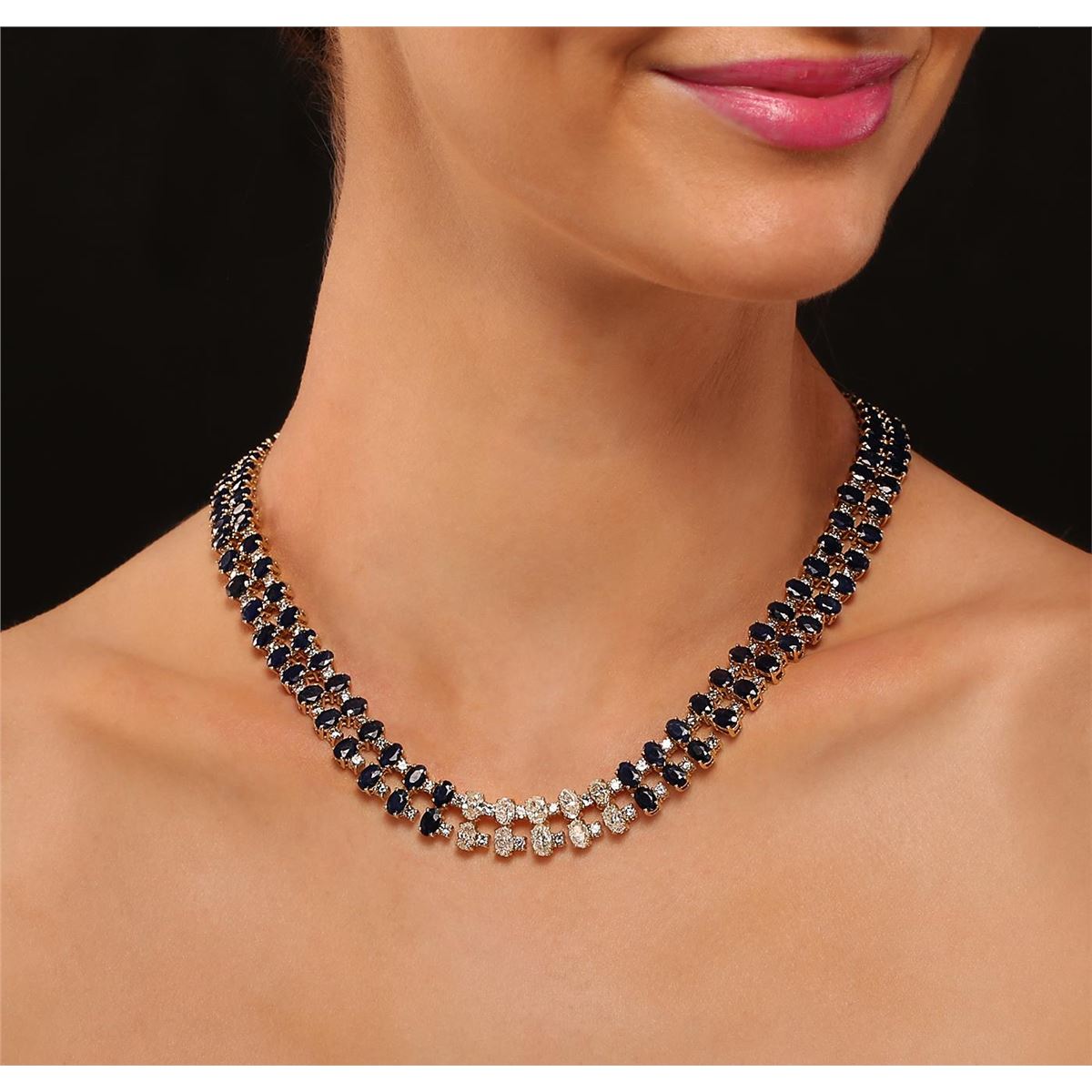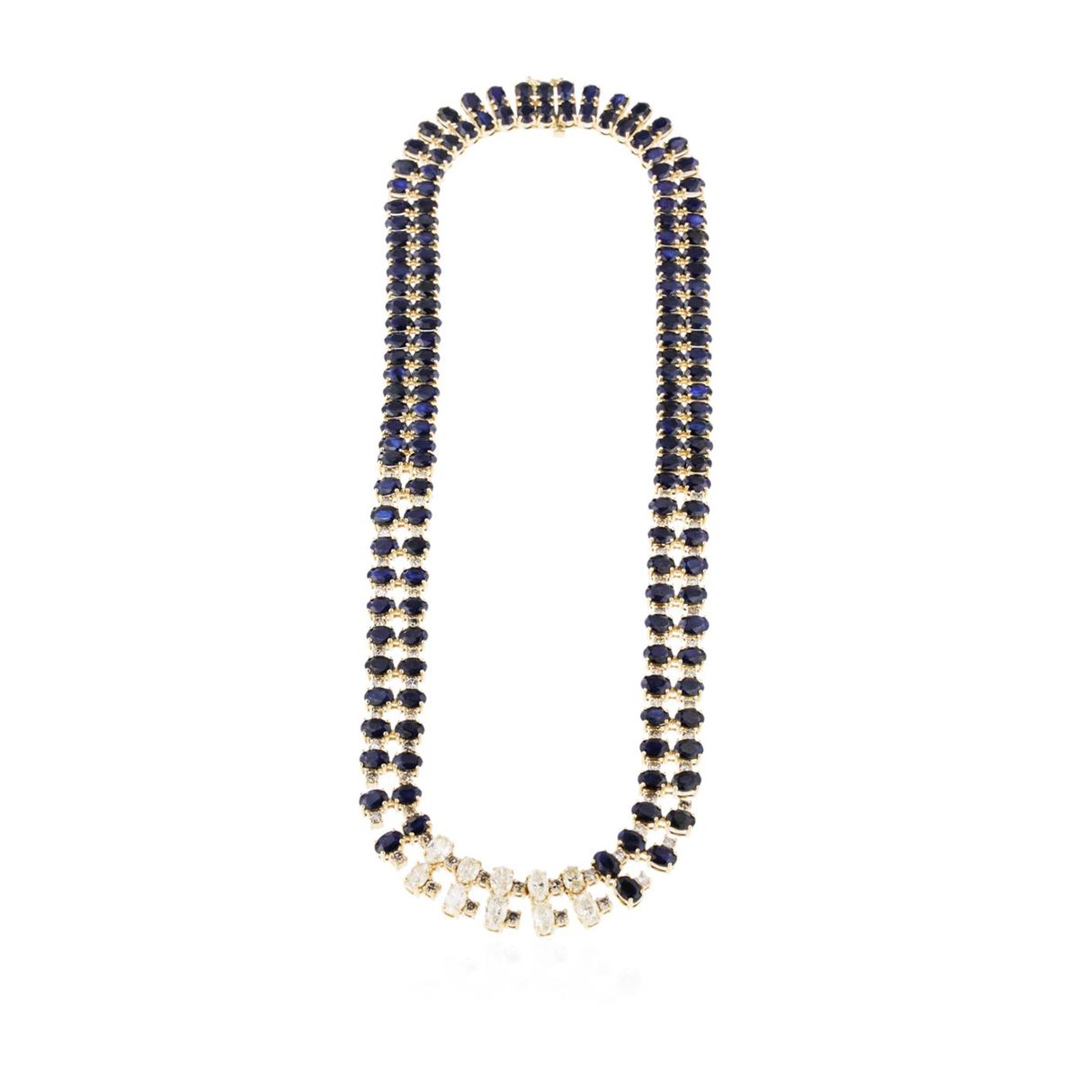 One electronically tested 14KT yellow gold ladies cast & assembled sapphire and diamond necklace with a bright polish finish. Condition is new, good workmanship. Seventeen and one-half inch length necklace features two flexible ribbons consisting of oval sapphires and diamonds interspersed by round brilliant diamonds, terminating in a concealed clasp with safety. Identified with markings of "14K". Containing: One hundred fifty prong set oval mixed cut natural blue sapphires, measuring 6.20 x 4.20 x 2.20mm, 10%. bulge factor, approximate. Total Weight of 78.00ct., clarity is heavily included, type II, dark, moderately strong, violetish blue color, (GIA vB 7/4), cut is good. Transmitting light somewhat diffusely, transparent to translucent. Naturally occurring internal & external characteristics are present. Measurements & the color grade are an average for the group. Indications of multiple laboratory enhancements, including high temperature diffusion treatment. Graded in the setting. Ten prong set oval shaped cut diamonds, measuring 6.20 x 4.20 x 2.65mm (depth est.) approximate. Total Weight of 10 Stones = 4.55ct. Graded in the setting. Clarity: I-1 to I-2. Color: I - K. Sixty-Two prong set round brilliant cut diamonds, measuring 2.60 - 2.50 x 1.53mm (depth est.) approximate. Total Weight of 62 Stones = 3.85ct. Graded in the setting. Clarity: I-1 to I-3. Total Weight of Colored Stones 78.00ct. Total Weight of Diamonds 8.40ct. Total Weight of Necklace 69.92 grams. AIG Appraised at $43,450.00.