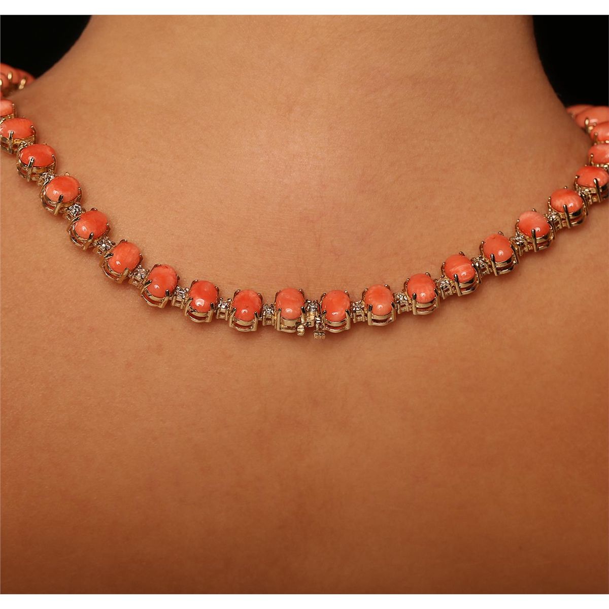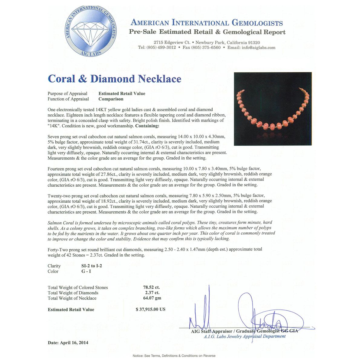 One electronically tested 14KT yellow gold ladies cast & assembled coral and diamond necklace. Condition is new, good workmanship. Eighteen inch length necklace features a flexible tapering coral and diamond ribbon, terminating in a concealed clasp with safety. Bright polish finish. Identified with markings of ""14K"". Containing: Seven prong set oval cabochon cut natural salmon corals, measuring 14.00 x 10.00 x 4.30mm, 5% bulge factor, approximate total weight of 31.74ct., clarity is severely included, medium dark, very slightly brownish, reddish orange color, (GIA rO 6/3), cut is good. Transmitting light very diffusely, opaque. Naturally occurring internal & external characteristics are present. Measurements & the color grade are an average for the group. Graded in the setting. Fourteen prong set oval cabochon cut natural salmon corals, measuring 10.00 x 7.80 x 3.40mm, 5% bulge factor, approximate total weight of 27.86ct., clarity is severely included, medium dark, very slightly brownish, reddish orange color, (GIA rO 6/3), cut is good. Transmitting light very diffusely, opaque. Naturally occurring internal & external characteristics are present. Measurements & the color grade are an average for the group. Graded in the setting. Twenty-two prong set oval cabochon cut natural salmon corals, measuring 7.80 x 5.90 x 2.50mm, 5% bulge factor, approximate total weight of 18.92ct., clarity is severely included, medium dark, very slightly brownish, reddish orange color, (GIA rO 6/3), cut is good. Transmitting light very diffusely, opaque. Naturally occurring internal & external characteristics are present. Measurements & the color grade are an average for the group. Graded in the setting. Salmon Coral is formed undersea by microscopic animals called coral polyps. These tiny, creatures form minute, hard shells. As a colony grows, it takes on complex branching, tree-like forms which allows the maximum number of polyps to be fed by the nutrients in the water. It grows about one quarter inch per year. This color of coral is commonly treated to improve or change the color and stability. Evidence that may confirm this is typically lacking. Forty-Two prong set round brilliant cut diamonds, measuring 2.50 - 2.40 x 1.47mm (depth est.) approximate total weight of 42 Stones = 2.37ct. Graded in the setting. Clarity SI-2 to I-2 Color G - I Total Weight of Colored Stones 78.52 ct. Total Weight of Diamonds 2.37 ct. Total Weight of Necklace 64.07 grams AIG Appraised at $37,915.00.