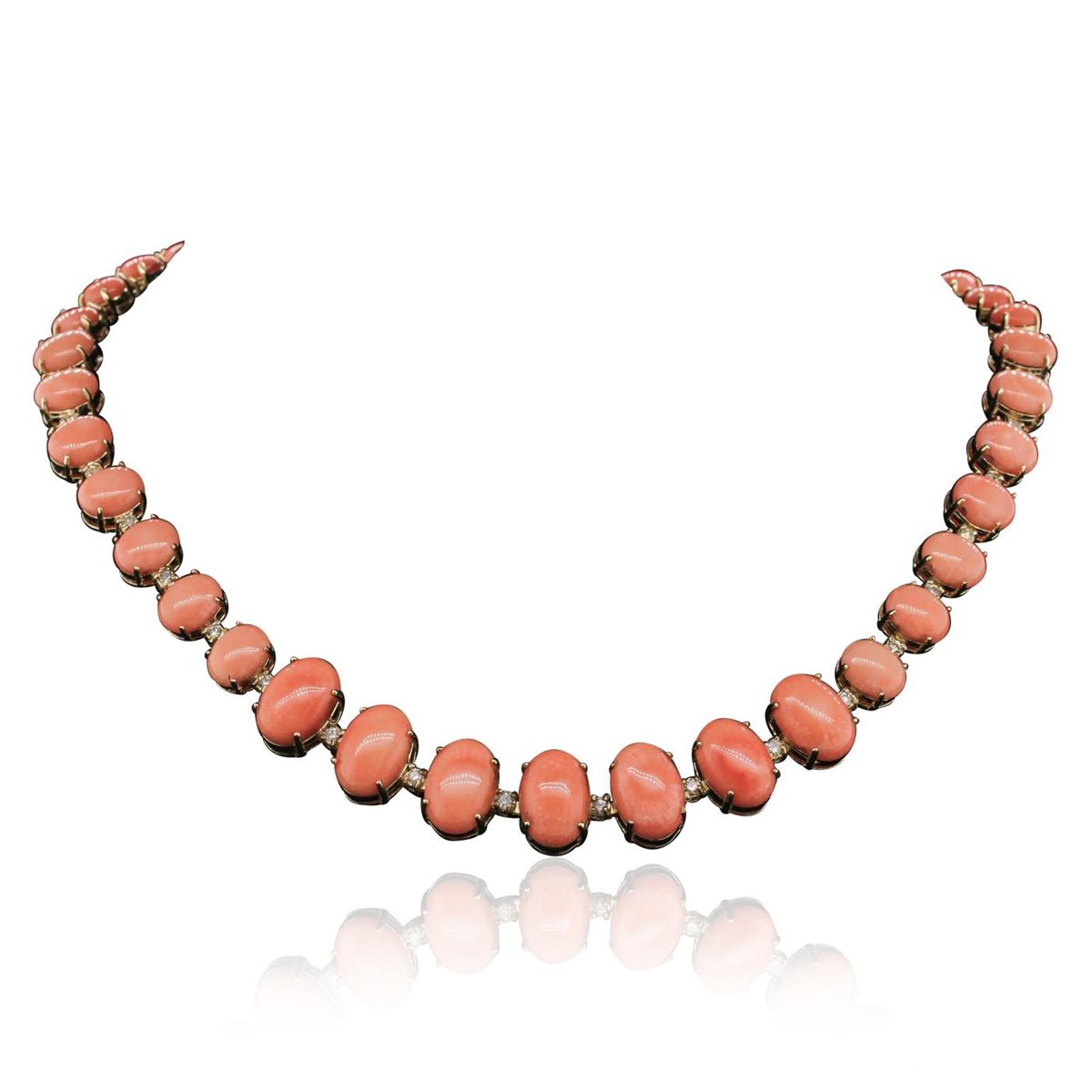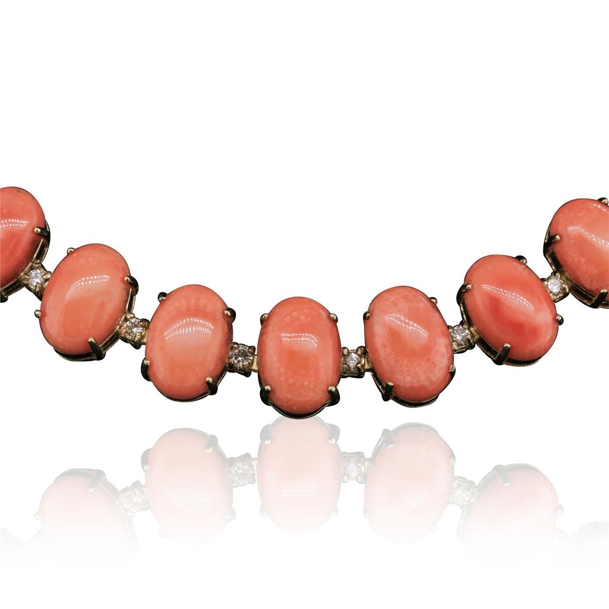 One electronically tested 14KT yellow gold ladies cast & assembled coral and diamond necklace. Condition is new, good workmanship. Eighteen inch length necklace features a flexible tapering coral and diamond ribbon, terminating in a concealed clasp with safety. Bright polish finish. Identified with markings of ""14K"". Containing: Seven prong set oval cabochon cut natural salmon corals, measuring 14.00 x 10.00 x 4.30mm, 5% bulge factor, approximate total weight of 31.74ct., clarity is severely included, medium dark, very slightly brownish, reddish orange color, (GIA rO 6/3), cut is good. Transmitting light very diffusely, opaque. Naturally occurring internal & external characteristics are present. Measurements & the color grade are an average for the group. Graded in the setting. Fourteen prong set oval cabochon cut natural salmon corals, measuring 10.00 x 7.80 x 3.40mm, 5% bulge factor, approximate total weight of 27.86ct., clarity is severely included, medium dark, very slightly brownish, reddish orange color, (GIA rO 6/3), cut is good. Transmitting light very diffusely, opaque. Naturally occurring internal & external characteristics are present. Measurements & the color grade are an average for the group. Graded in the setting. Twenty-two prong set oval cabochon cut natural salmon corals, measuring 7.80 x 5.90 x 2.50mm, 5% bulge factor, approximate total weight of 18.92ct., clarity is severely included, medium dark, very slightly brownish, reddish orange color, (GIA rO 6/3), cut is good. Transmitting light very diffusely, opaque. Naturally occurring internal & external characteristics are present. Measurements & the color grade are an average for the group. Graded in the setting. Salmon Coral is formed undersea by microscopic animals called coral polyps. These tiny, creatures form minute, hard shells. As a colony grows, it takes on complex branching, tree-like forms which allows the maximum number of polyps to be fed by the nutrients in the water. It grows about one quarter inch per year. This color of coral is commonly treated to improve or change the color and stability. Evidence that may confirm this is typically lacking. Forty-Two prong set round brilliant cut diamonds, measuring 2.50 - 2.40 x 1.47mm (depth est.) approximate total weight of 42 Stones = 2.37ct. Graded in the setting. Clarity SI-2 to I-2 Color G - I Total Weight of Colored Stones 78.52 ct. Total Weight of Diamonds 2.37 ct. Total Weight of Necklace 64.07 grams AIG Appraised at $37,915.00.