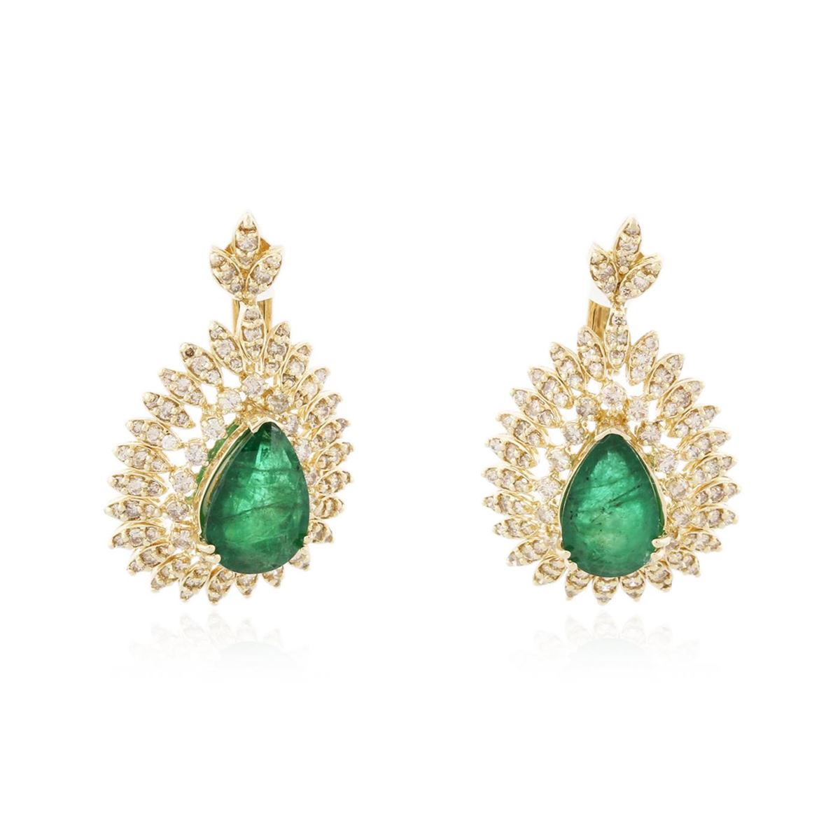 One pair electronically tested 14KT yellow gold ladies cast & assembled emerald and diamond earrings with omega backs. Condition is new, good workmanship. Bright polish finish. Identified with markings of "14K". Containing: Two prong set pear mixed cut natural emeralds, measuring 14.70 x 9.00 x 5.85mm, approximate total weight of 8.07ct., clarity is heavily included, type III, medium dark, moderately strong, very slightly bluish green color, (GIA vslbG 6/4), cut is good. Transmitting light with a minimum of distortion, transparent to translucent. Naturally occurring internal & external characteristics are present. Indications of oil residue. Measurements & the color grade are an average for the pair. Graded in the setting. Two hundred six prong set round brilliant cut diamonds, measuring 2.00 - 1.30 x 0.99mm (depth est.) approximate total weight of 206 Stones = 3.98ct. Faint secondary color throughout. Graded in the setting. Clarity SI-1 to I-1. Color K - M. Total Weight of Colored Stones 8.07ct. Total Weight of Diamonds 3.98ct. Total Weight of Earrings 18.50gm. AIG Appraised at $26,565.00.