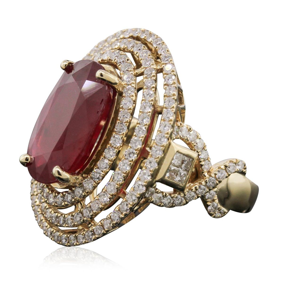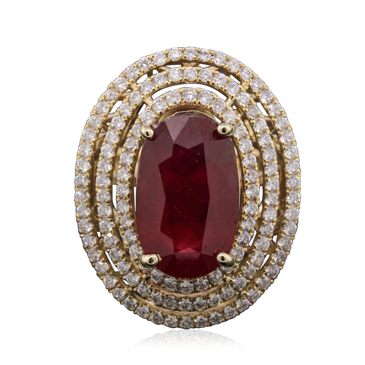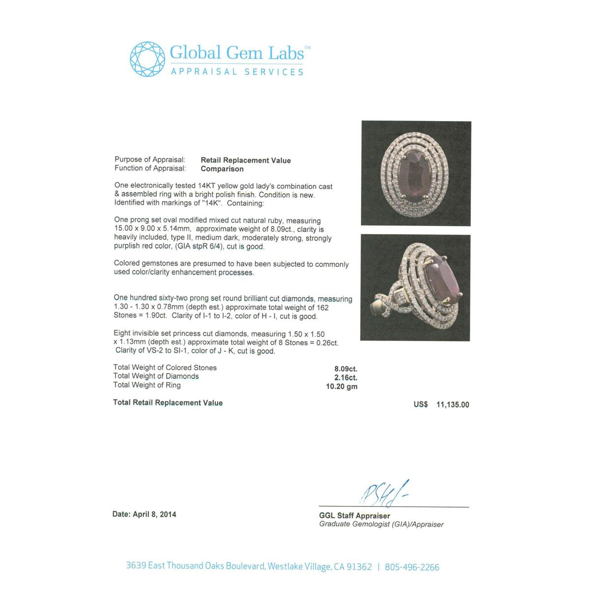 One electronically tested 14KT yellow gold Ladies combination cast & assembled ring with a bright polish finish. Condition is new. Identified with markings of "14K". Containing: One prong set oval modified mixed cut natural ruby, measuring 15.00 x 9.00 x 5.14mm, approximate weight of 8.09ct., clarity is heavily included, type II, medium dark, moderately strong, strongly purplish red color, (GIA stpR 6/4), cut is good. Colored gemstones are presumed to have been subjected to commonly used color/clarity enhancement processes. One Hundred Sixty-Two prong set round brilliant cut diamonds, measuring 1.30 - 1.30 x 0.78mm (depth est.) approximate. Total Weight of 162 Stones = 1.90ct. Clarity: I-1 to I-2. Color: H - I, Cut is Good. Eight invisible set princess cut diamonds, measuring 1.50 x 1.50 x 1.13mm (depth est.) approximate. Total Weight of 8 Stones = 0.26ct. Clarity: VS-2 to SI-1. Color: J - K, Cut is Good. Total Weight of Colored Stones 8.09ct. Total Weight of Diamonds 2.16ct. Total Weight of Ring 10.20 grams. GGL Appraised at $11,135.00.