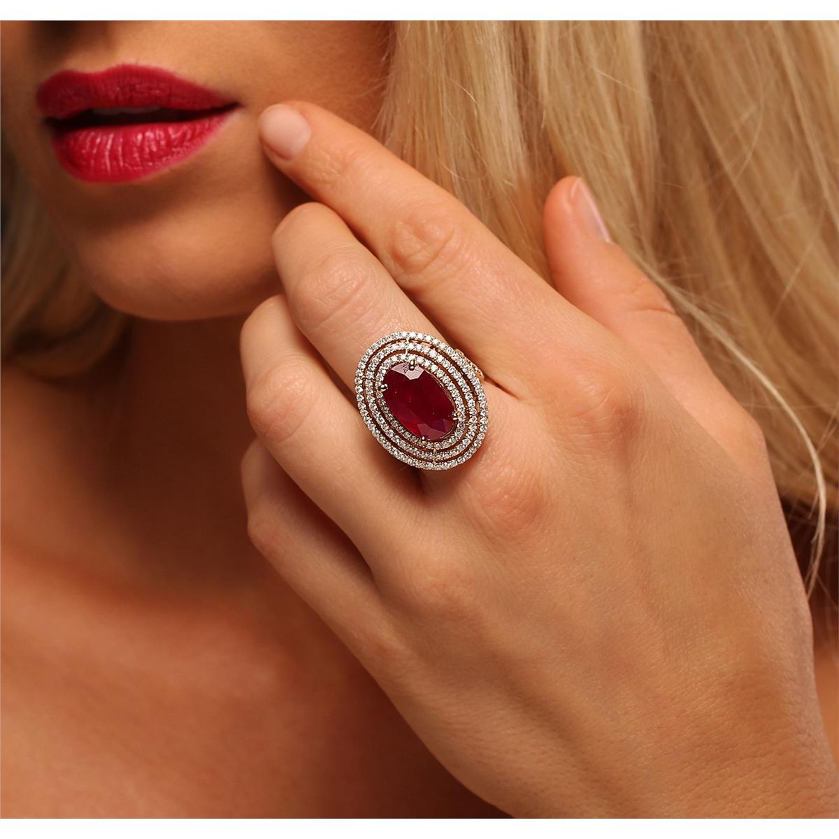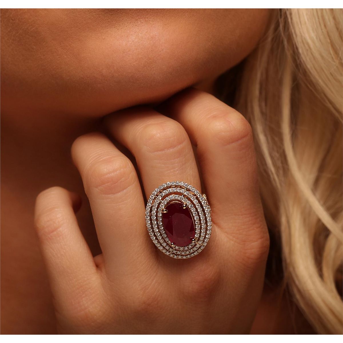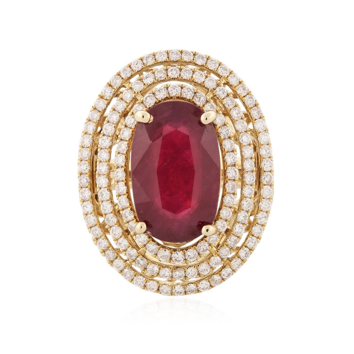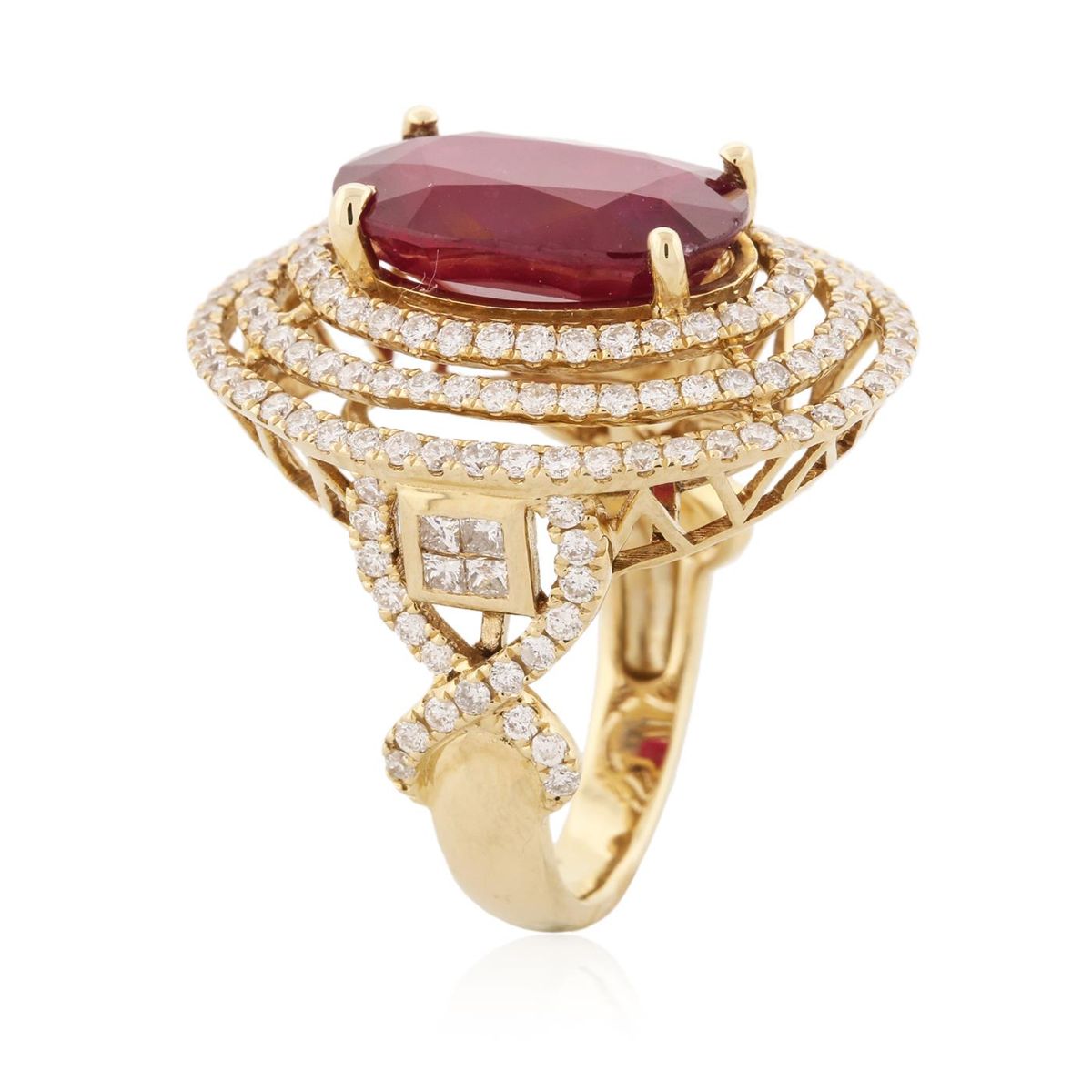 One electronically tested 14KT yellow gold Ladies combination cast & assembled ring with a bright polish finish. Condition is new. Identified with markings of "14K". Containing: One prong set oval modified mixed cut natural ruby, measuring 15.00 x 9.00 x 5.14mm, approximate weight of 8.09ct., clarity is heavily included, type II, medium dark, moderately strong, strongly purplish red color, (GIA stpR 6/4), cut is good. Colored gemstones are presumed to have been subjected to commonly used color/clarity enhancement processes. One Hundred Sixty-Two prong set round brilliant cut diamonds, measuring 1.30 - 1.30 x 0.78mm (depth est.) approximate. Total Weight of 162 Stones = 1.90ct. Clarity: I-1 to I-2. Color: H - I, Cut is Good. Eight invisible set princess cut diamonds, measuring 1.50 x 1.50 x 1.13mm (depth est.) approximate. Total Weight of 8 Stones = 0.26ct. Clarity: VS-2 to SI-1. Color: J - K, Cut is Good. Total Weight of Colored Stones 8.09ct. Total Weight of Diamonds 2.16ct. Total Weight of Ring 10.20 grams. GGL Appraised at $11,135.00.