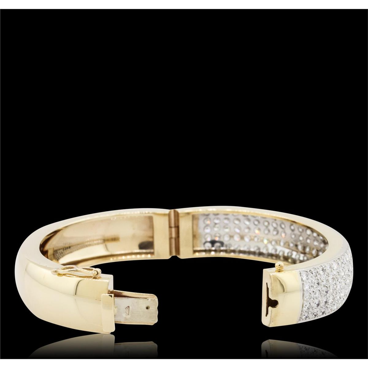 One electronically tested 14KT yellow gold ladies cast & assembled diamond bangle bracelet. Six and one-half inch wearable length bangle bracelet features a diamond encrusted curvature supported by a hinged shoulder, completed by a concealed clasp with safety. Bright polish finish with rhodium accents. Identified with markings of "14K". Condition is new, good workmanship. Containing: One Hundred Sixty pave set round brilliant cut diamonds, measuring 2.50 - 2.30 x 1.44mm (depth est.) approximate total weight of 160 Stones = 8.20ct. Graded in the setting. Clarity: VS-2 to SI-2. Color: H - J. Total Weight of Diamonds 8.20ct. Total Weight of Bangle Bracelet 48.27 grams. AIG Appraised at $35,835.00.